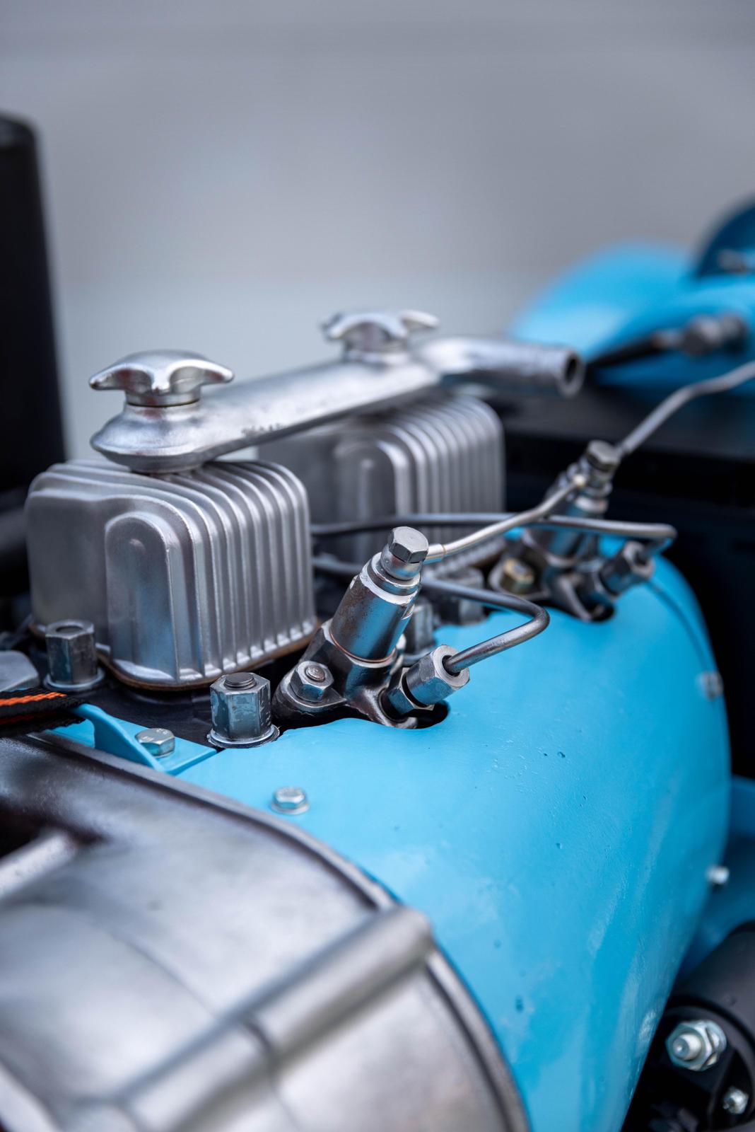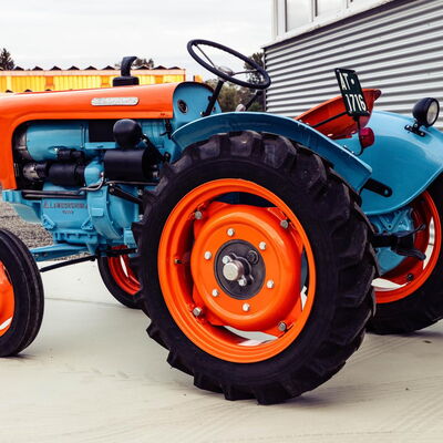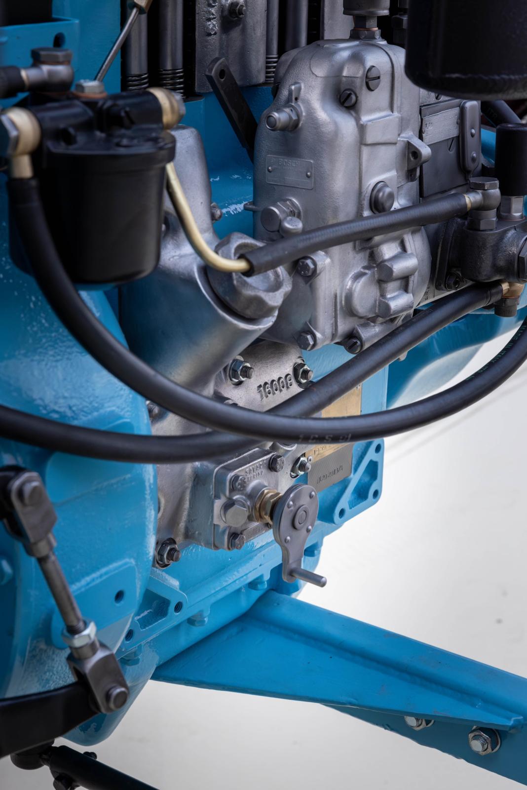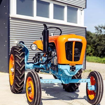 Was hier glänzt, ist Substanz. Das historische Azzurro (Azurblau) mit Arancio (Orange) ist kein Styling, sondern eine Hommage an die Werksfarben der Traktoren – präzise abgemischt, auf eine Technik gelegt, die wir Schraube für Schraube neu aufgebaut haben. Jeder Radius, jede Fase, jede Schelle folgt einer Logik: Vollzerlegung, Maßhaltigkeit, Funktionssicherheit.
