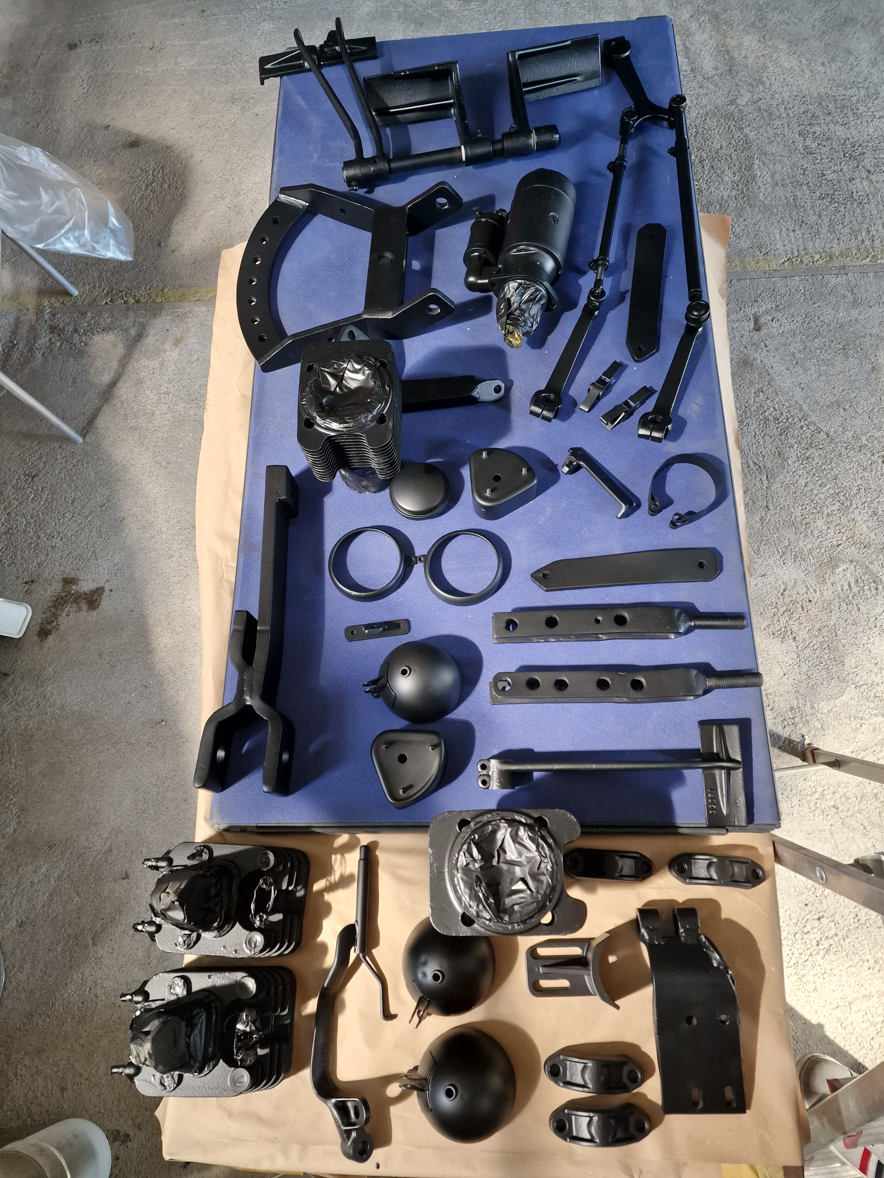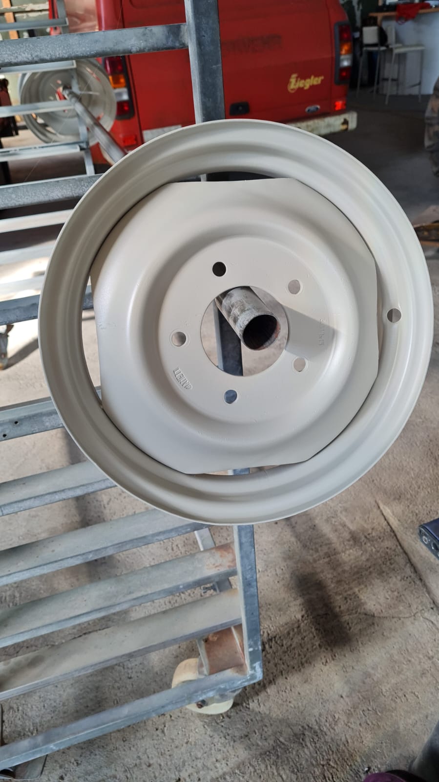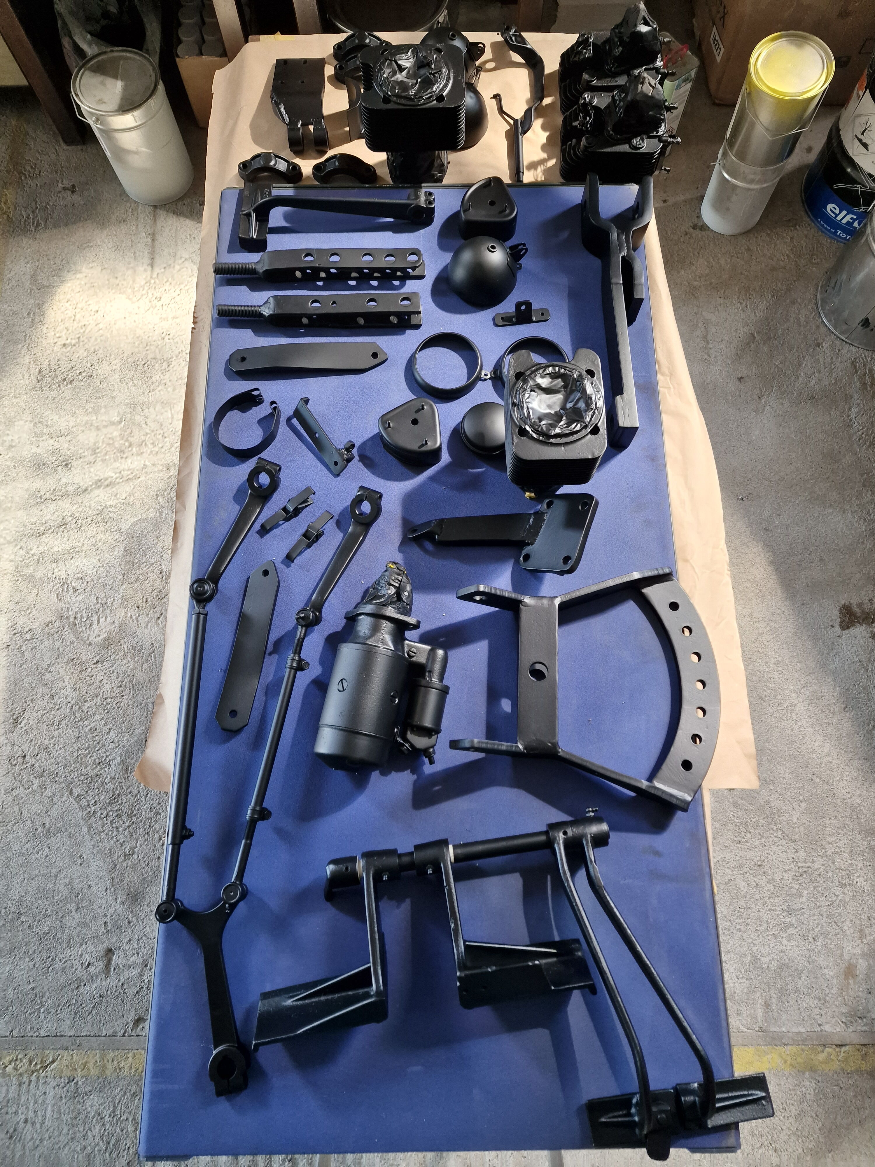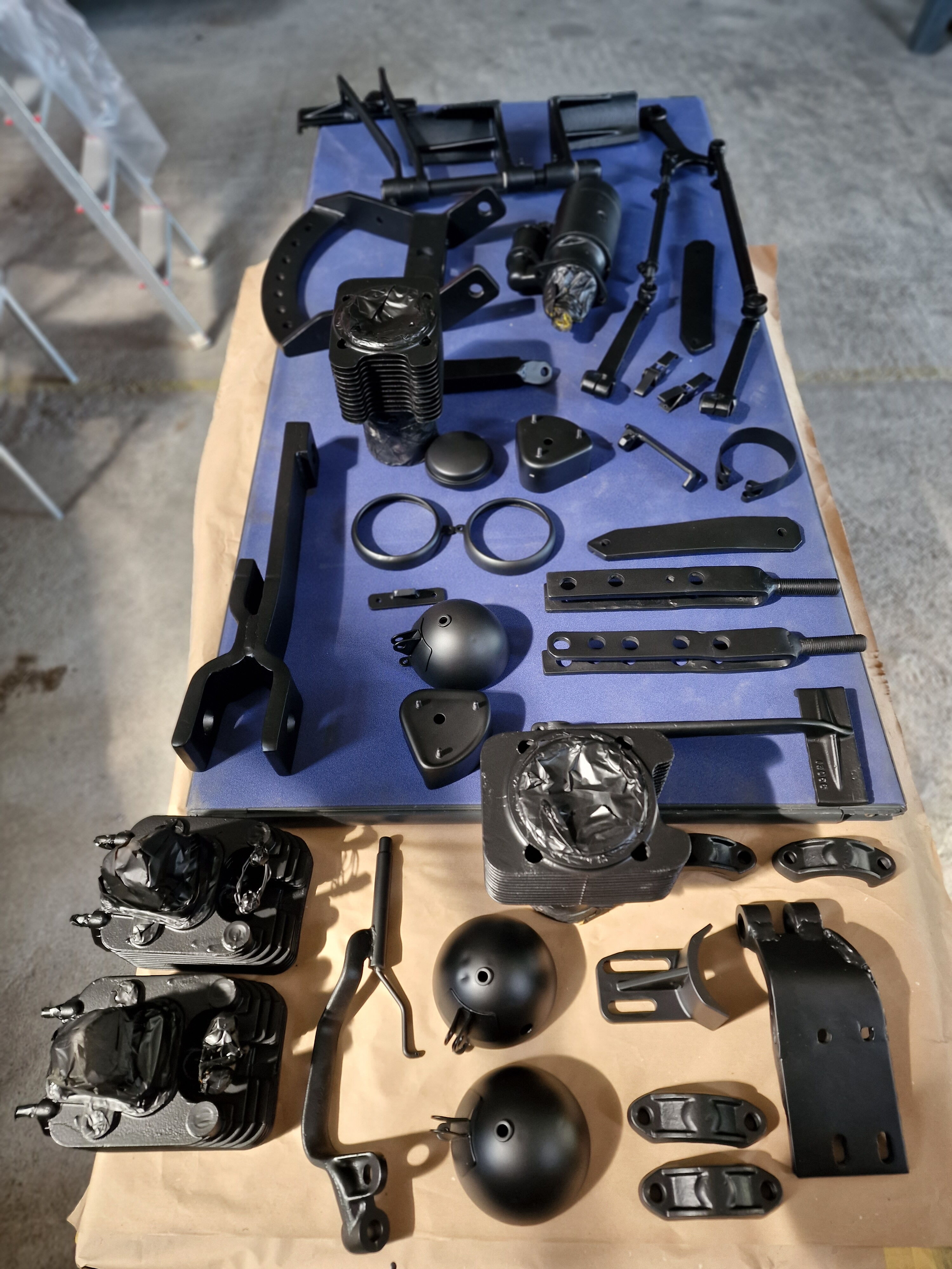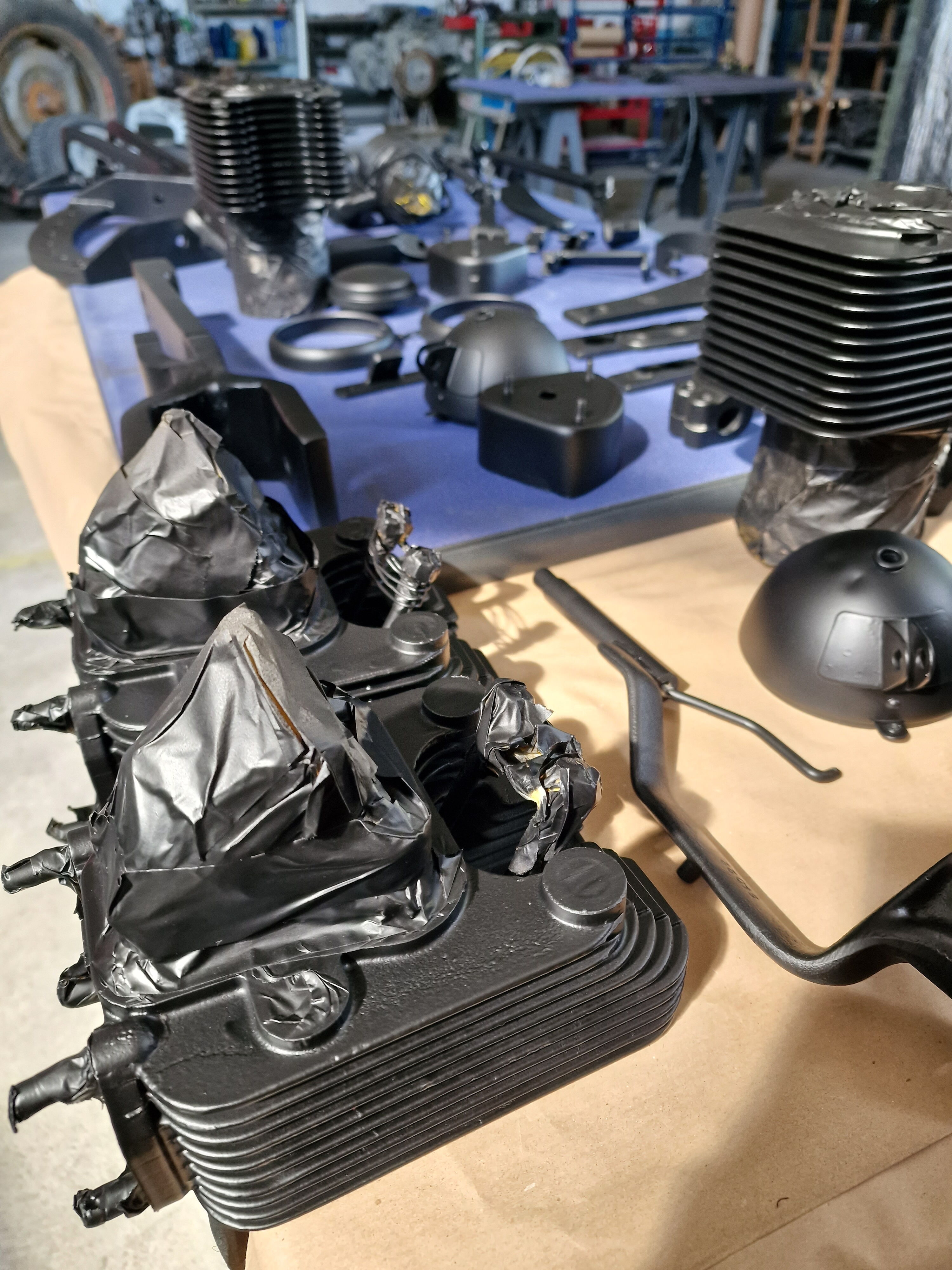 Professionelle Pulverbeschichtung vieler Bauteile; bewegliche Komponenten überwiegend schwarz pulverbeschichtet. Felgen mit Hochglanz-Pulverbeschichtung (Show-Quality-Finish). Sichtteile in periodenkorrekten Farbtönen lackiert. Umfassender Korrosionsschutz innen/außen.