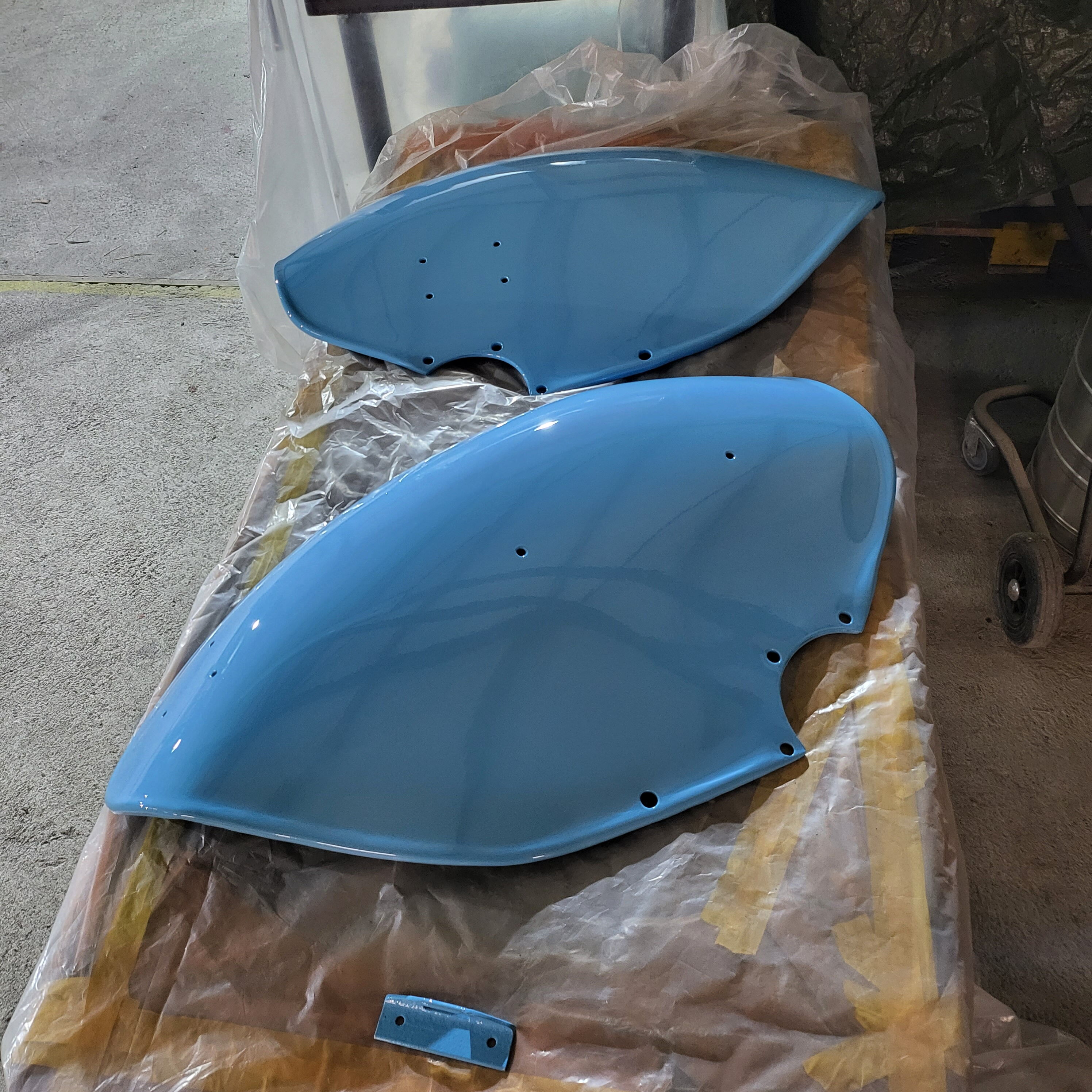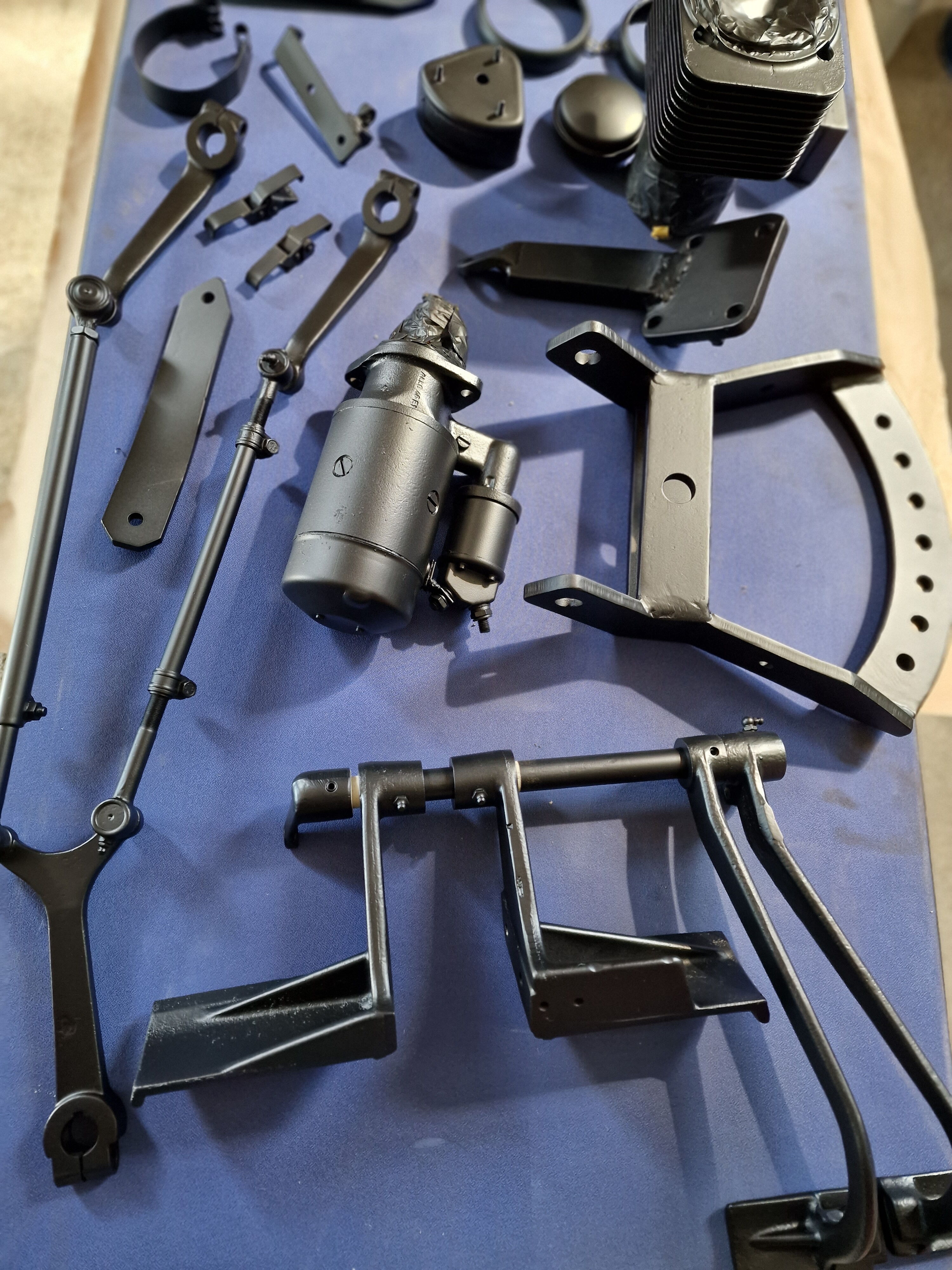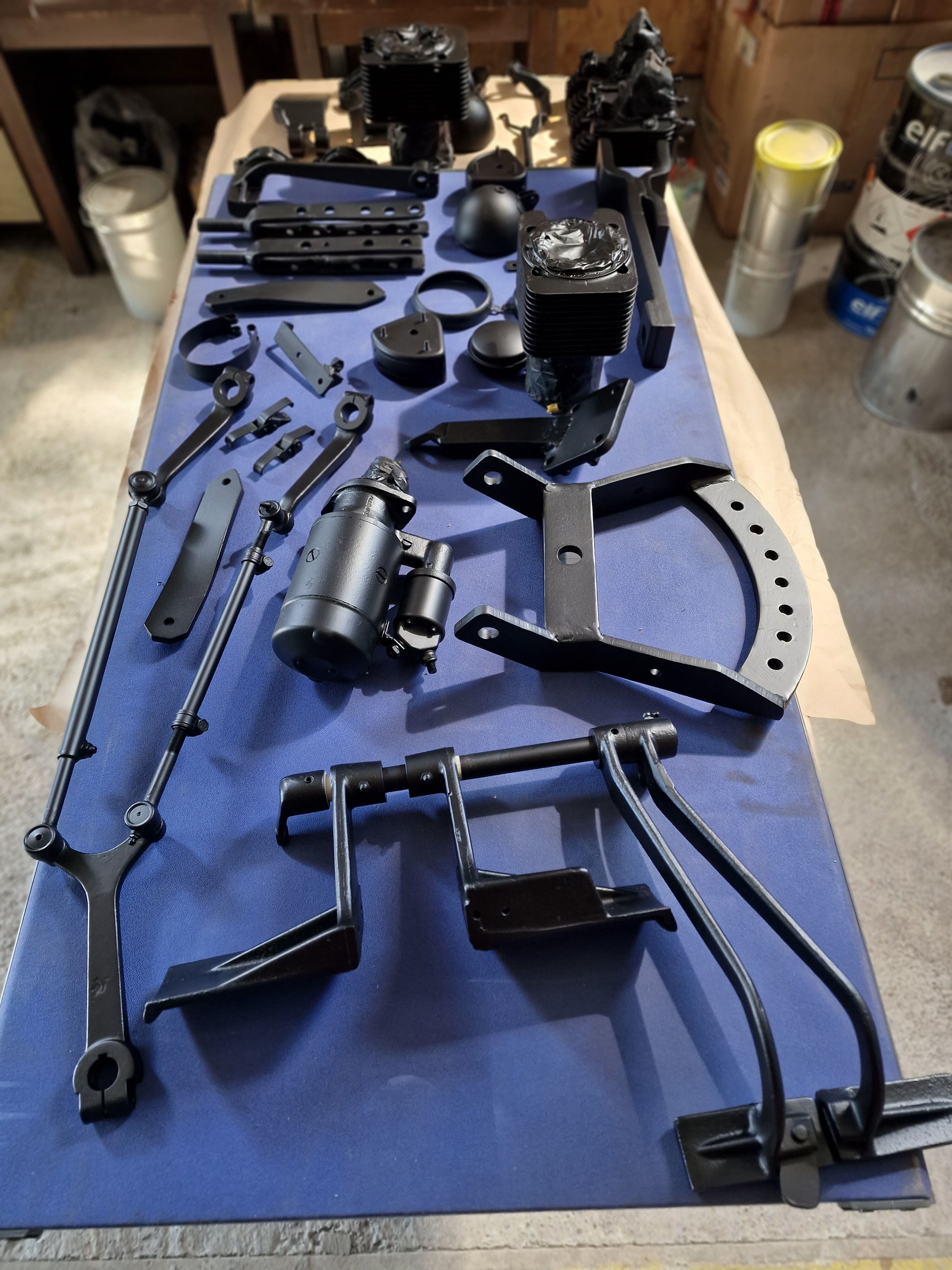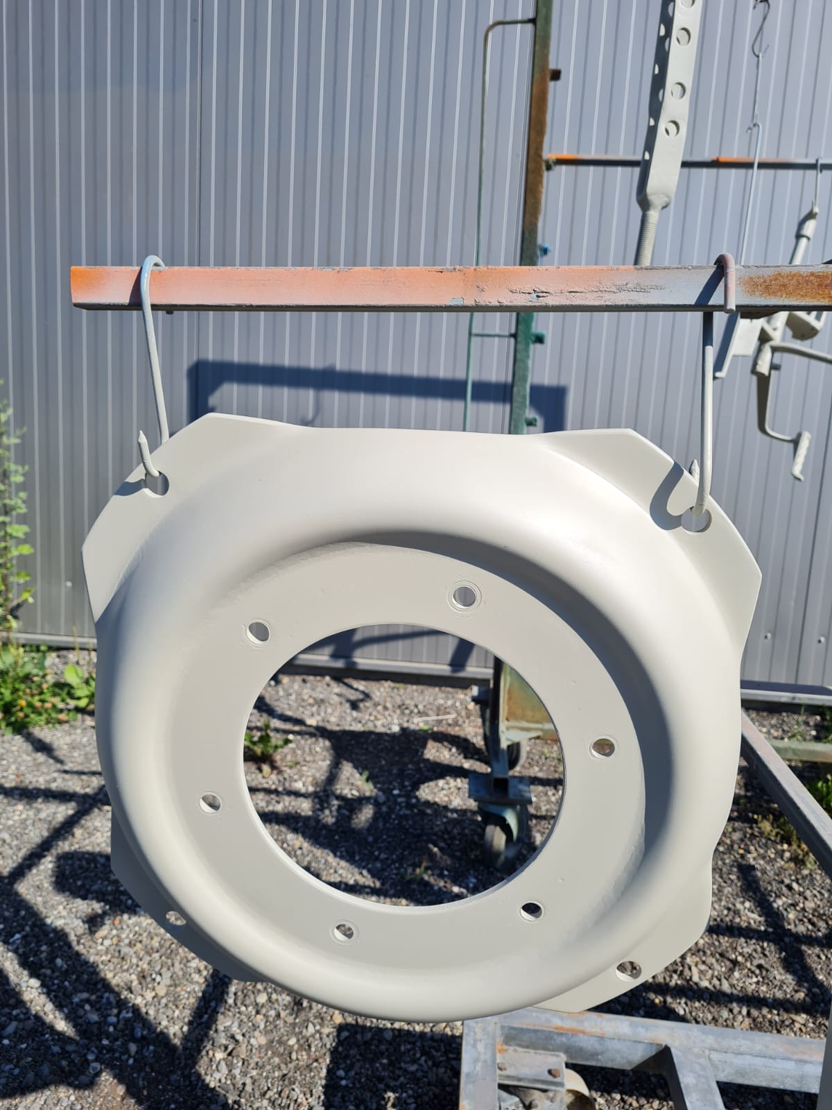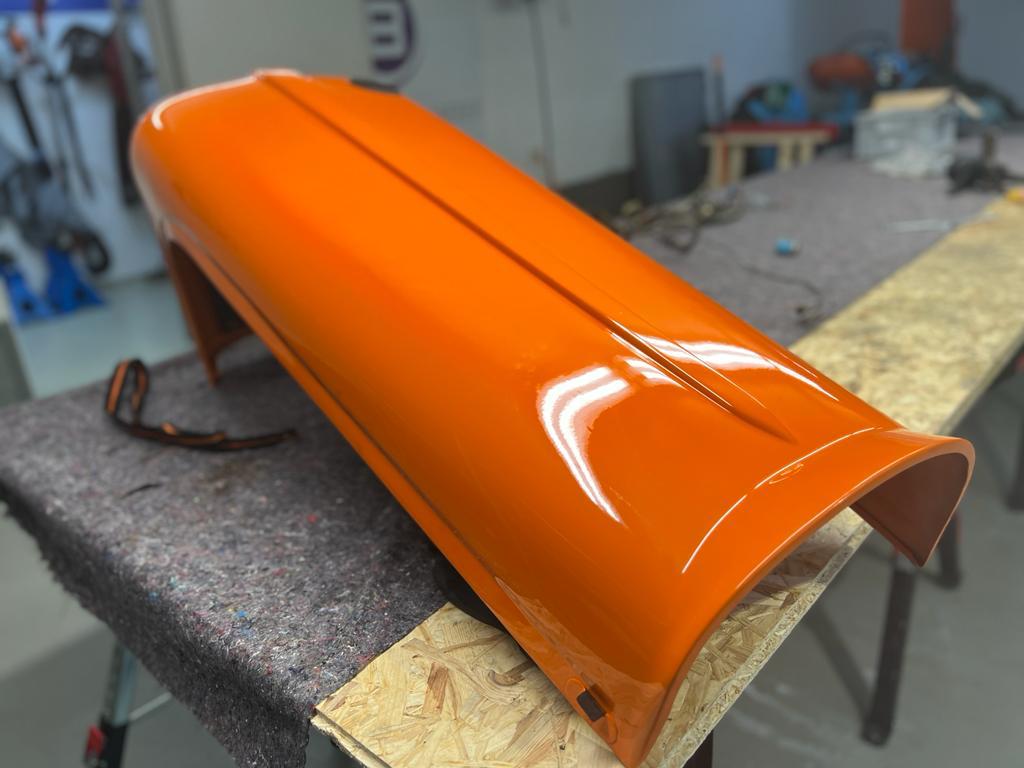 Professionelle Pulverbeschichtung vieler Bauteile; bewegliche Komponenten überwiegend schwarz pulverbeschichtet. Felgen mit Hochglanz-Pulverbeschichtung (Show-Quality-Finish). Sichtteile in periodenkorrekten Farbtönen lackiert. Umfassender Korrosionsschutz innen/außen.