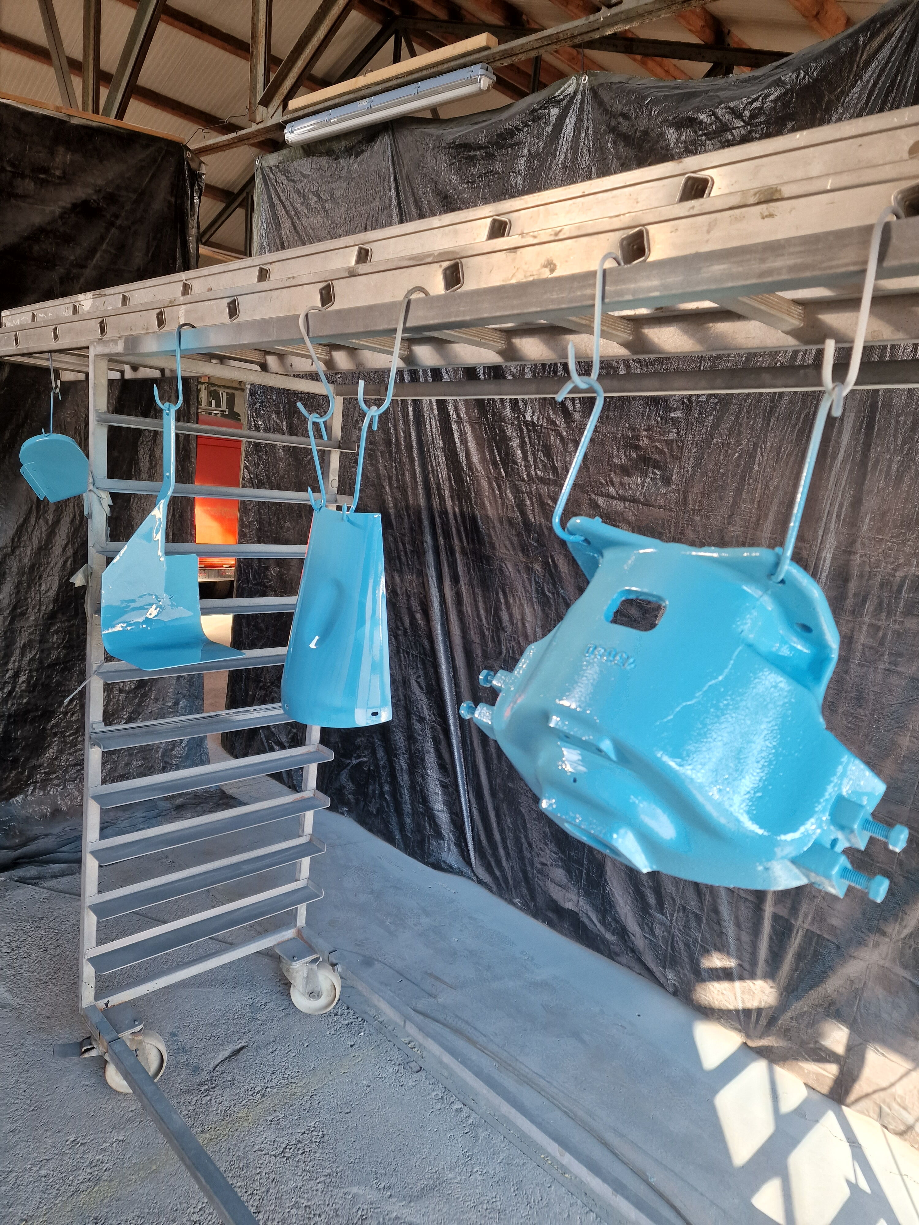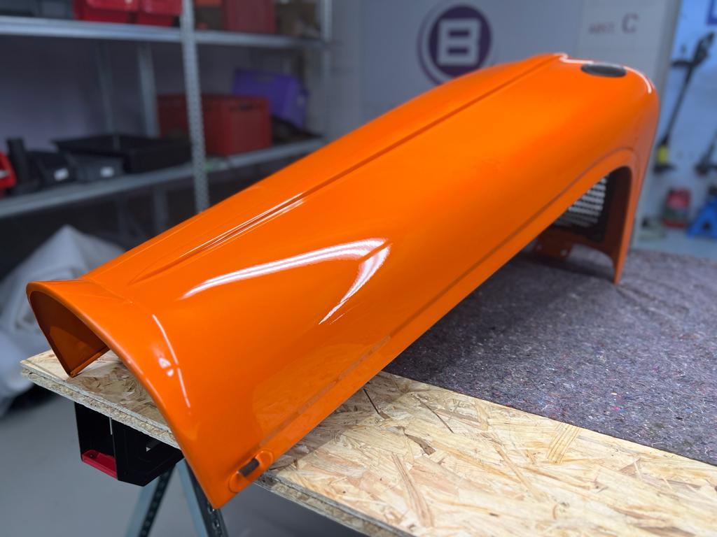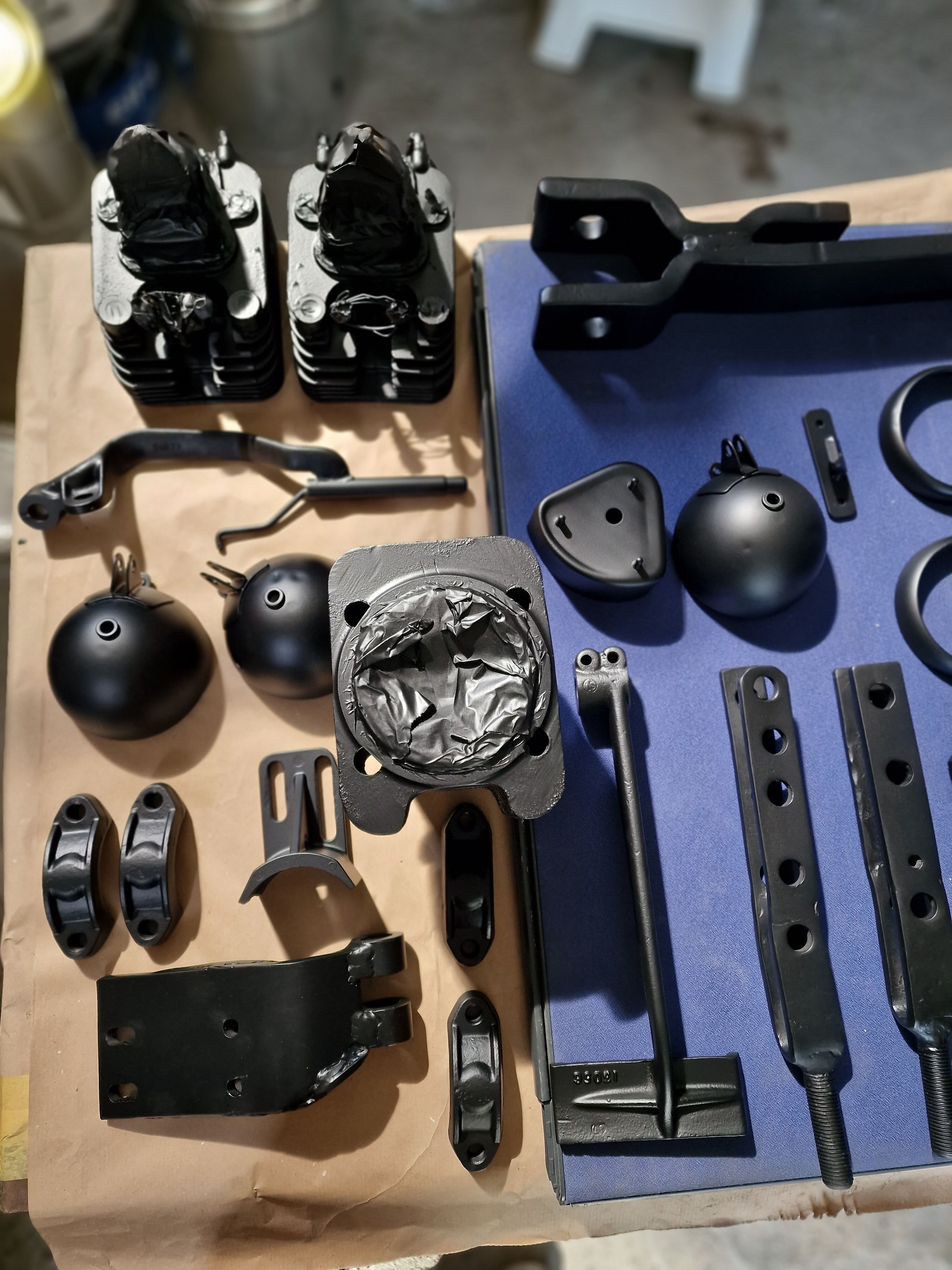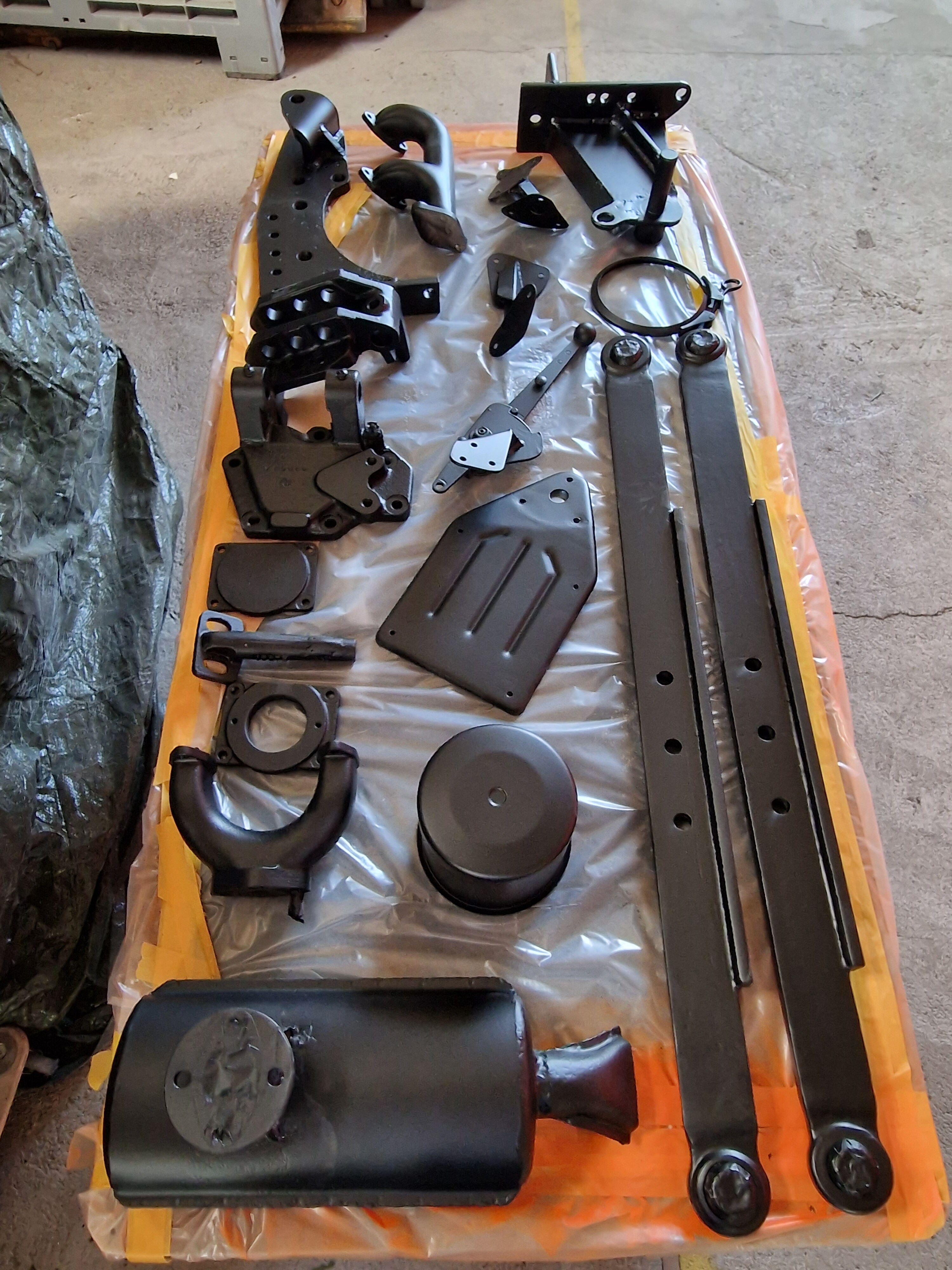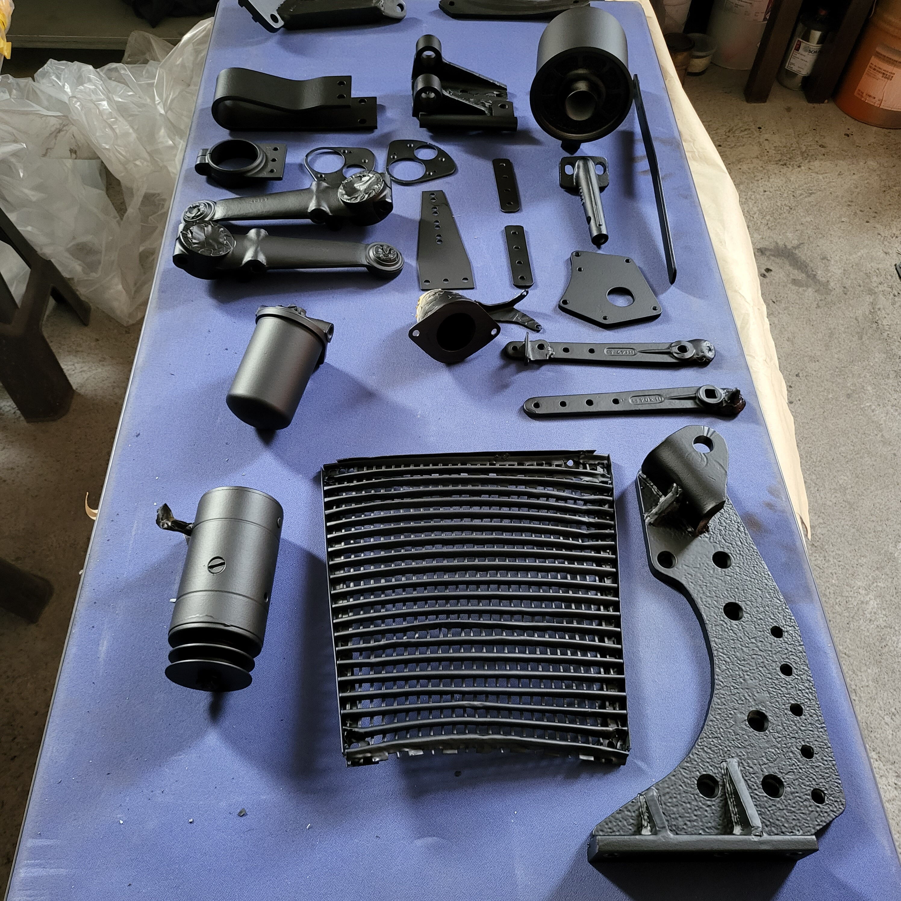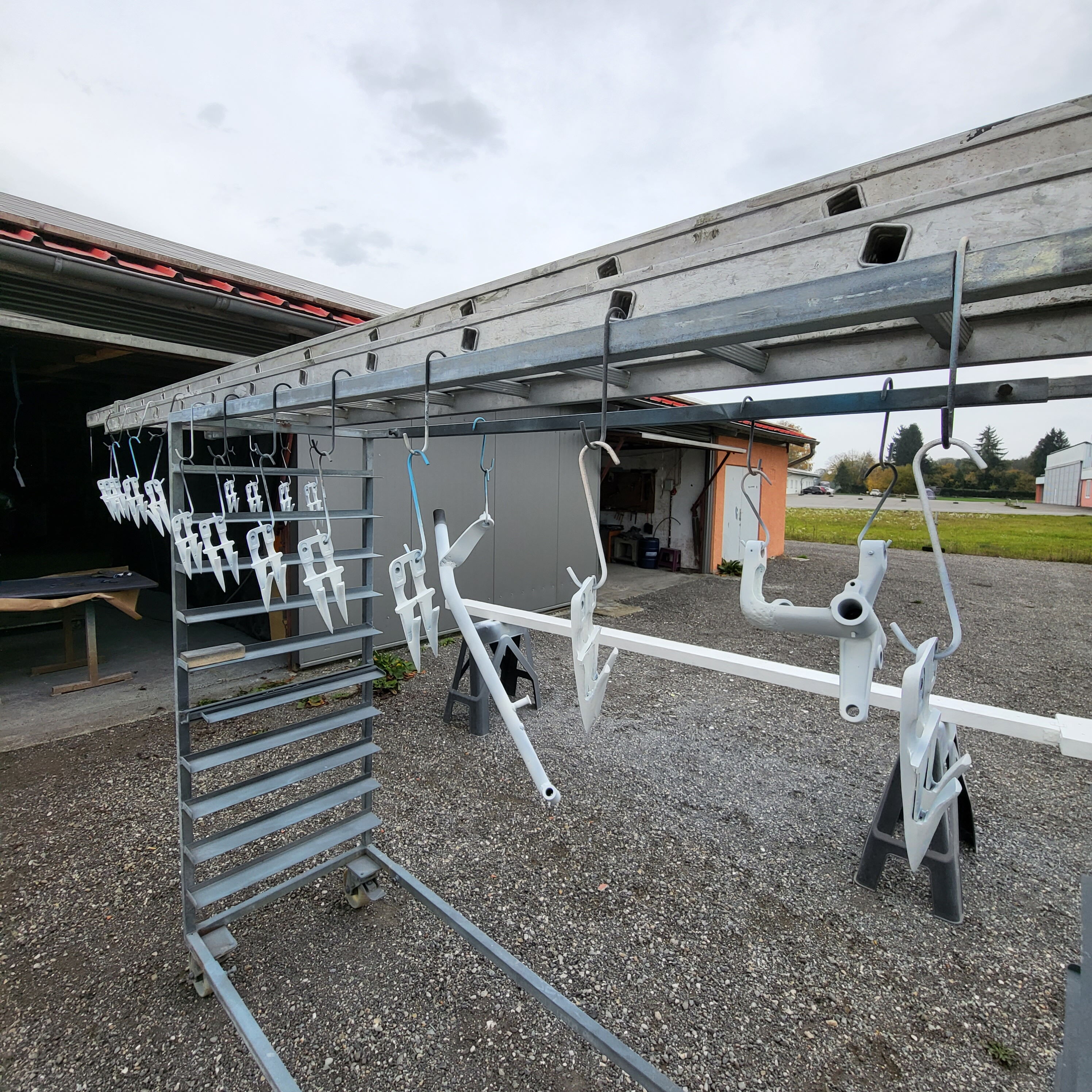 Professionelle Pulverbeschichtung vieler Bauteile; bewegliche Komponenten überwiegend schwarz pulverbeschichtet. Felgen mit Hochglanz-Pulverbeschichtung (Show-Quality-Finish). Sichtteile in periodenkorrekten Farbtönen lackiert. Umfassender Korrosionsschutz innen/außen.