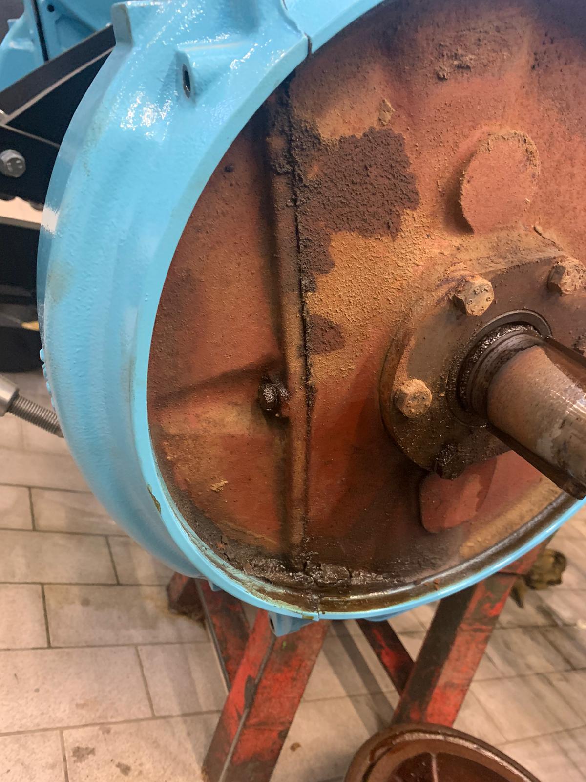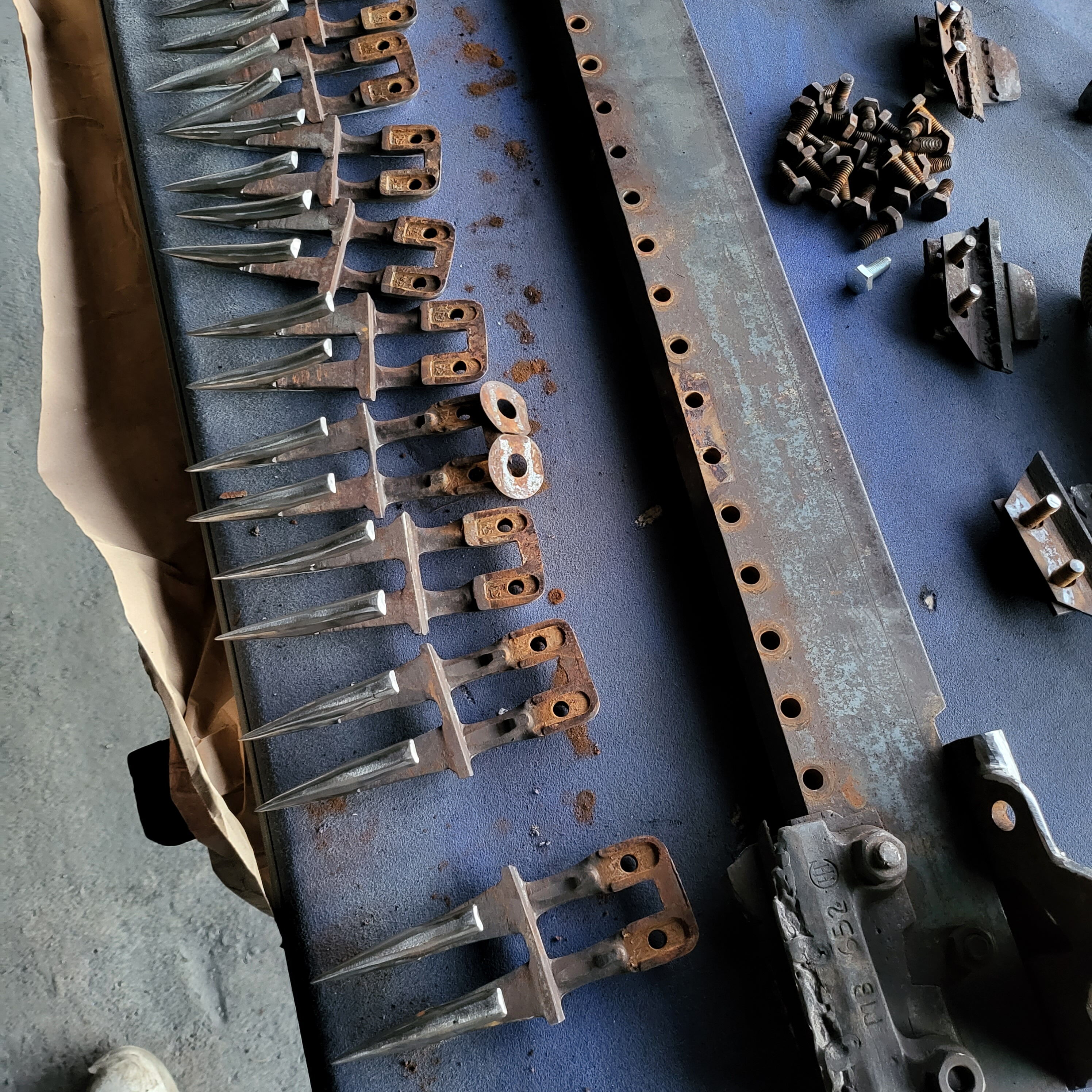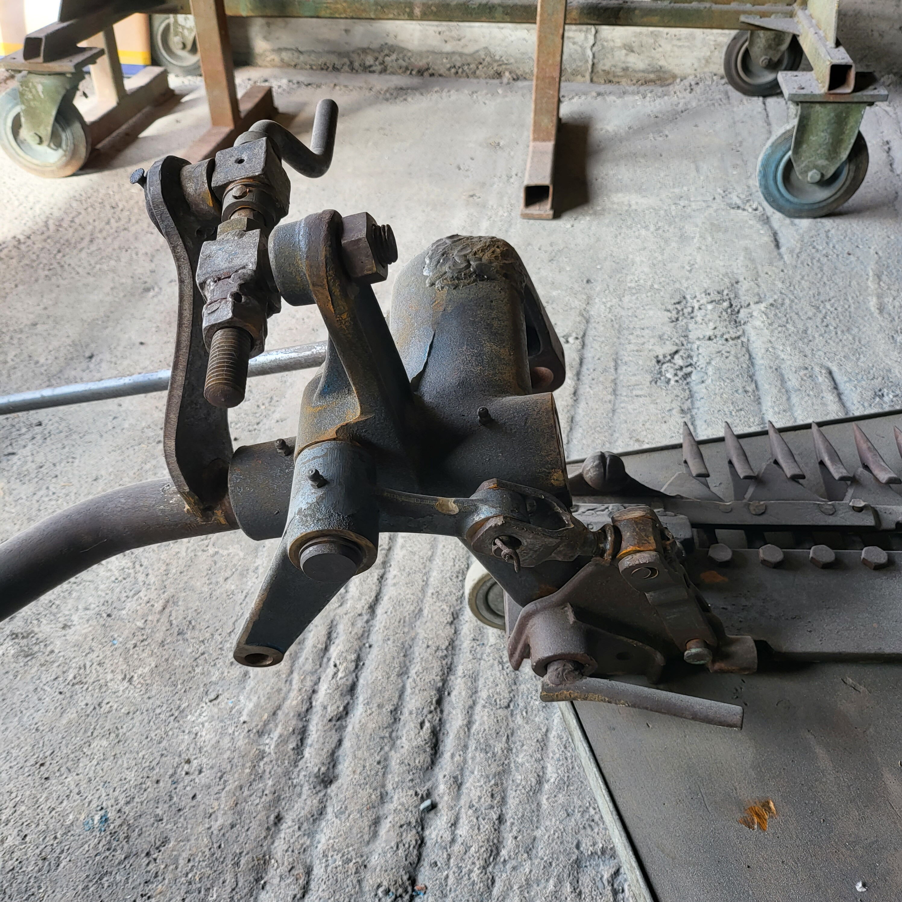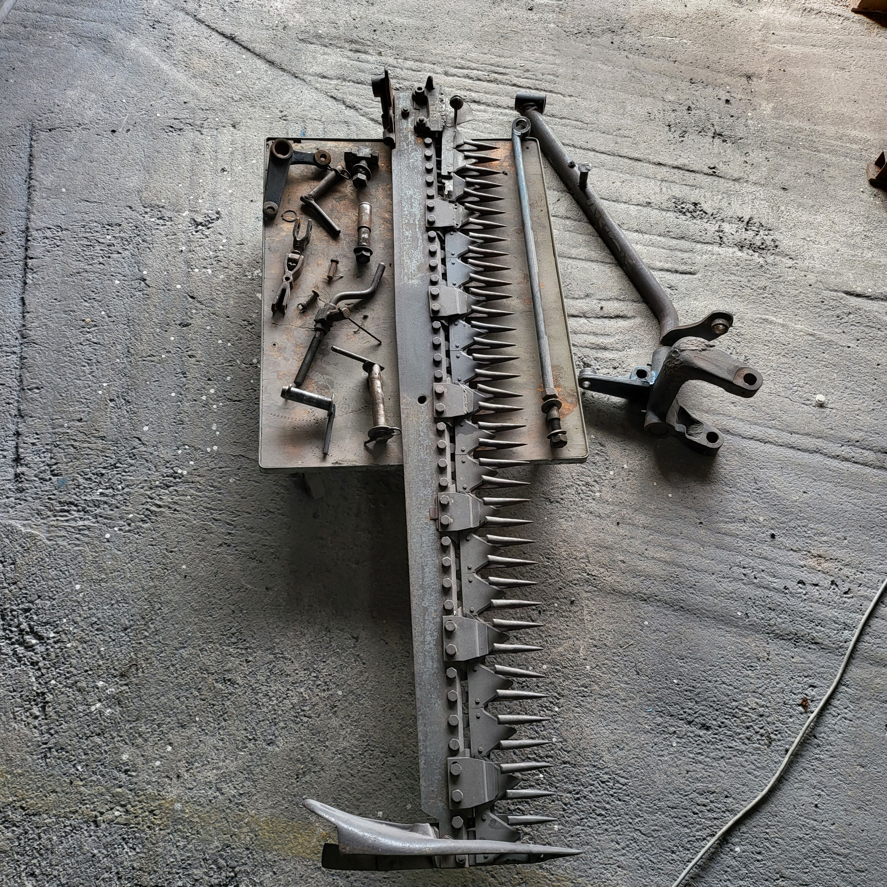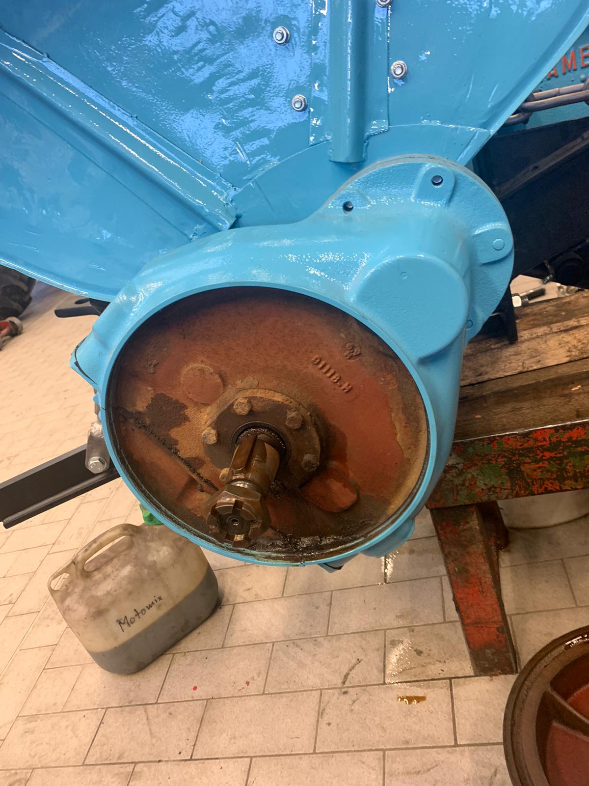 Fotodokumentation des unrestaurierten Zustands vom 22.12.2021: authentische Nutzungsspuren, Korrosionszonen, aber vollständige Hauptbaugruppen inkl. Mähbalken-Peripherie. Der Erstzustand definierte, was erhalten, aufgearbeitet oder ersetzt wird. Gealterte Leitungen/Dichtflächen wurden erfasst; Transparenz als Werttreiber für jede folgende Entscheidung.
