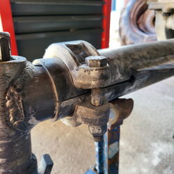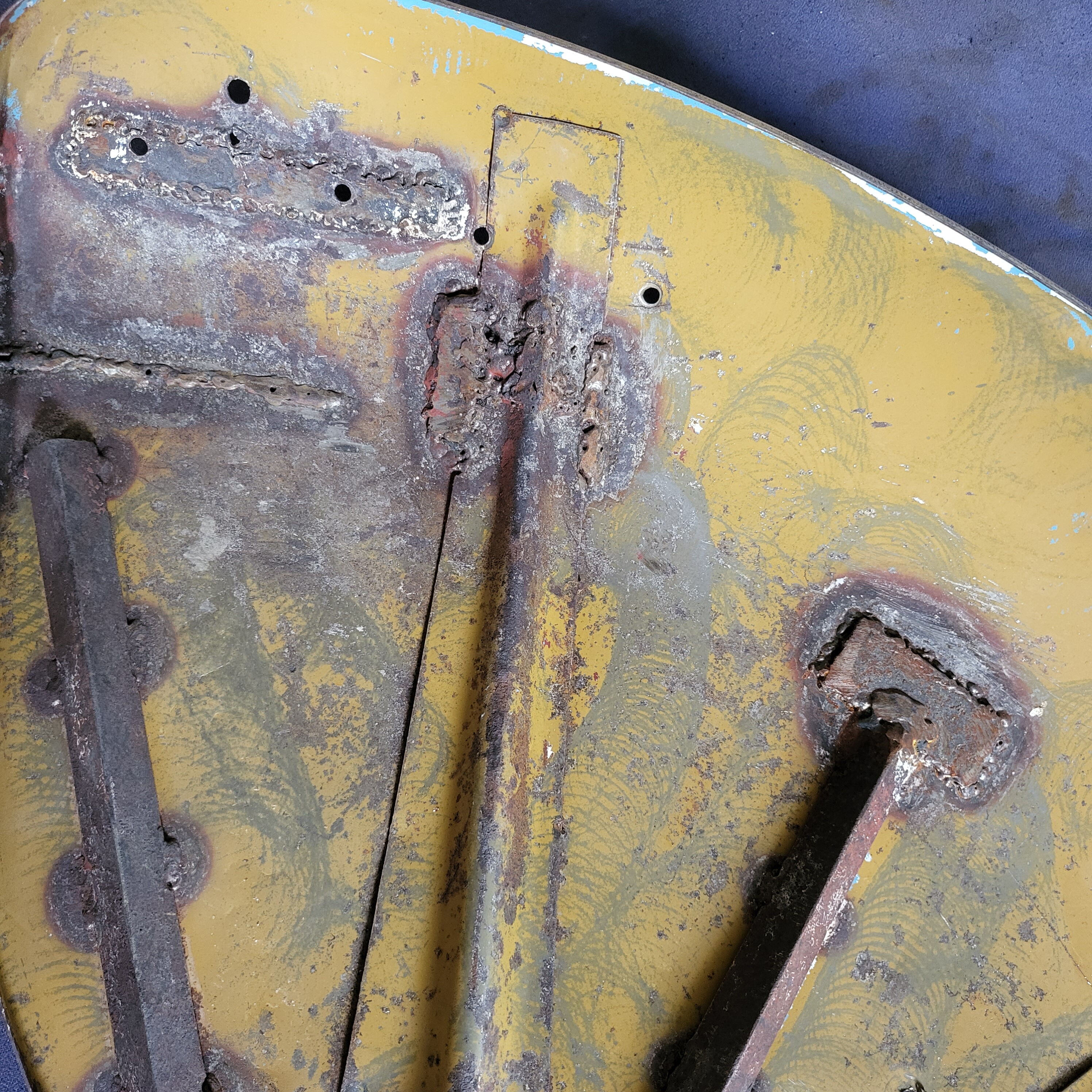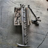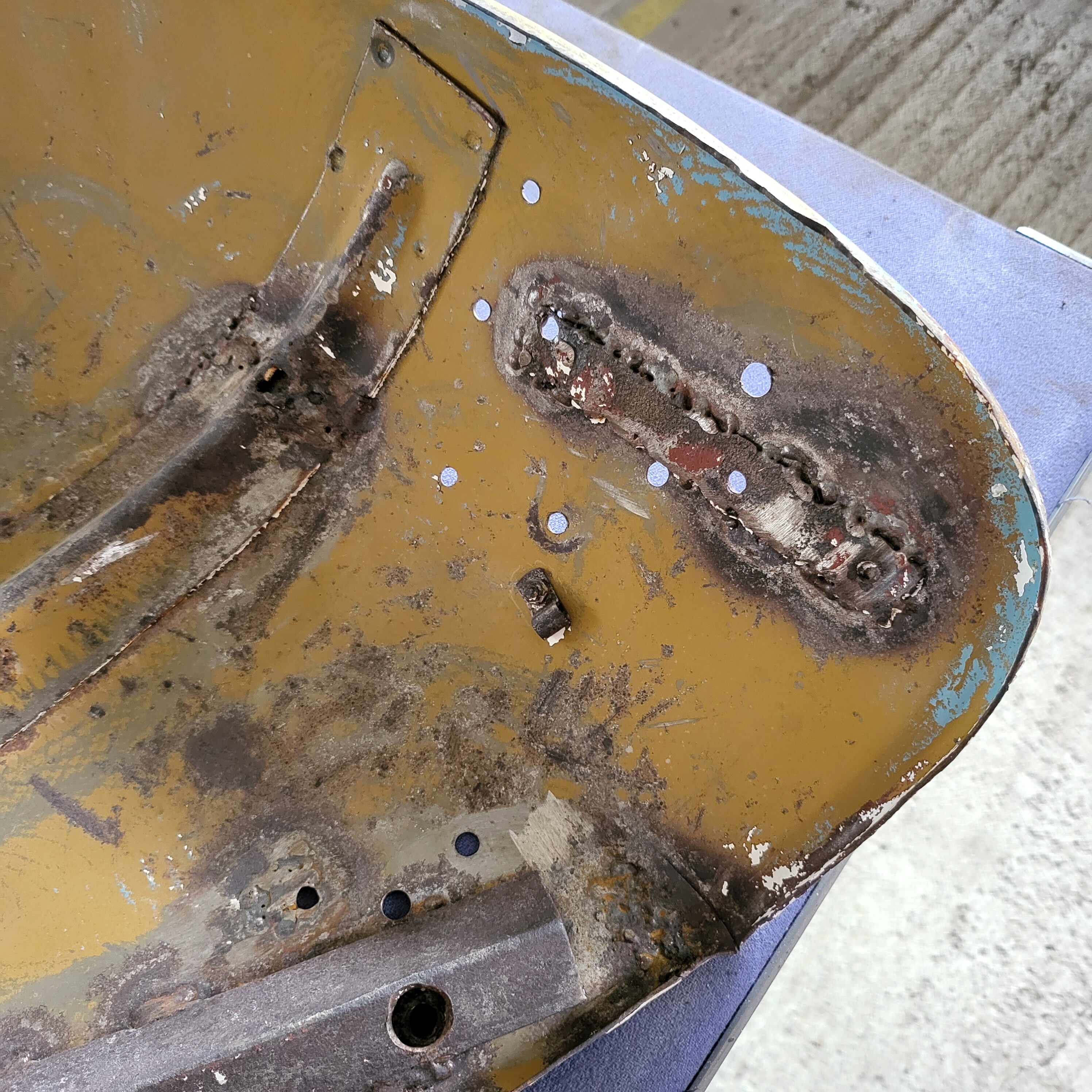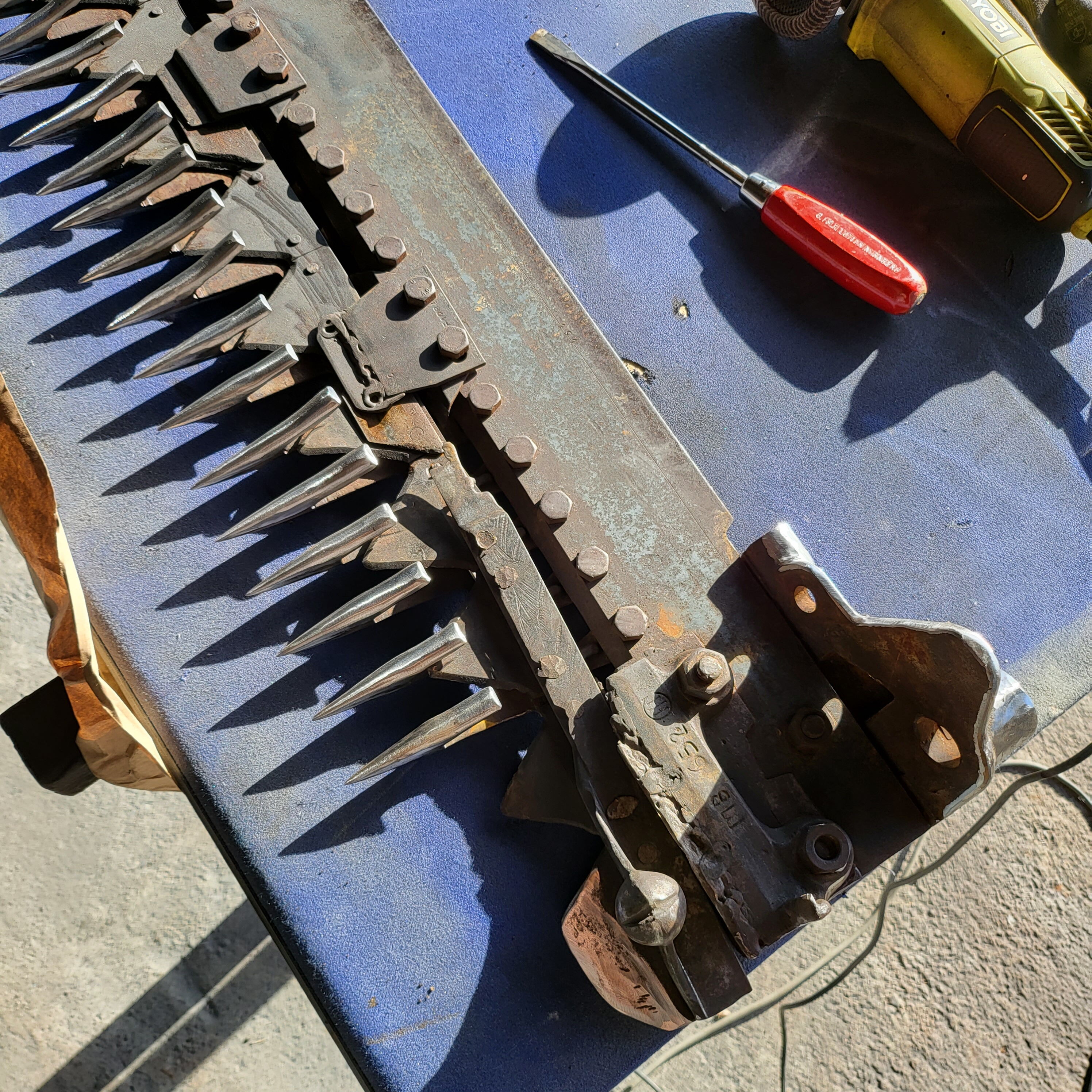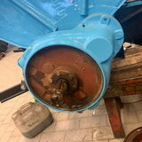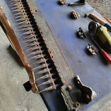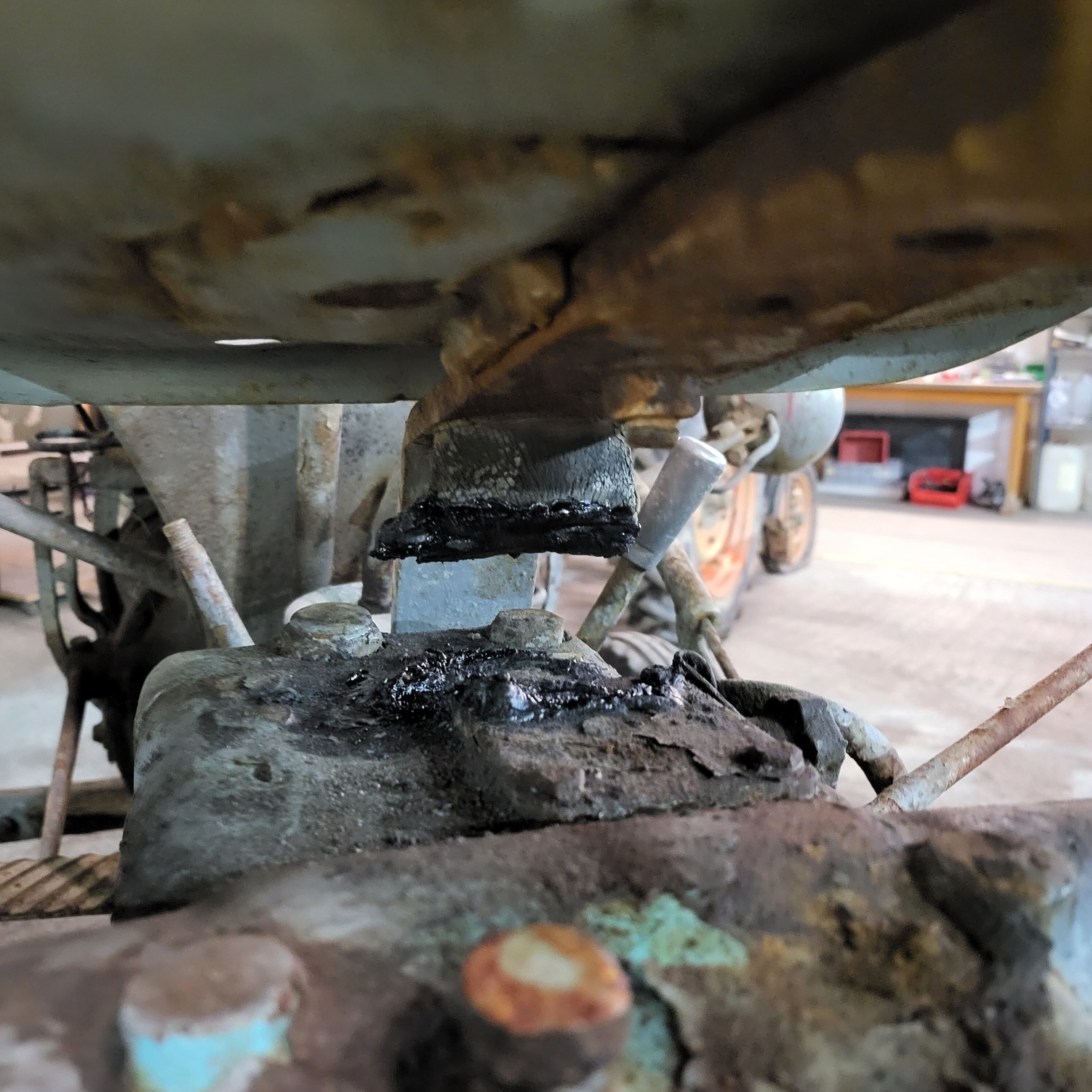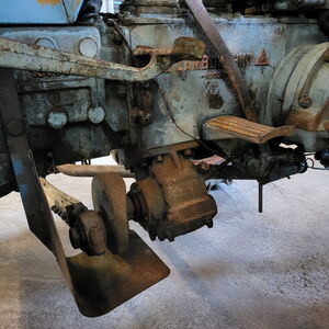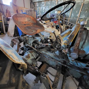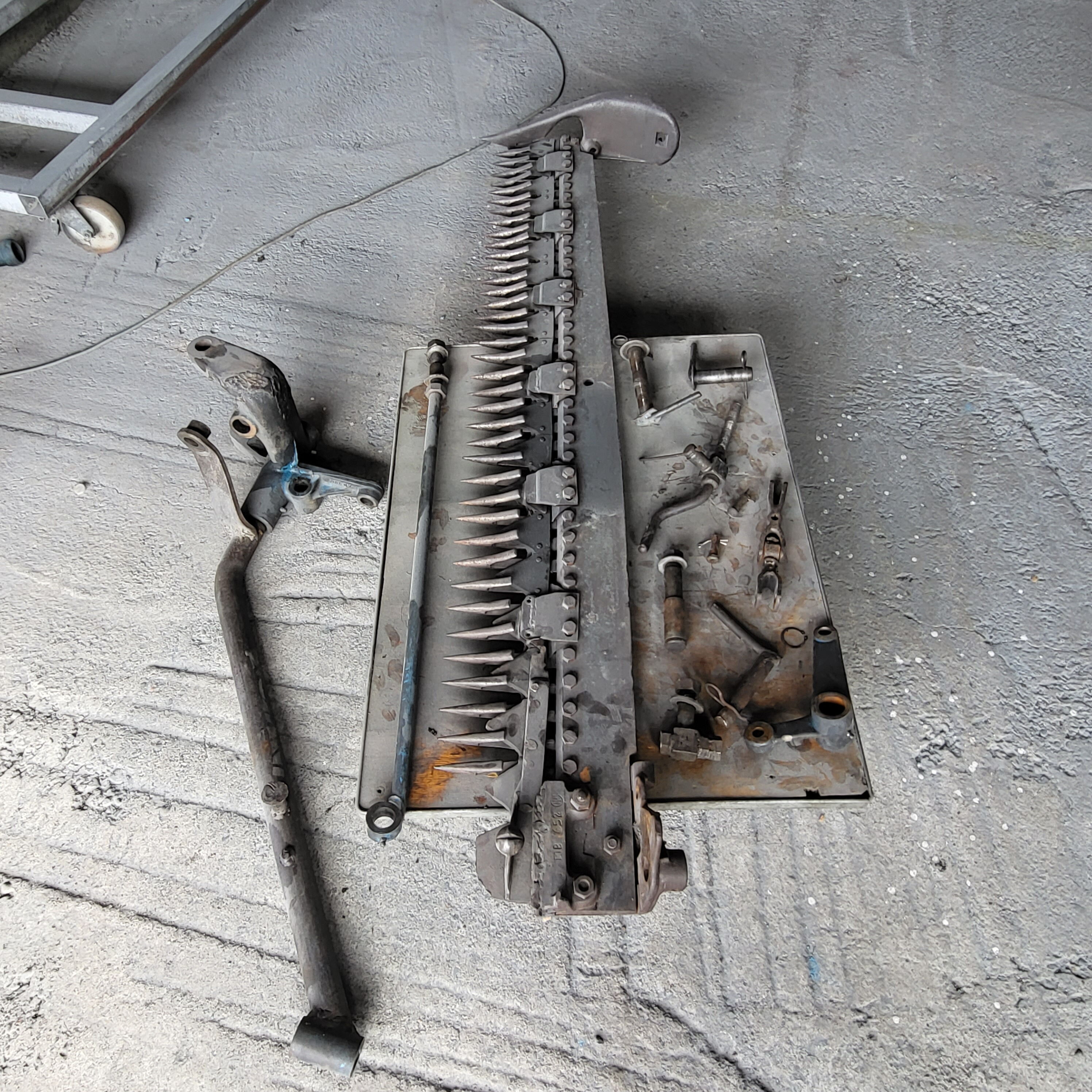Fotodokumentation des unrestaurierten Zustands vom 22.12.2021: authentische Nutzungsspuren, Korrosionszonen, aber vollständige Hauptbaugruppen inkl. Mähbalken-Peripherie. Der Erstzustand definierte, was erhalten, aufgearbeitet oder ersetzt wird. Gealterte Leitungen/Dichtflächen wurden erfasst; Transparenz als Werttreiber für jede folgende Entscheidung.