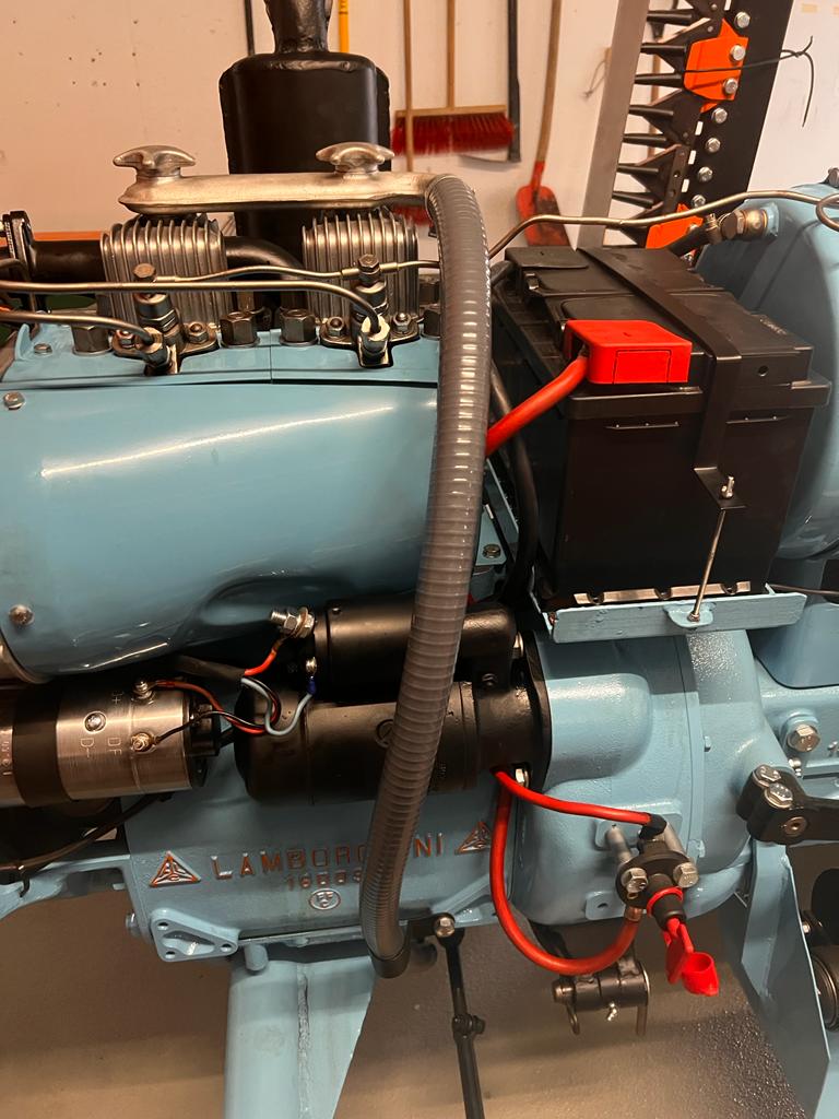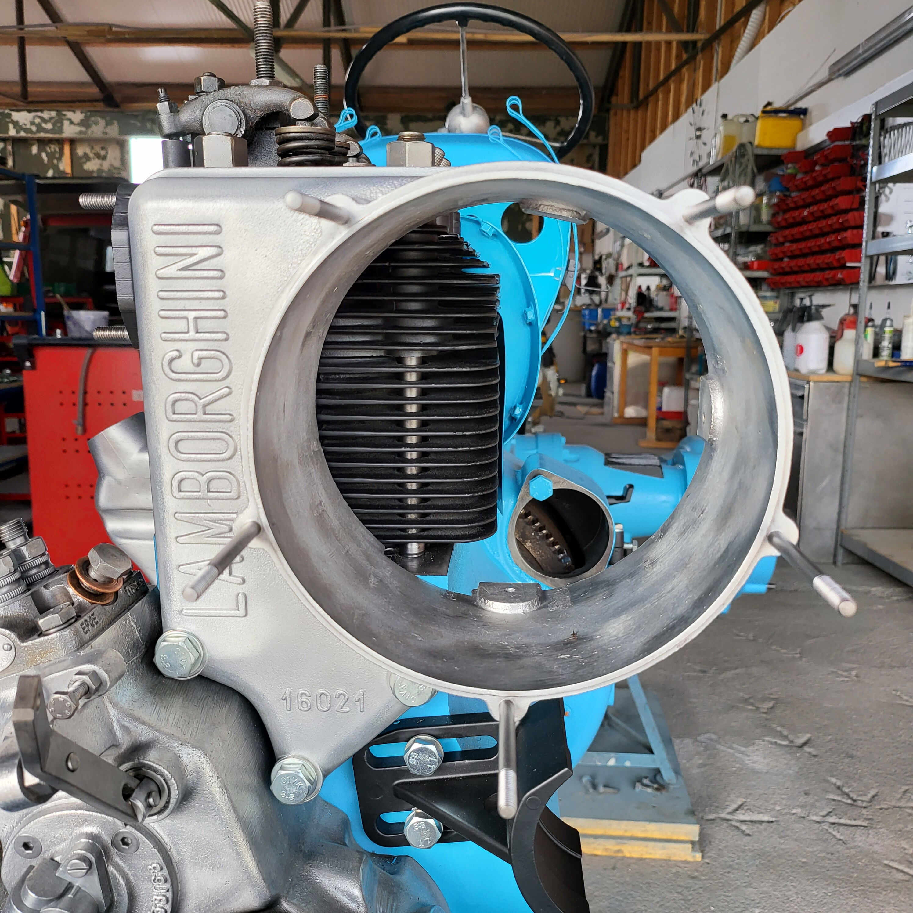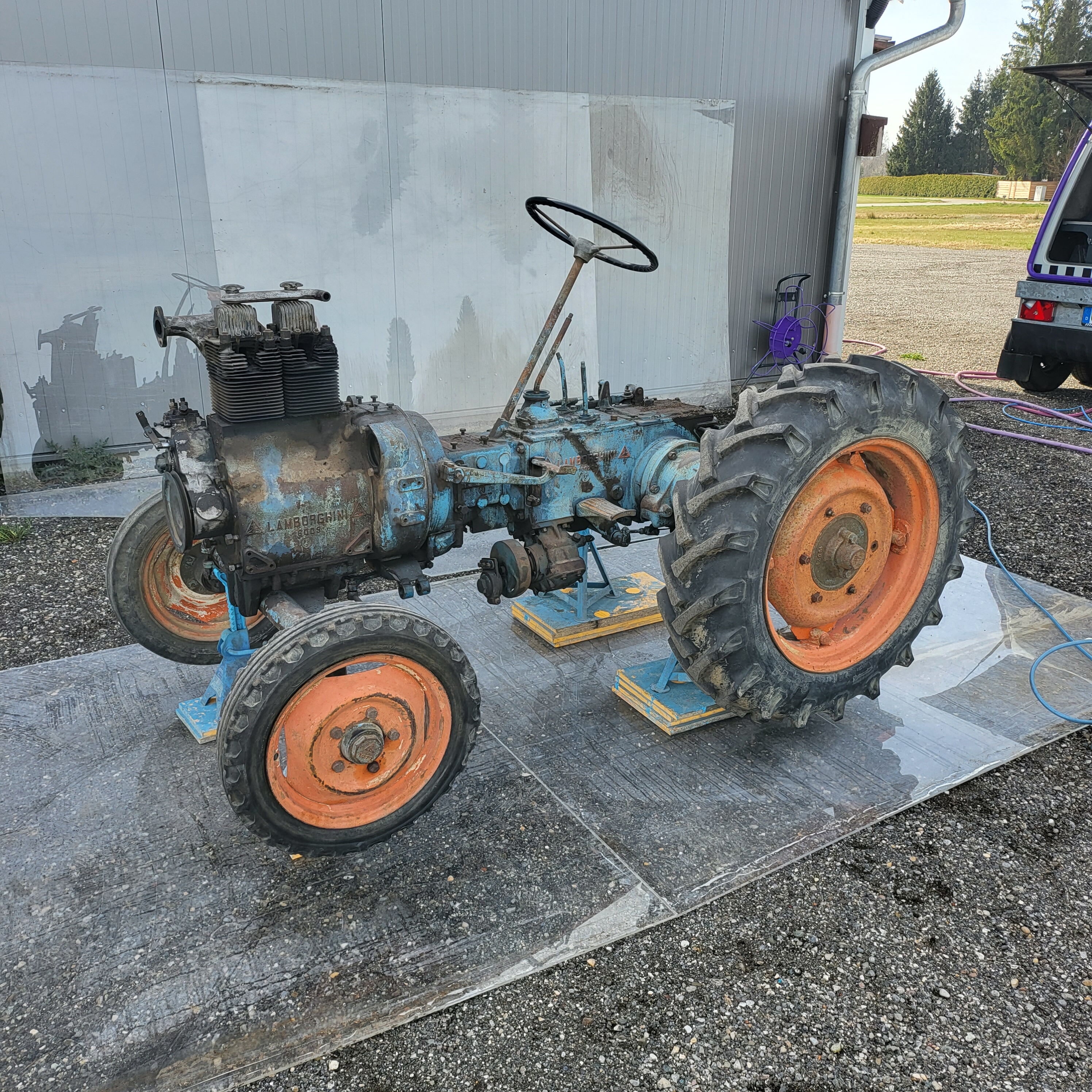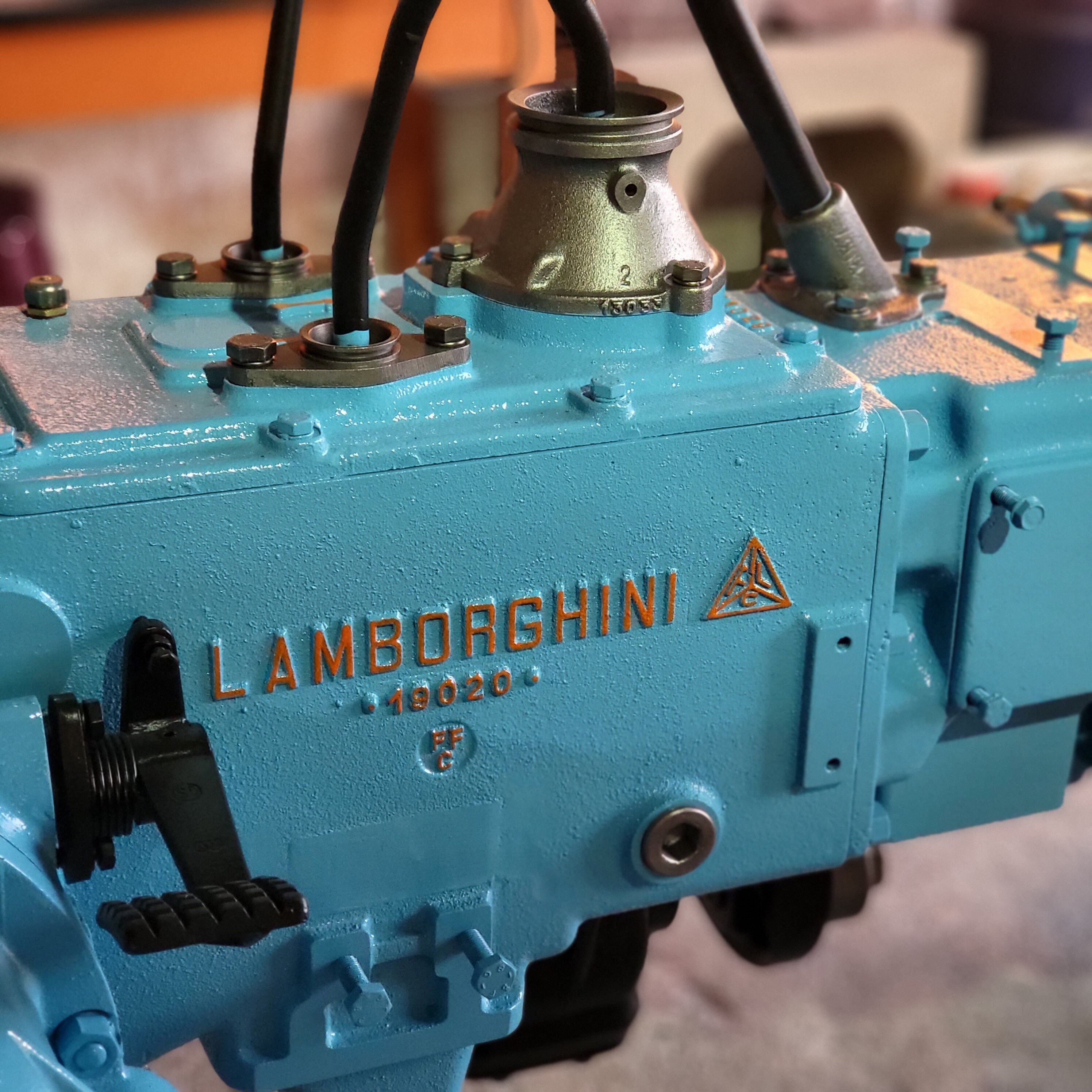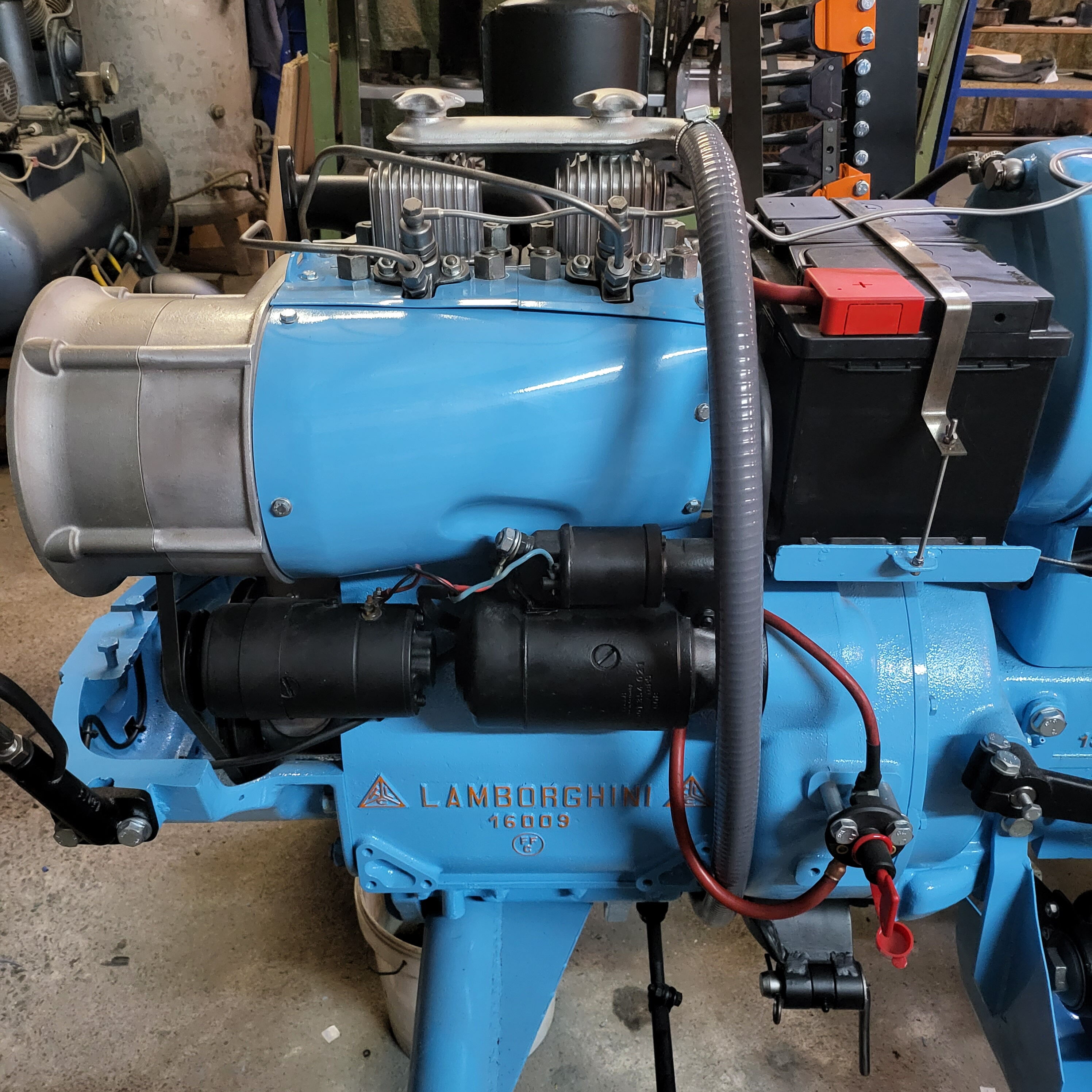 Vom verschraubten Mähbalken mit Flugrost, festgegammelten Leitungen und Jahrzehnten Obstwiesen-Patina – bis genau hier: Abdeckung runter. Zündung. Der FL-2 Zweizylinder erwacht, läuft sauber, nimmt willig Gas an. Ein Lamborghini 1R von 1967, technisch neu aufgebaut, optisch authentisch – bereit für sein zweites Leben zwischen den Baumreihen.