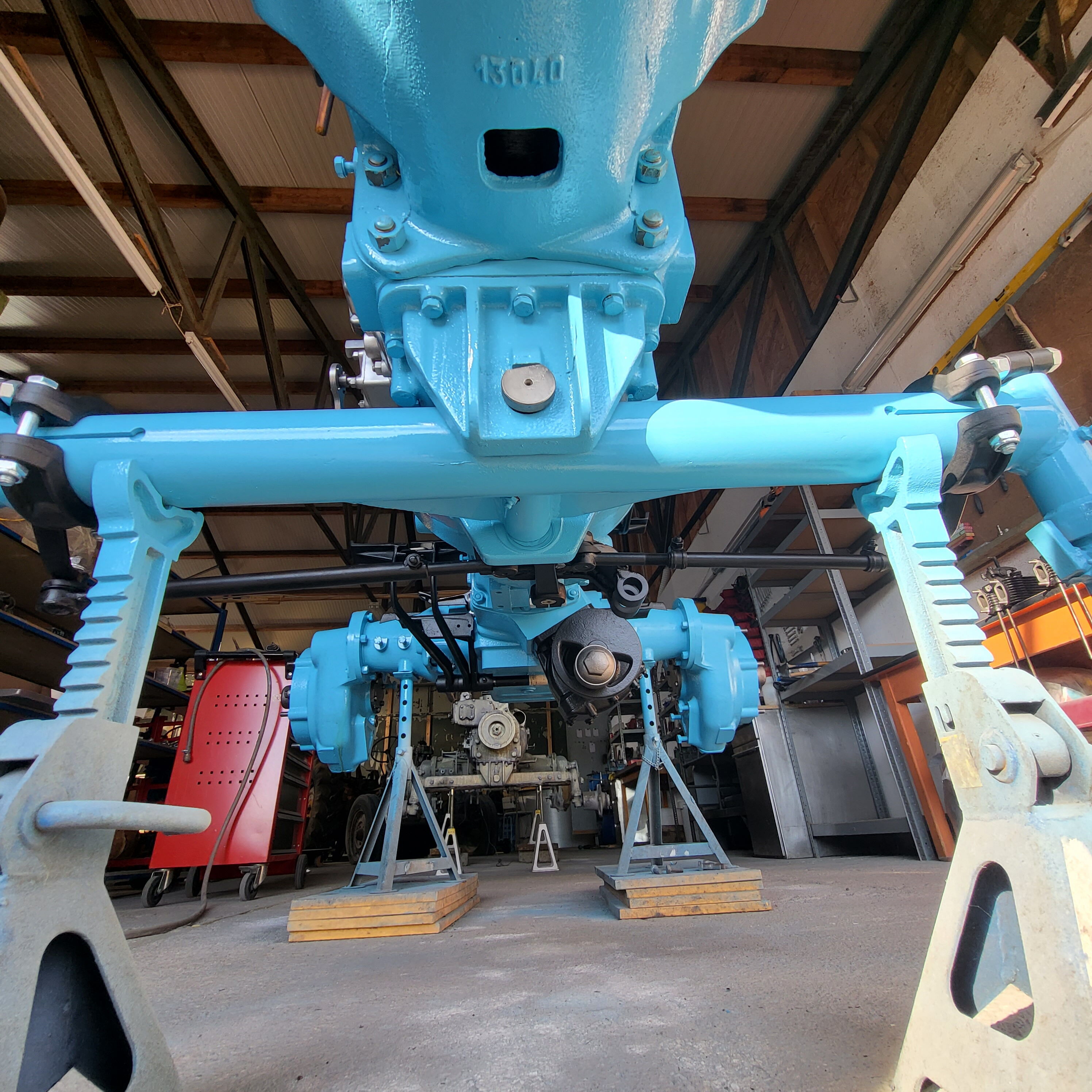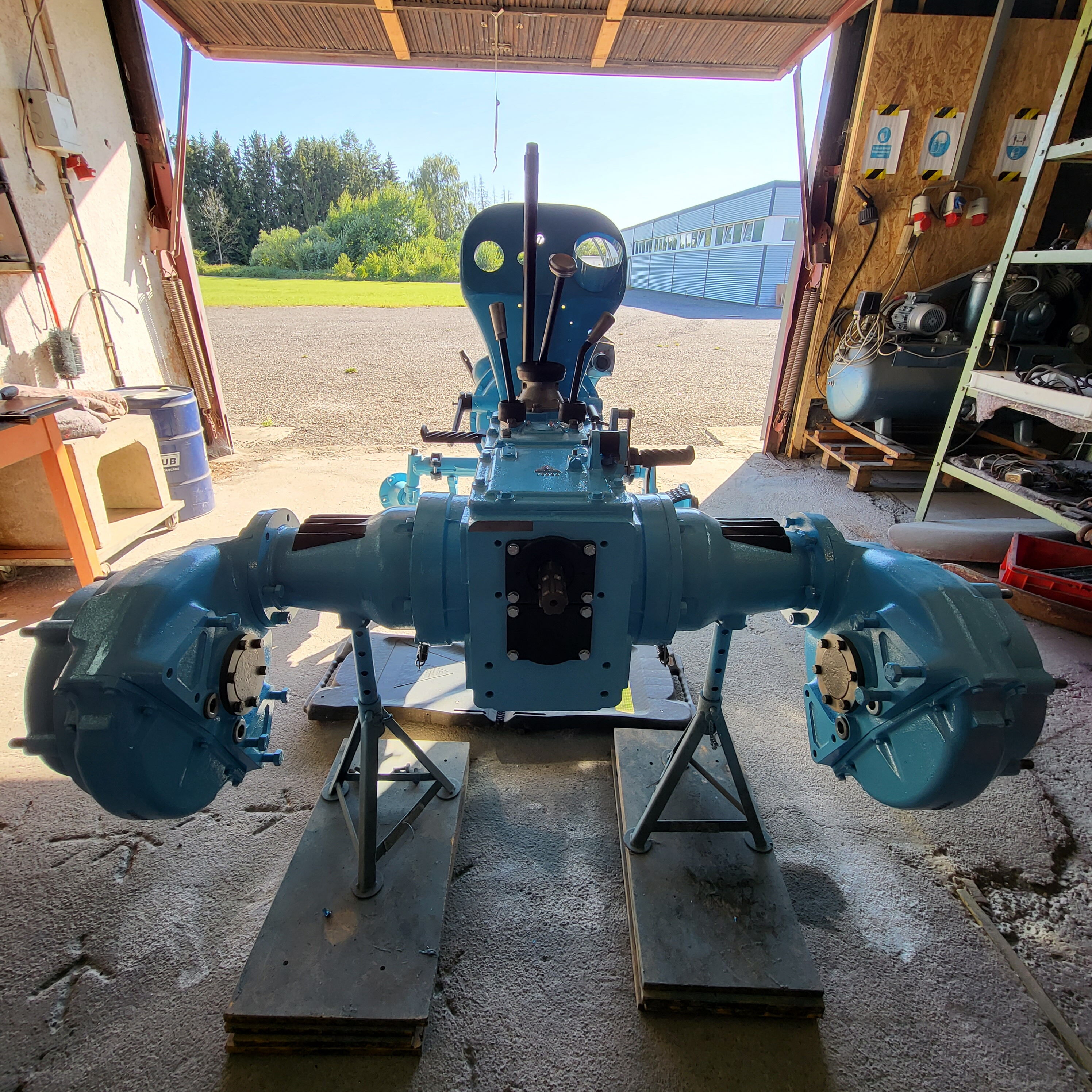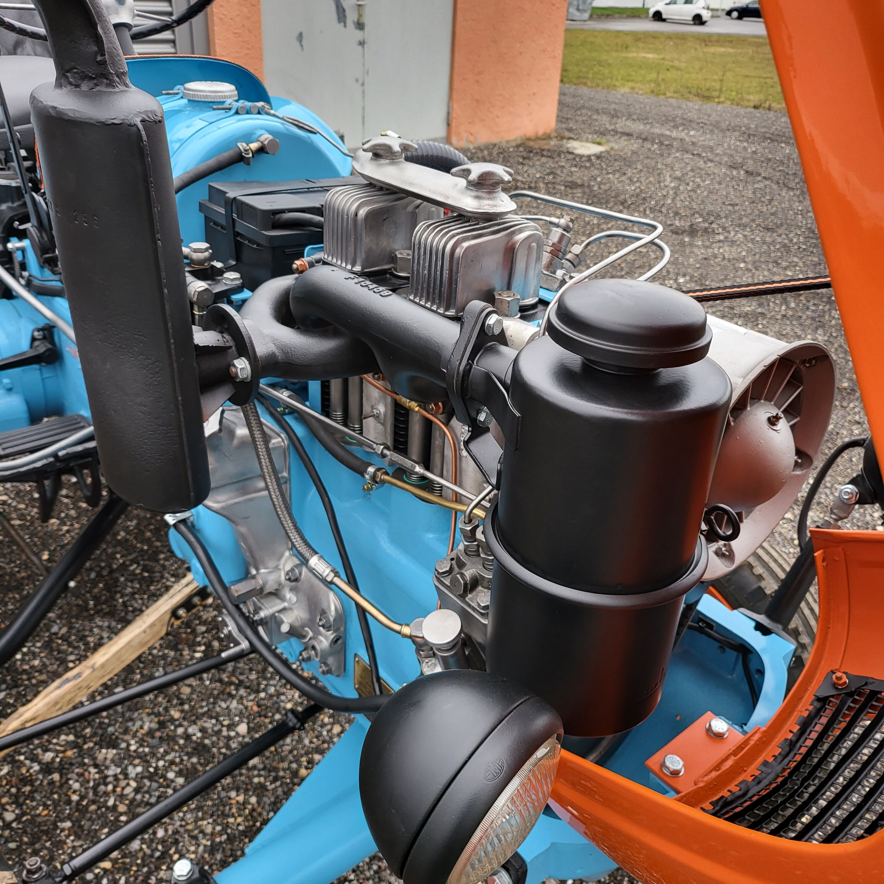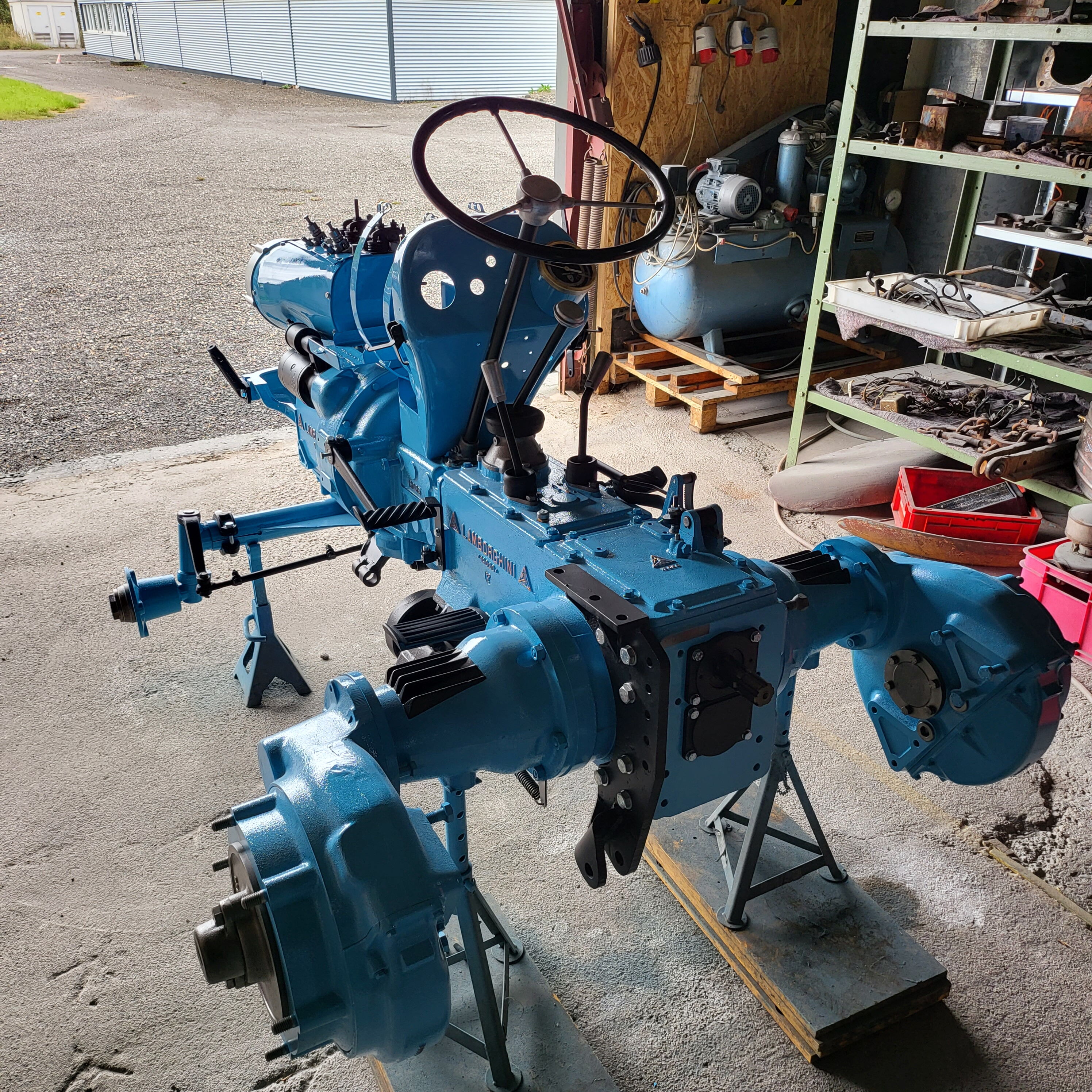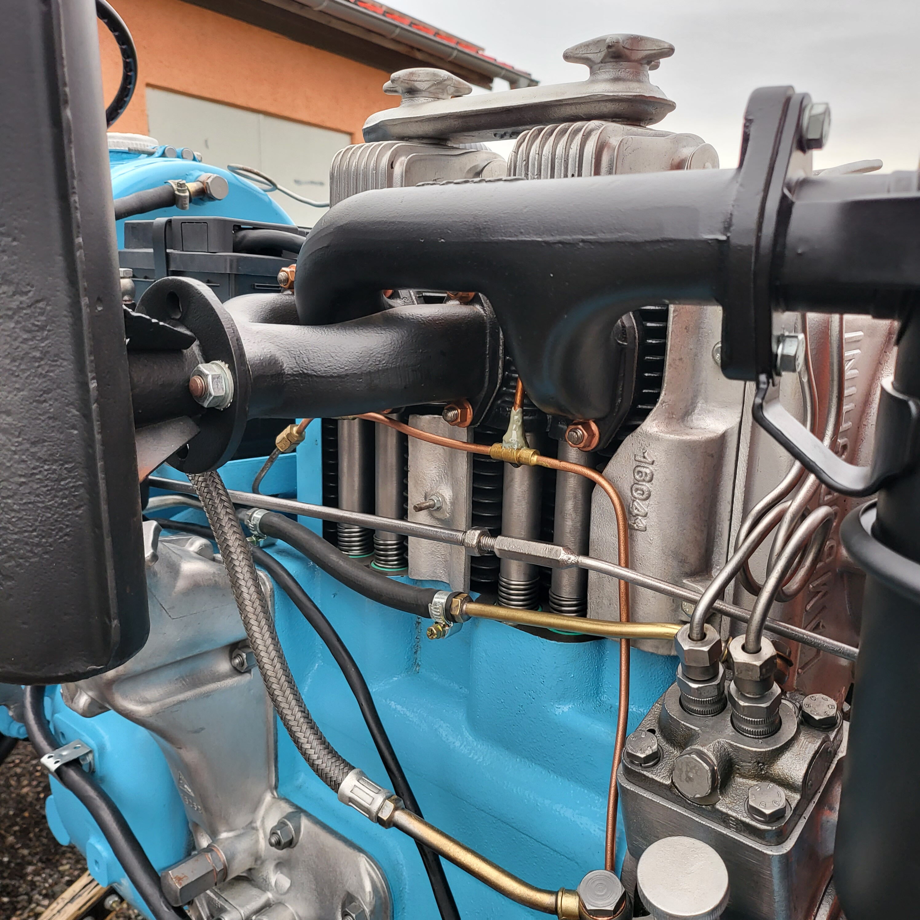 Vollzerlegung („Rahmen-off“) bis zur letzten Schraube. Elektrik komplett neu (moderne Verteilersysteme, neu gefertigter Kabelbaum, hochwertige Steck-/Crimpverbindungen; Sicherungen nur, wenn historisch vorgesehen). Alle Dichtungen neu, nach Traktormanufaktur-Spezifikation in Österreich gefertigt und verbaut. Anlasserzahnkranz wird grundsätzlich erneuert. Pulverbeschichtungen vieler Teile (bewegliche Komponenten überwiegend schwarz); Felgen mit Hochglanz-Pulverbeschichtung; Sichtteile periodenkorrekt lackiert. Original-Traktormeter in Originalausführung vom damaligen Originalhersteller nachproduziert. ID-gebundene Fotodokumentation & Monatschronik.