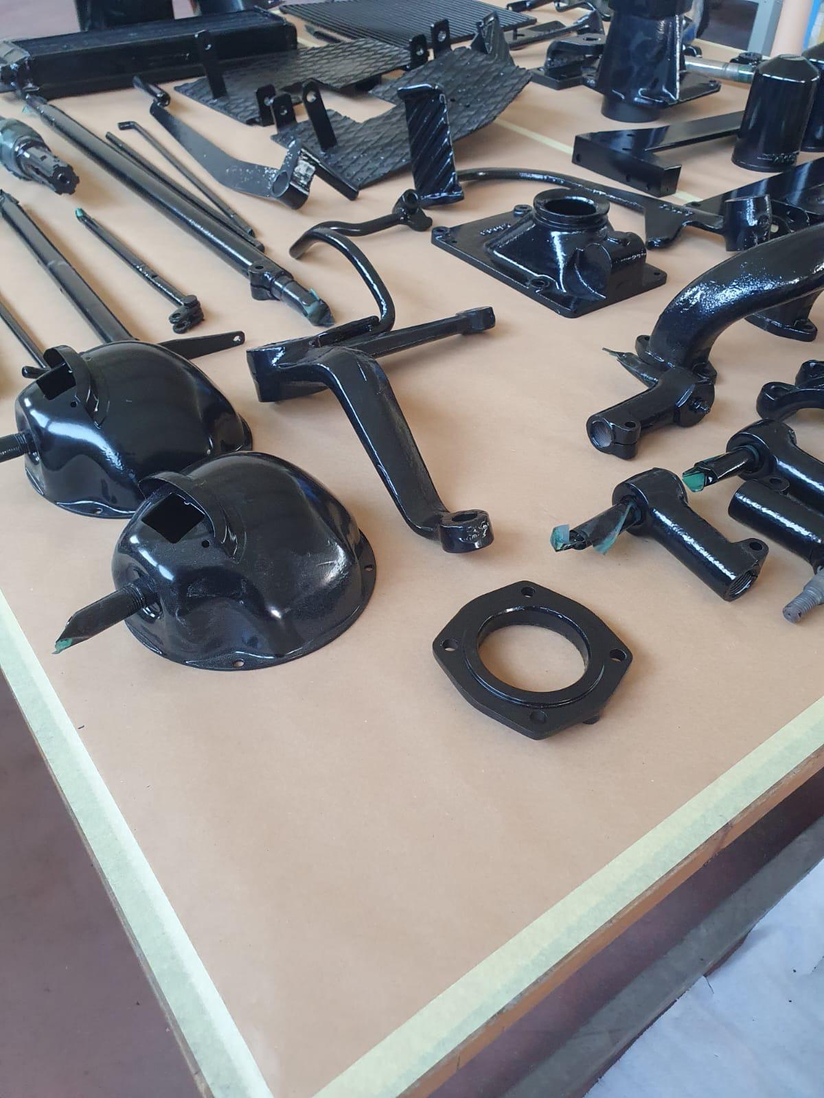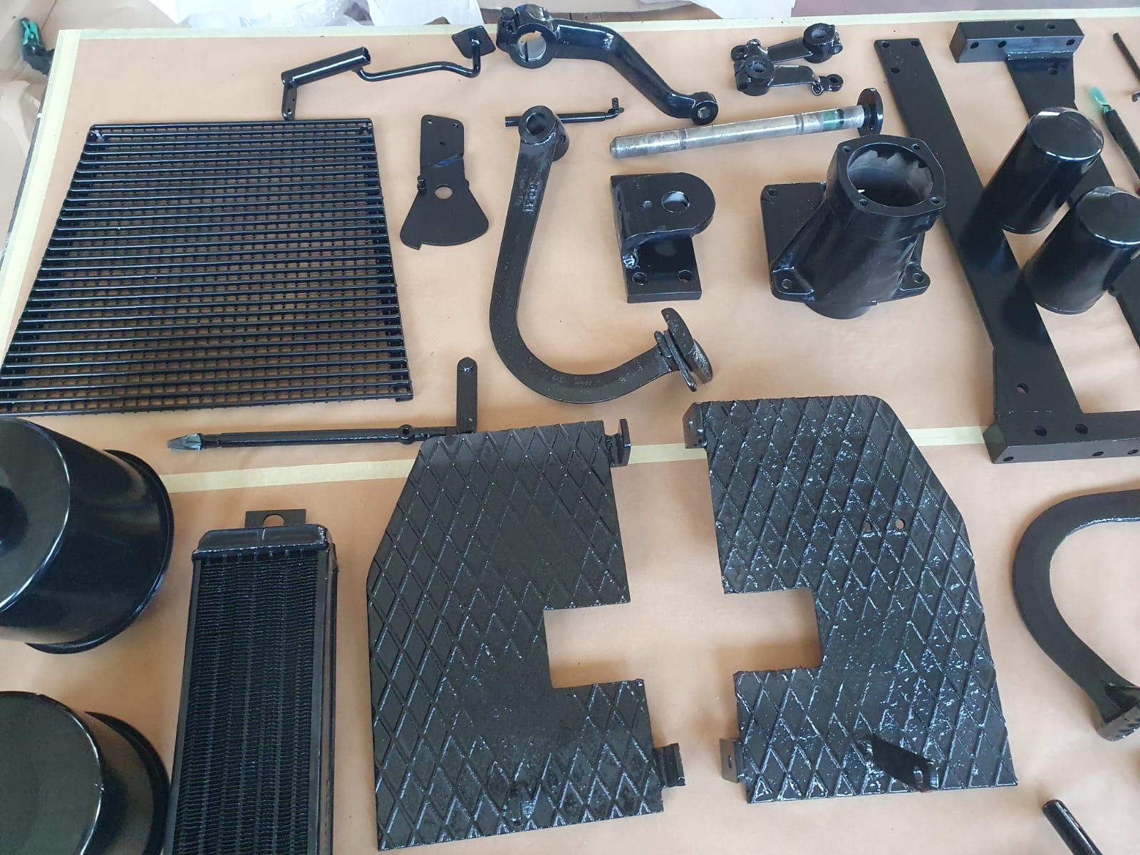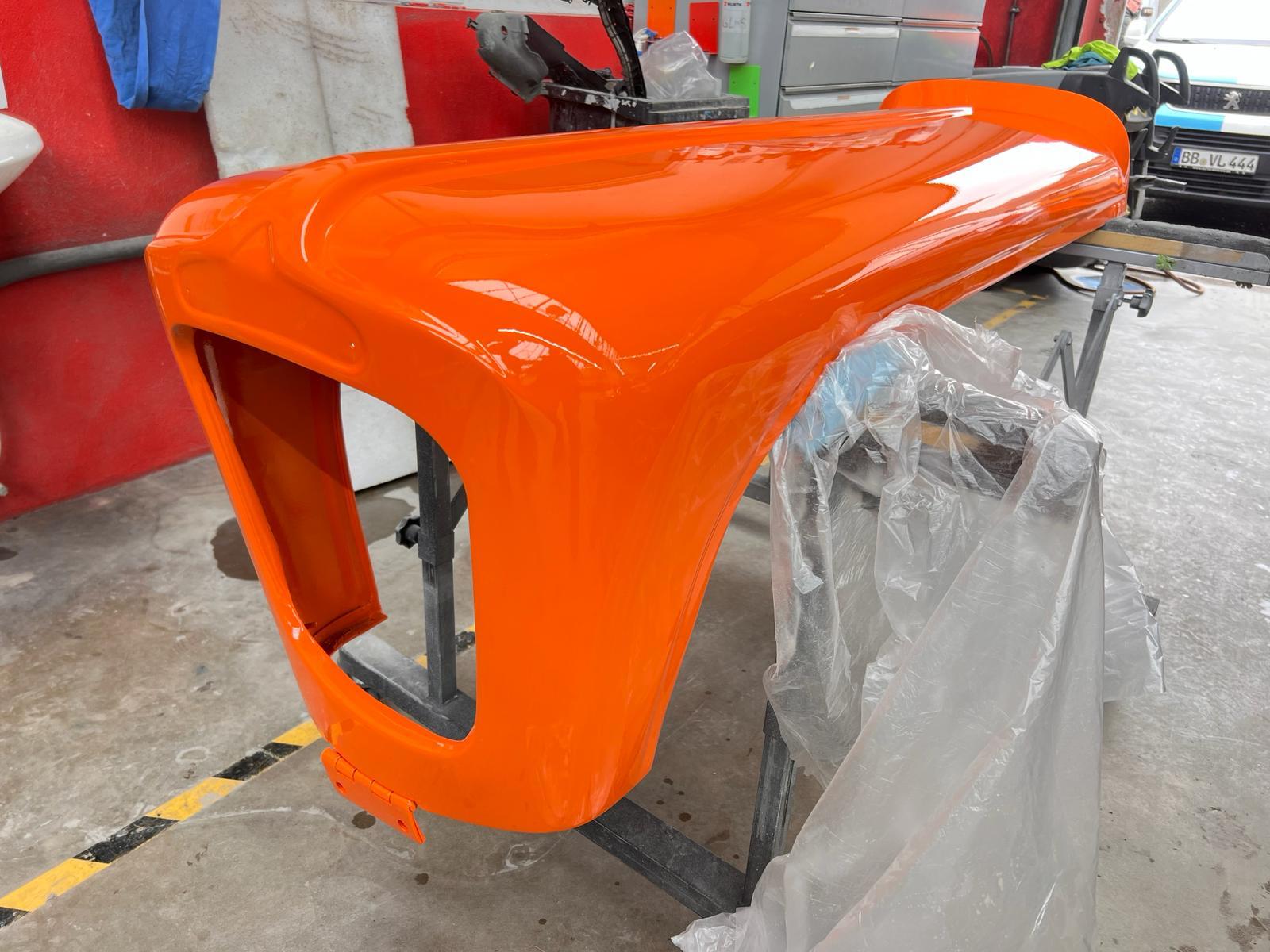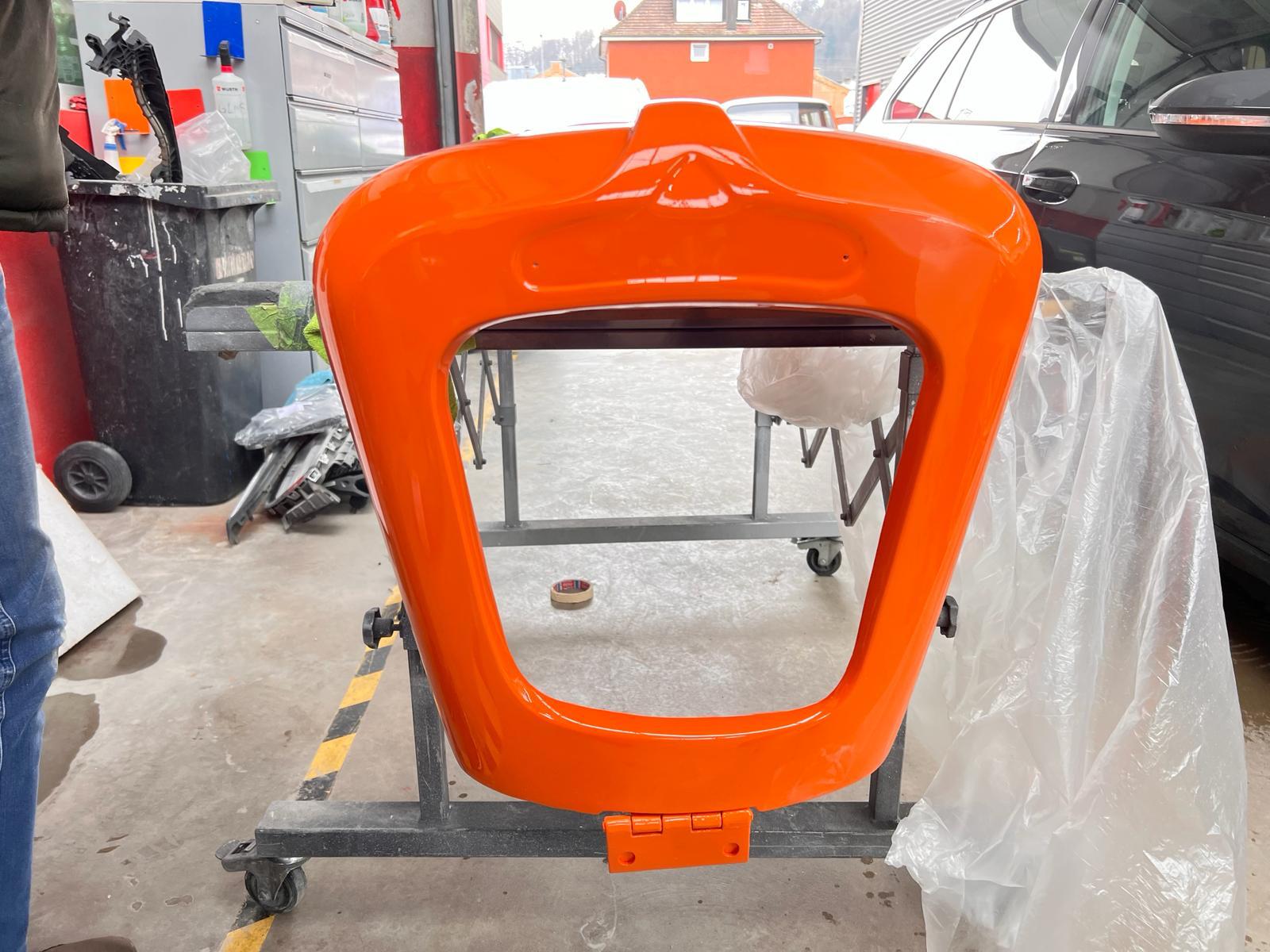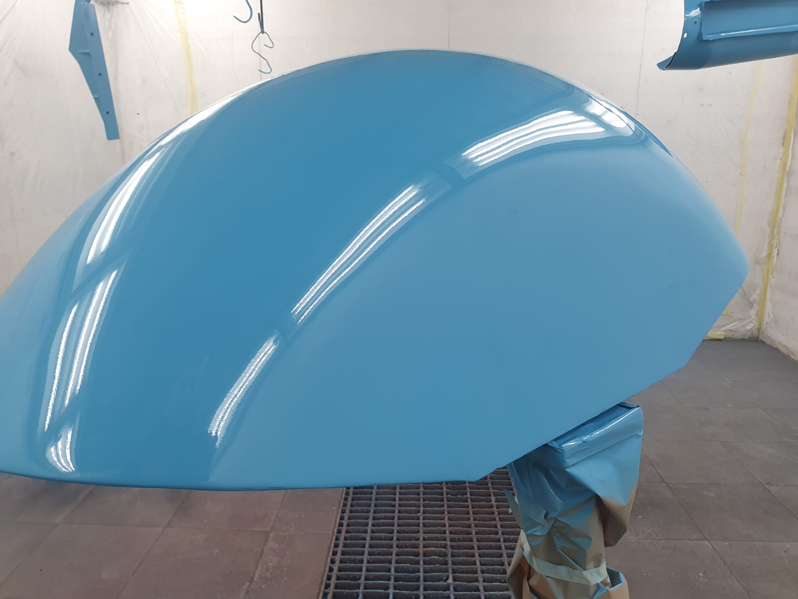 Professionelle Pulverbeschichtung vieler Bauteile; bewegliche Komponenten überwiegend schwarz pulverbeschichtet. Felgen mit Hochglanz-Pulverbeschichtung (Show-Quality-Finish). Sichtteile in periodenkorrekten Farbtönen lackiert. Umfassender Korrosionsschutz innen/außen.