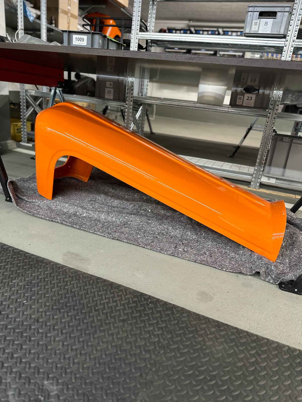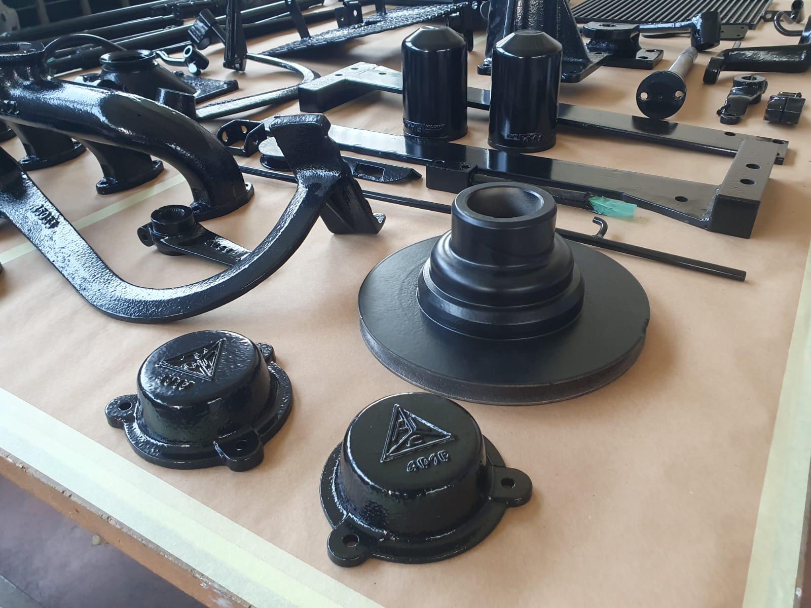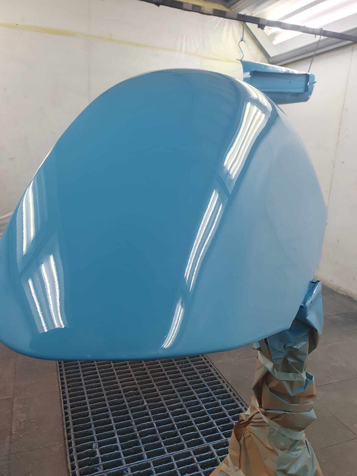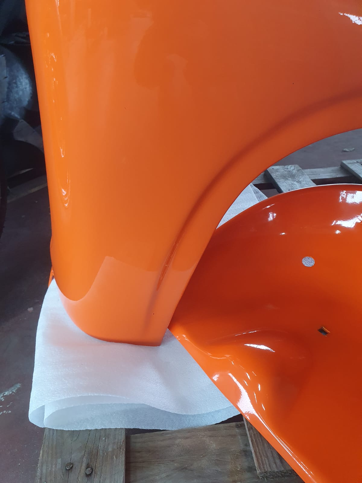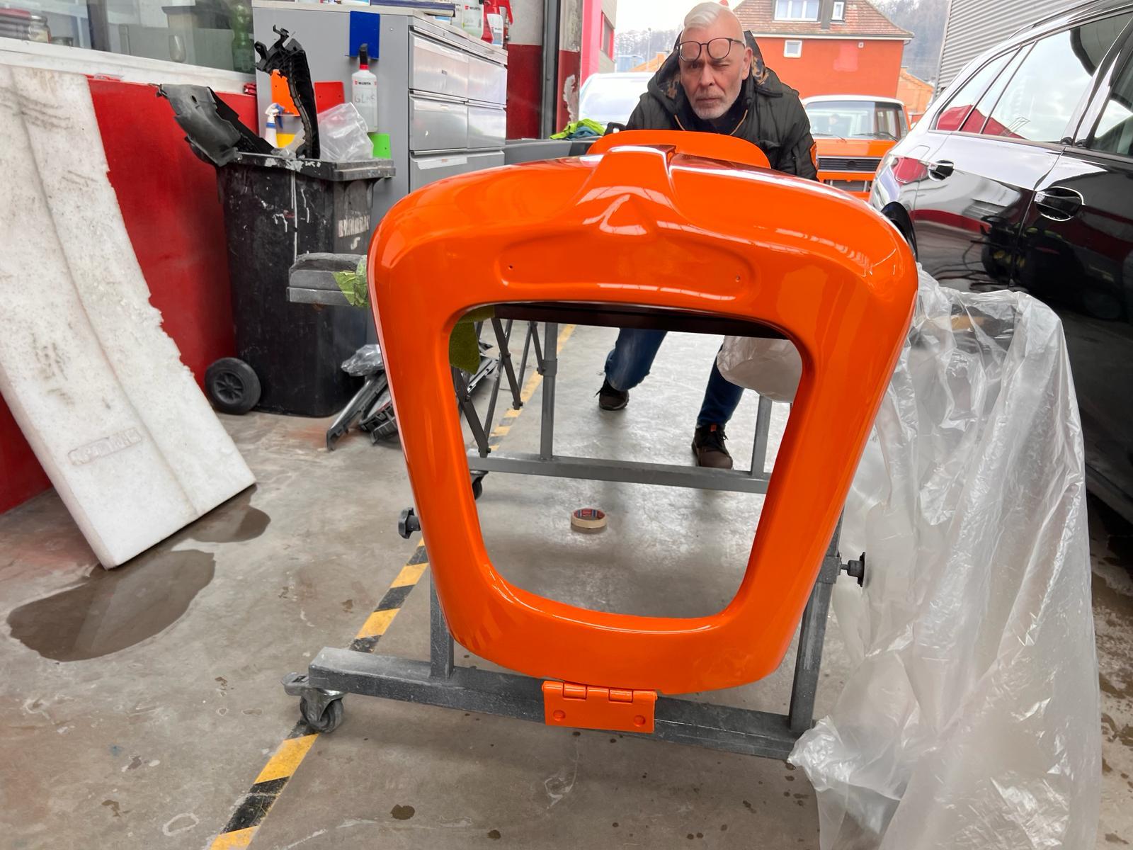 Professionelle Pulverbeschichtung vieler Bauteile; bewegliche Komponenten überwiegend schwarz pulverbeschichtet. Felgen mit Hochglanz-Pulverbeschichtung (Show-Quality-Finish). Sichtteile in periodenkorrekten Farbtönen lackiert. Umfassender Korrosionsschutz innen/außen.