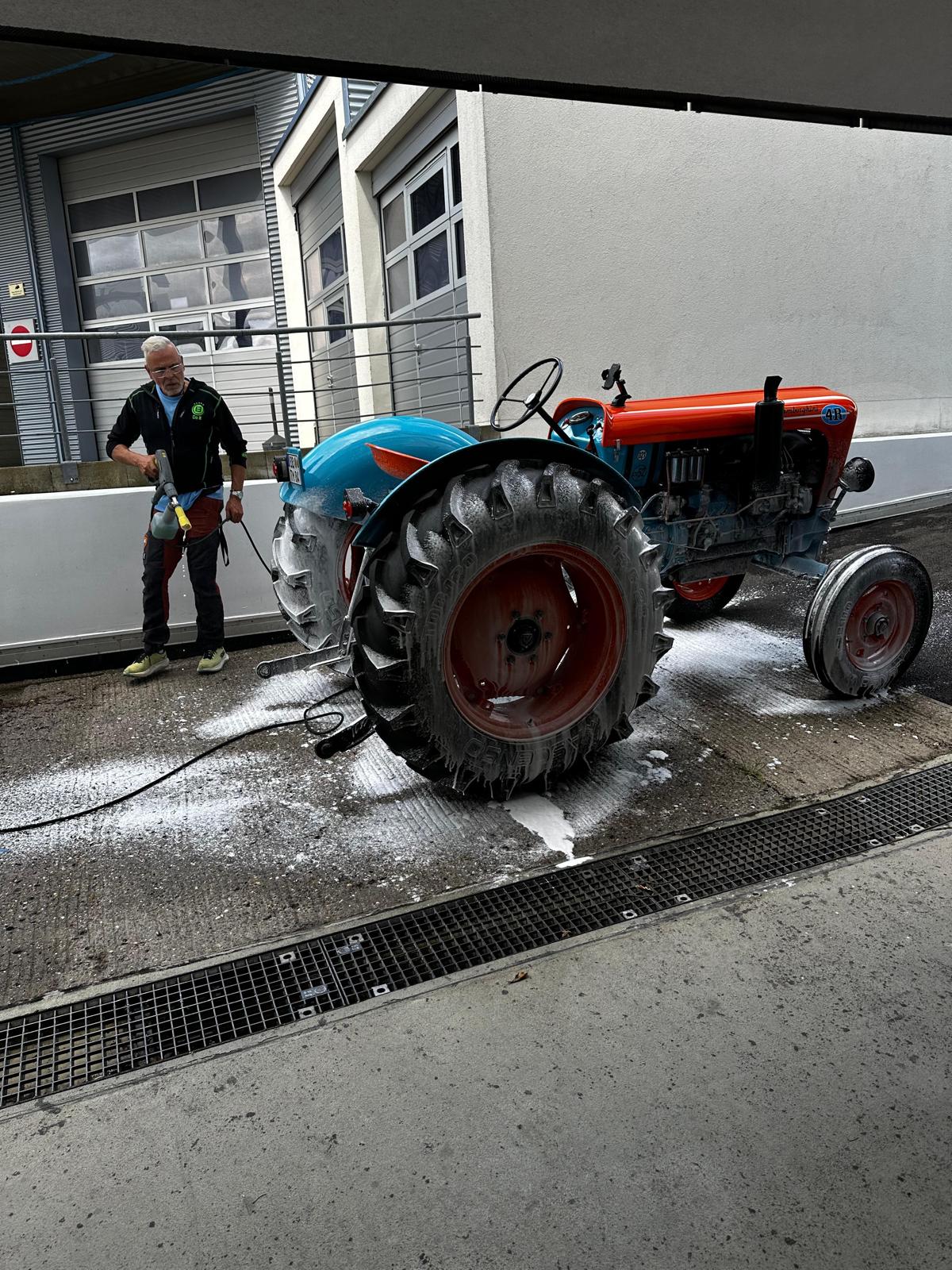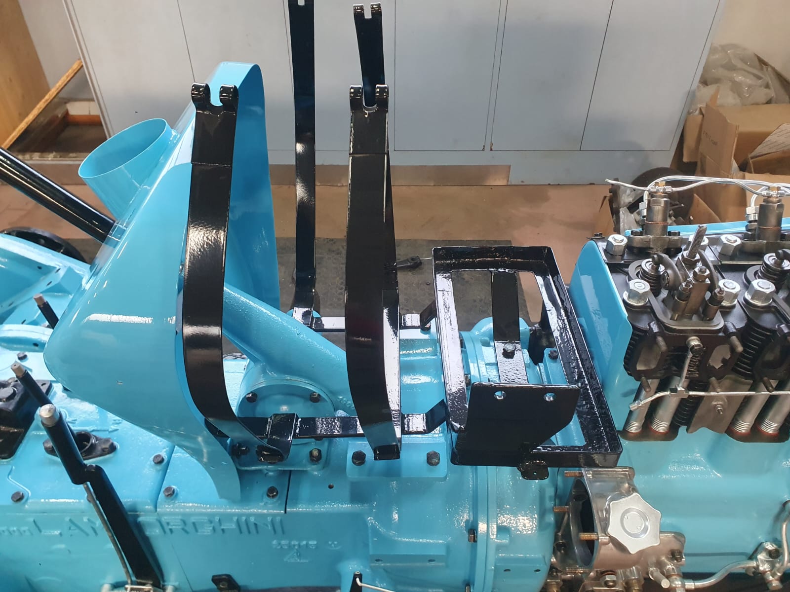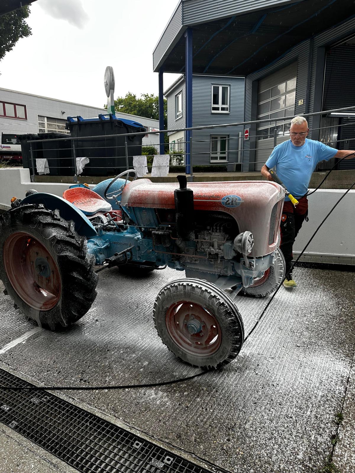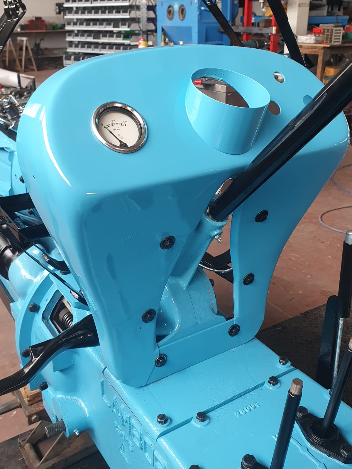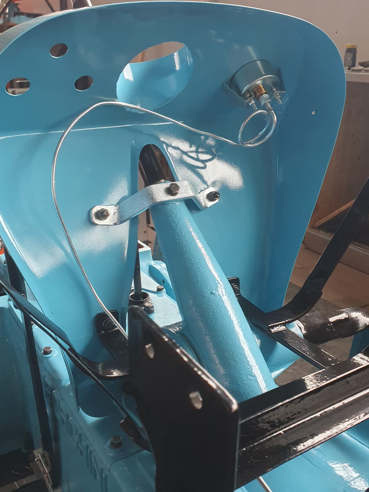 Vollzerlegung („Rahmen-off“) bis zur letzten Schraube. Elektrik komplett neu (moderne Verteilersysteme, neu gefertigter Kabelbaum, hochwertige Steck-/Crimpverbindungen; Sicherungen nur, wenn historisch vorgesehen). Alle Dichtungen neu, nach Traktormanufaktur-Spezifikation in Österreich gefertigt und verbaut. Anlasserzahnkranz wird grundsätzlich erneuert. Pulverbeschichtungen vieler Teile (bewegliche Komponenten überwiegend schwarz); Felgen mit Hochglanz-Pulverbeschichtung; Sichtteile periodenkorrekt lackiert. Original-Traktormeter in Originalausführung vom damaligen Originalhersteller nachproduziert. ID-gebundene Fotodokumentation & Monatschronik.