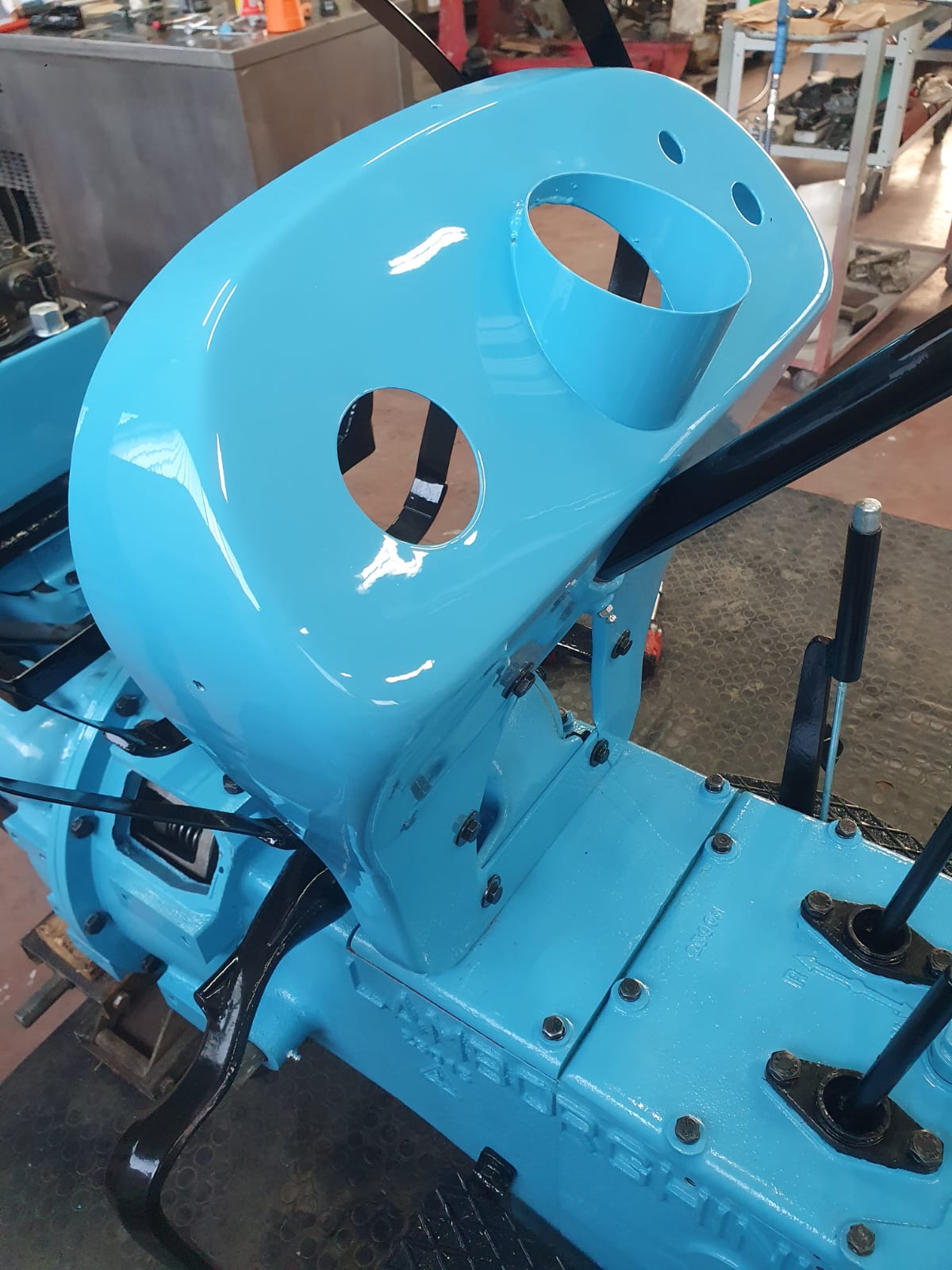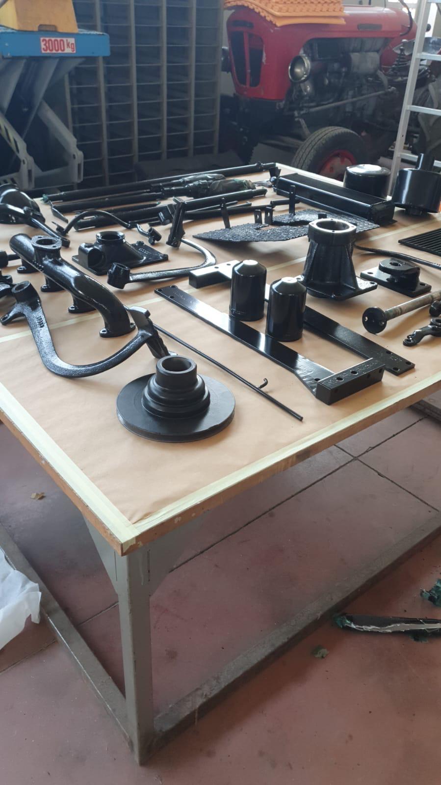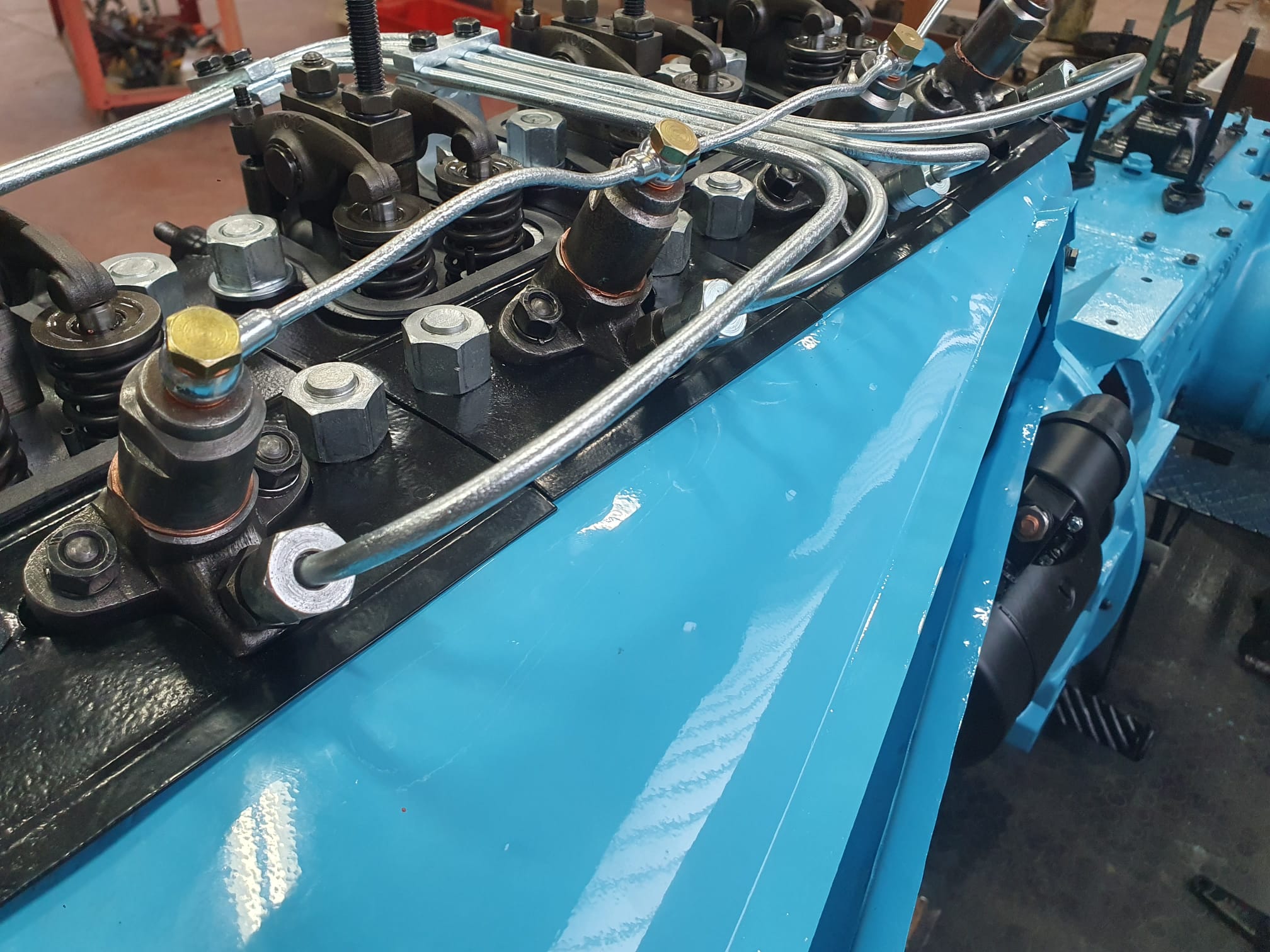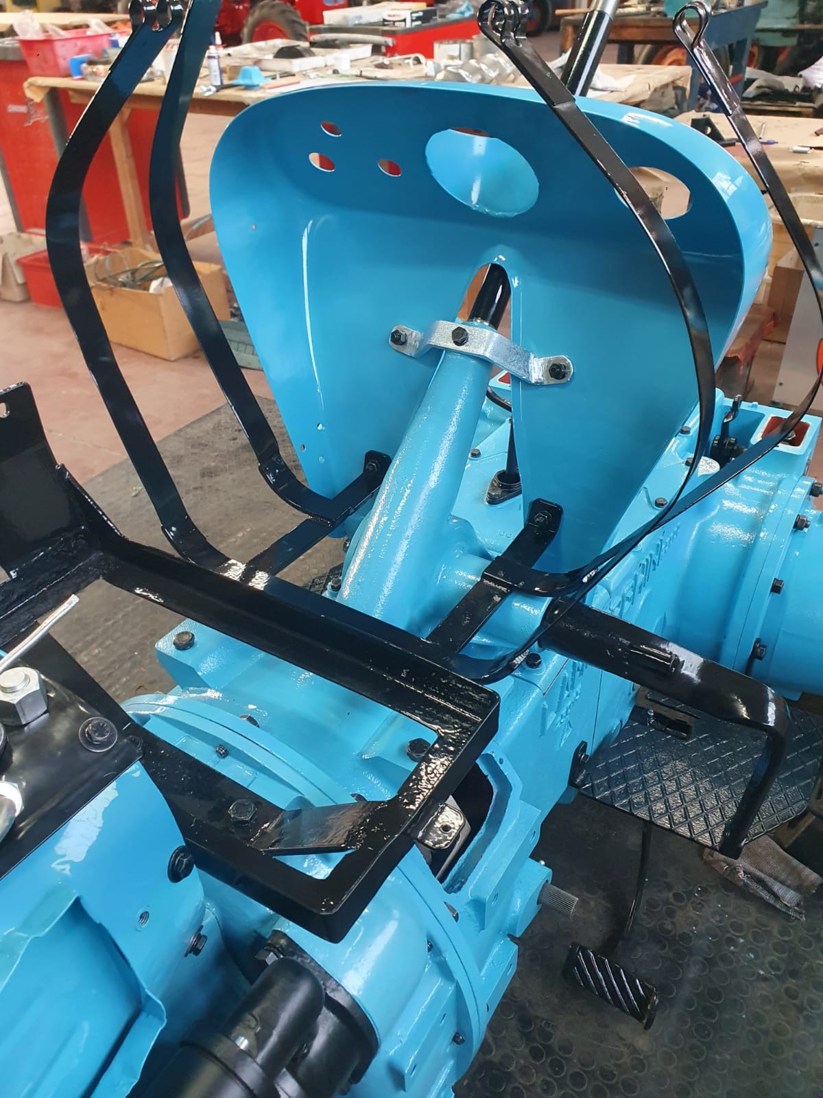 Vollzerlegung („Rahmen-off“) bis zur letzten Schraube. Elektrik komplett neu (moderne Verteilersysteme, neu gefertigter Kabelbaum, hochwertige Steck-/Crimpverbindungen; Sicherungen nur, wenn historisch vorgesehen). Alle Dichtungen neu, nach Traktormanufaktur-Spezifikation in Österreich gefertigt und verbaut. Anlasserzahnkranz wird grundsätzlich erneuert. Pulverbeschichtungen vieler Teile (bewegliche Komponenten überwiegend schwarz); Felgen mit Hochglanz-Pulverbeschichtung; Sichtteile periodenkorrekt lackiert. Original-Traktormeter in Originalausführung vom damaligen Originalhersteller nachproduziert. ID-gebundene Fotodokumentation & Monatschronik.