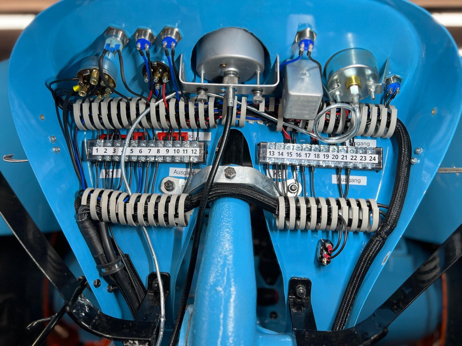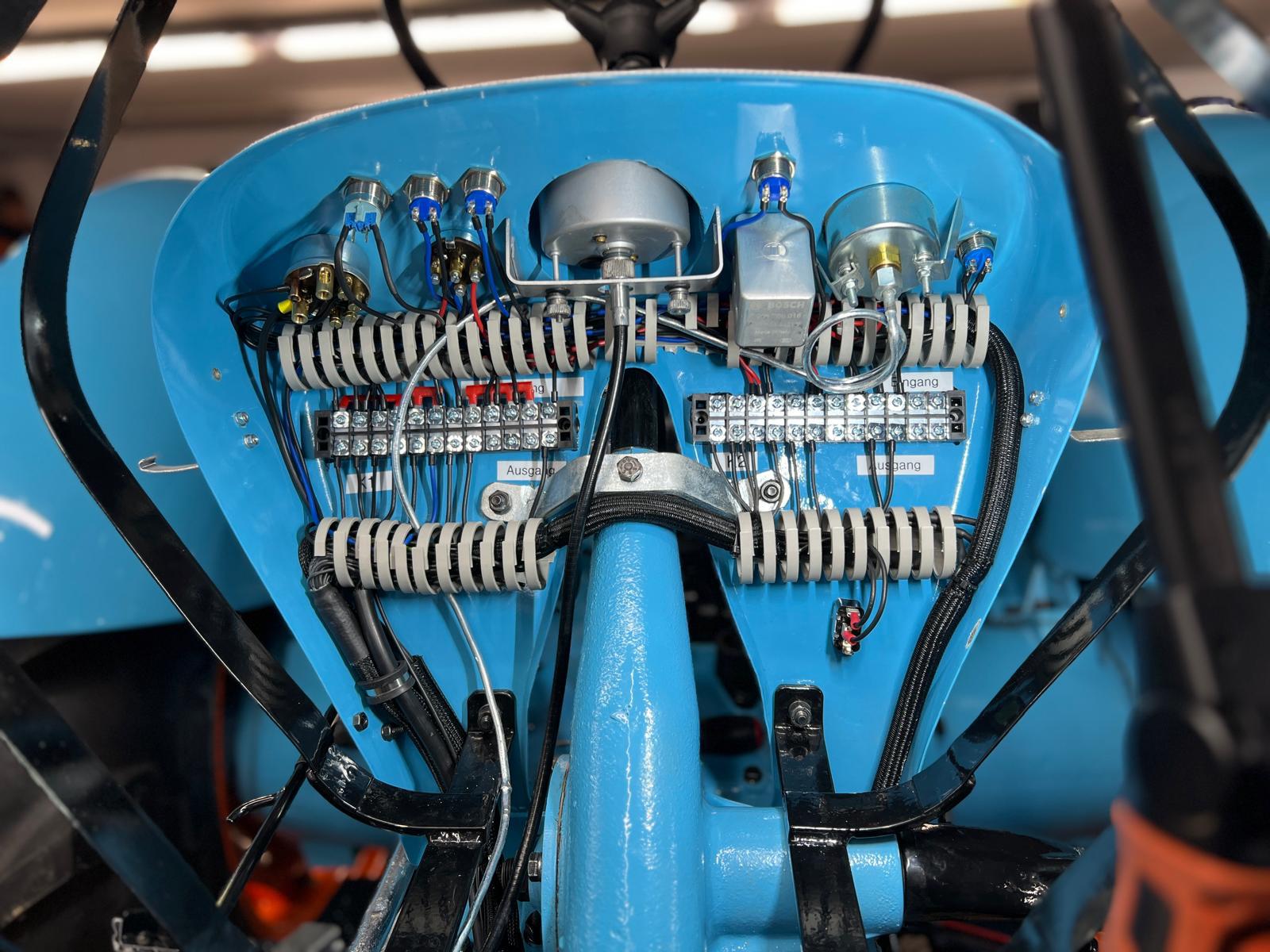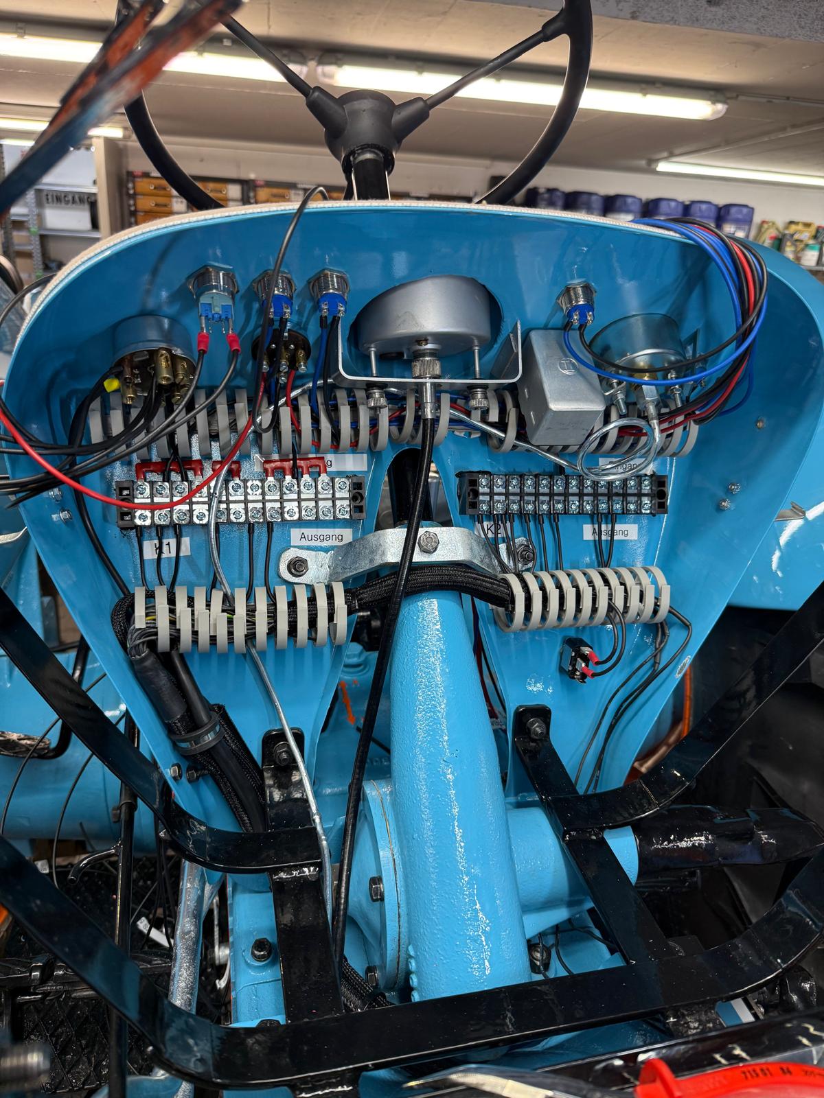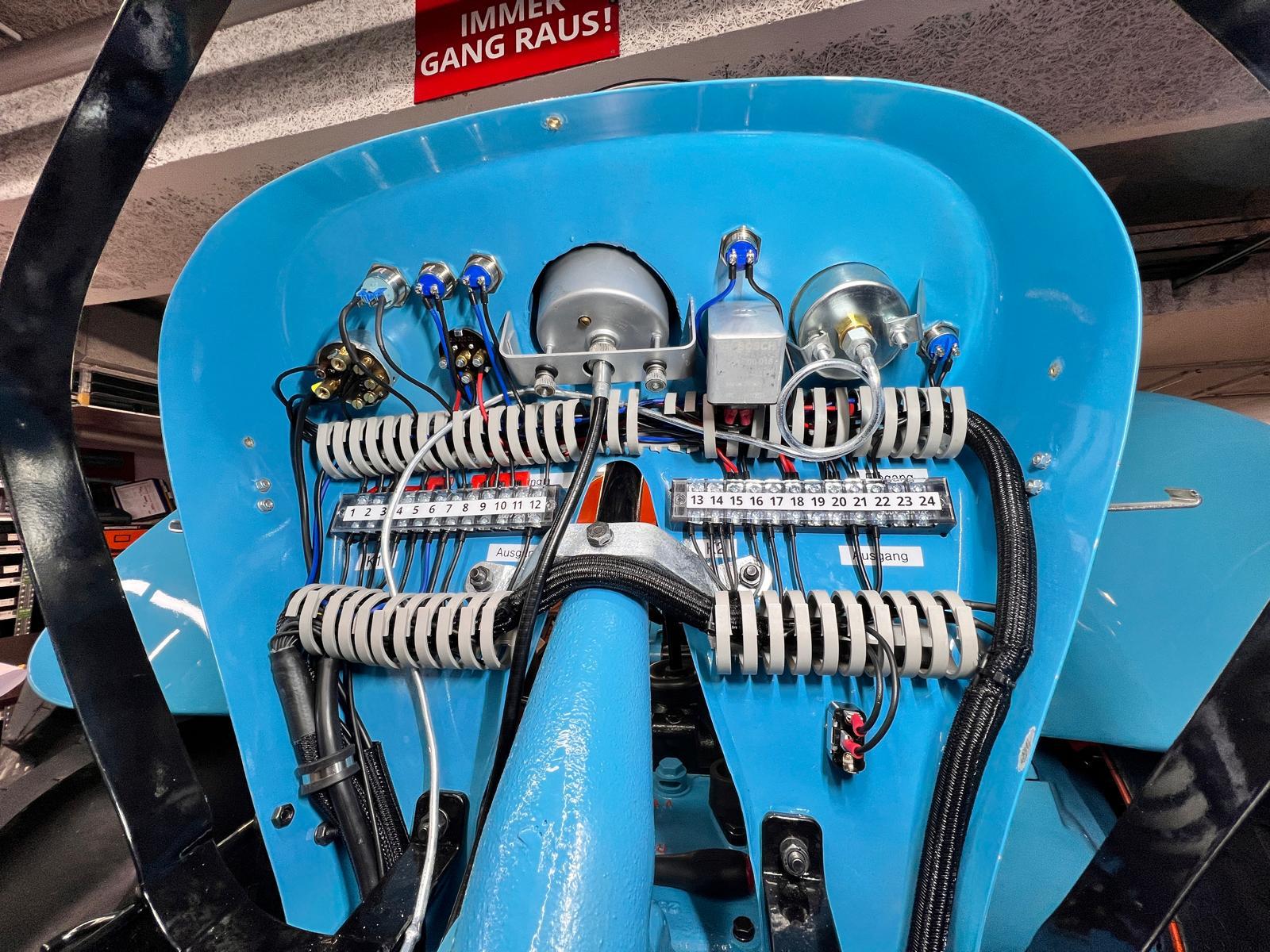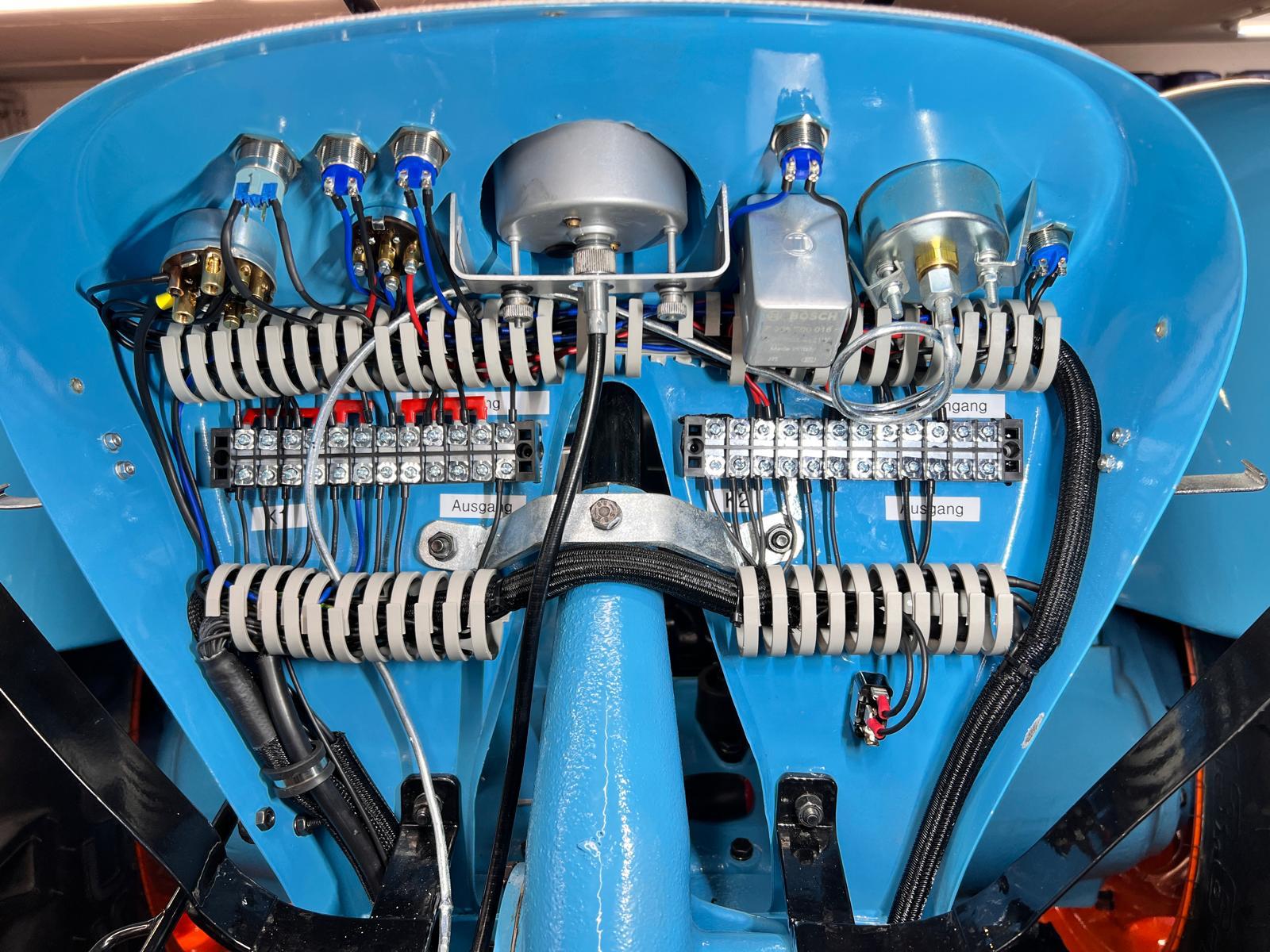 Neuaufbau mit modern dimensionierten Verteilersystemen, neu gefertigtem Kabelbaum und hochwertigen Steck-/Crimpverbindungen. Sicherungen nur, wenn historisch vorgesehen. Beleuchtung/Signale funktionssicher; Traktormeter in Originalausführung vom damaligen Originalhersteller nachproduziert.