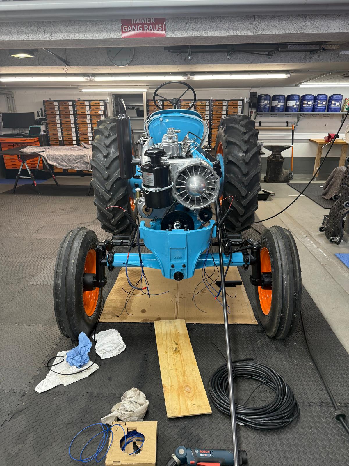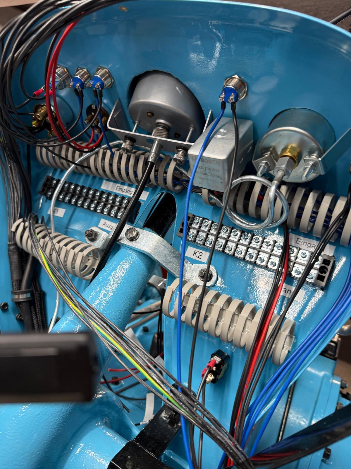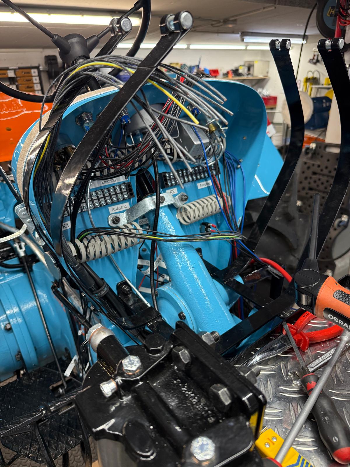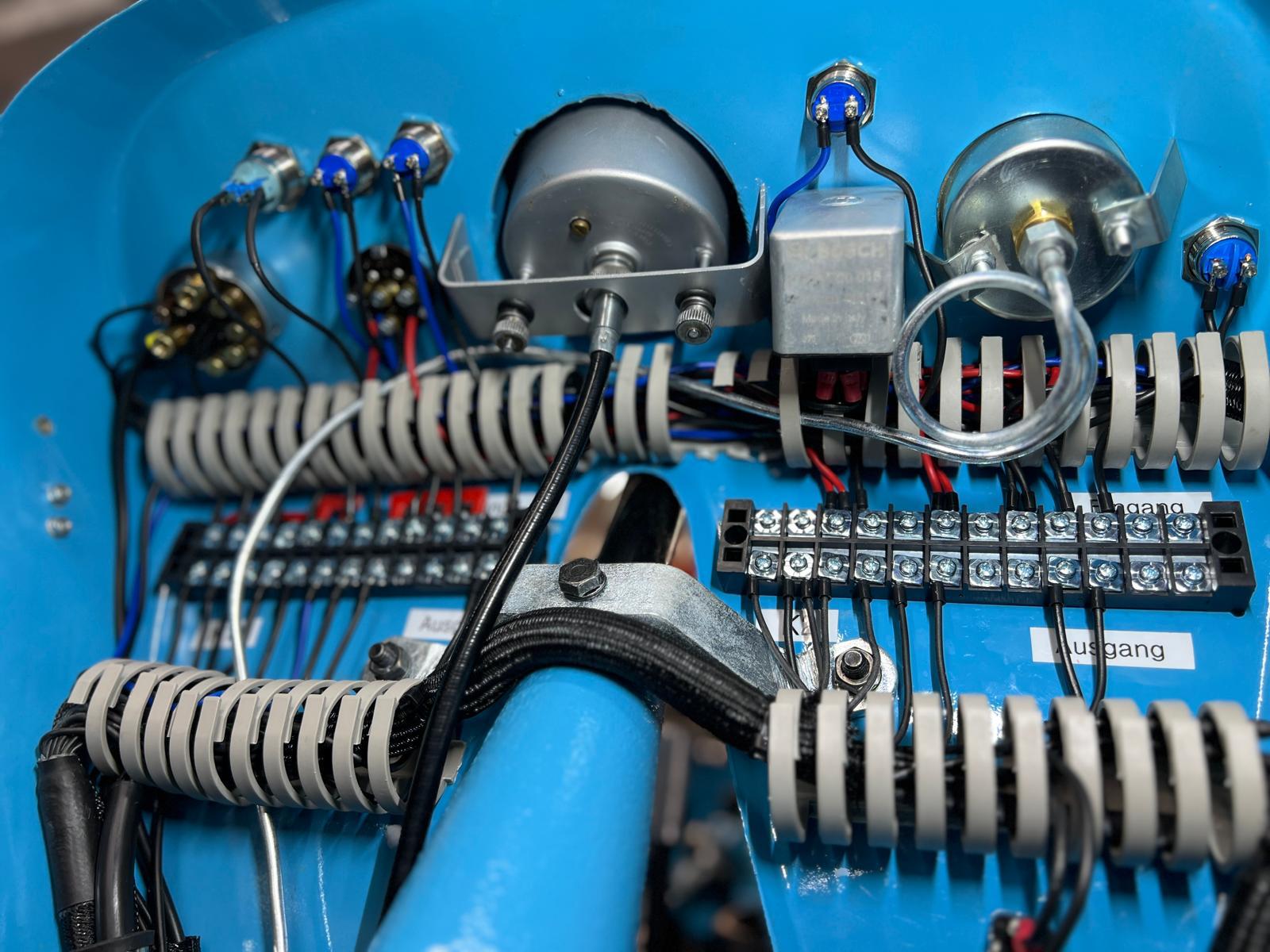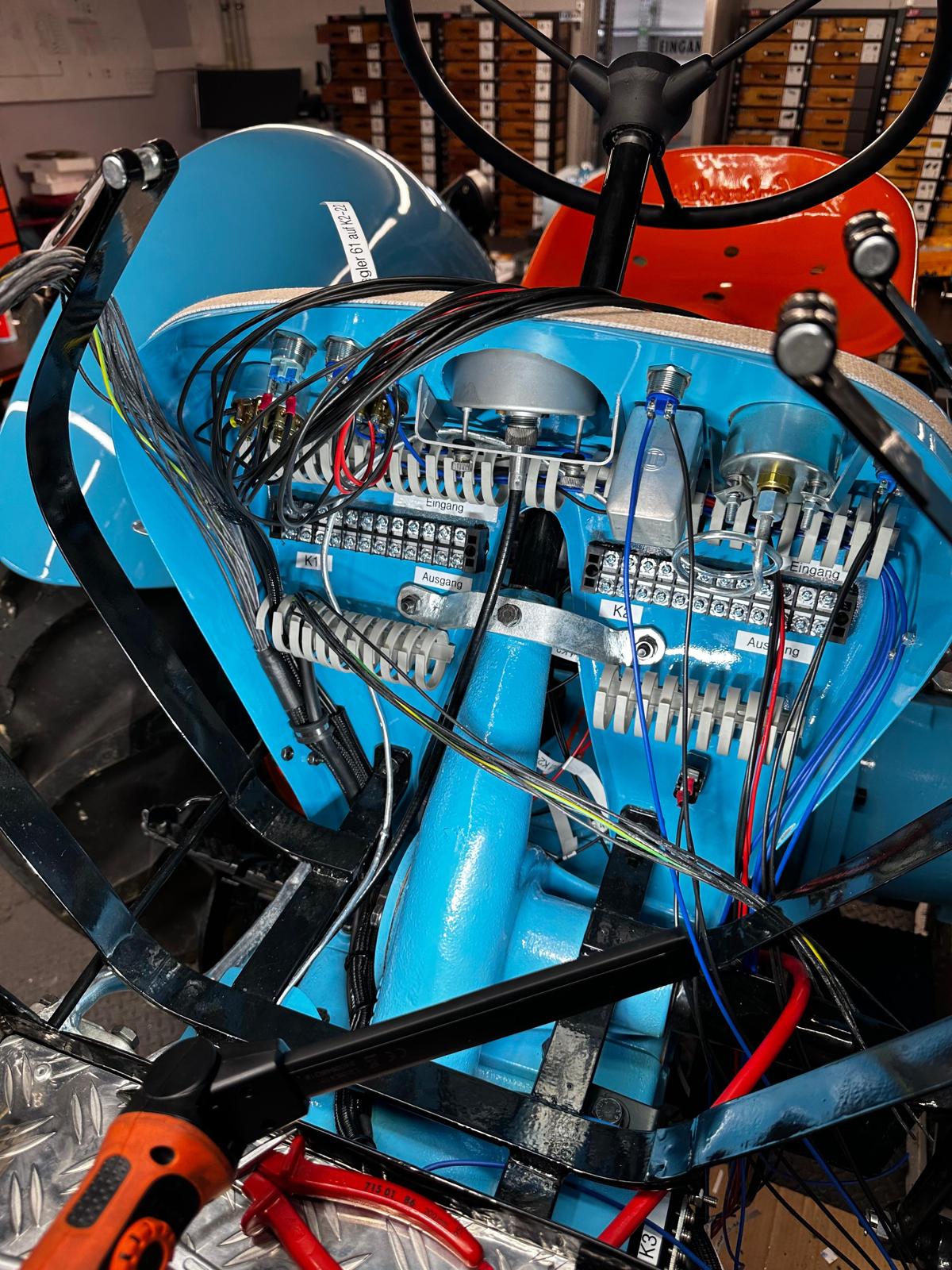 Neuaufbau mit modern dimensionierten Verteilersystemen, neu gefertigtem Kabelbaum und hochwertigen Steck-/Crimpverbindungen. Sicherungen nur, wenn historisch vorgesehen. Beleuchtung/Signale funktionssicher; Traktormeter in Originalausführung vom damaligen Originalhersteller nachproduziert.