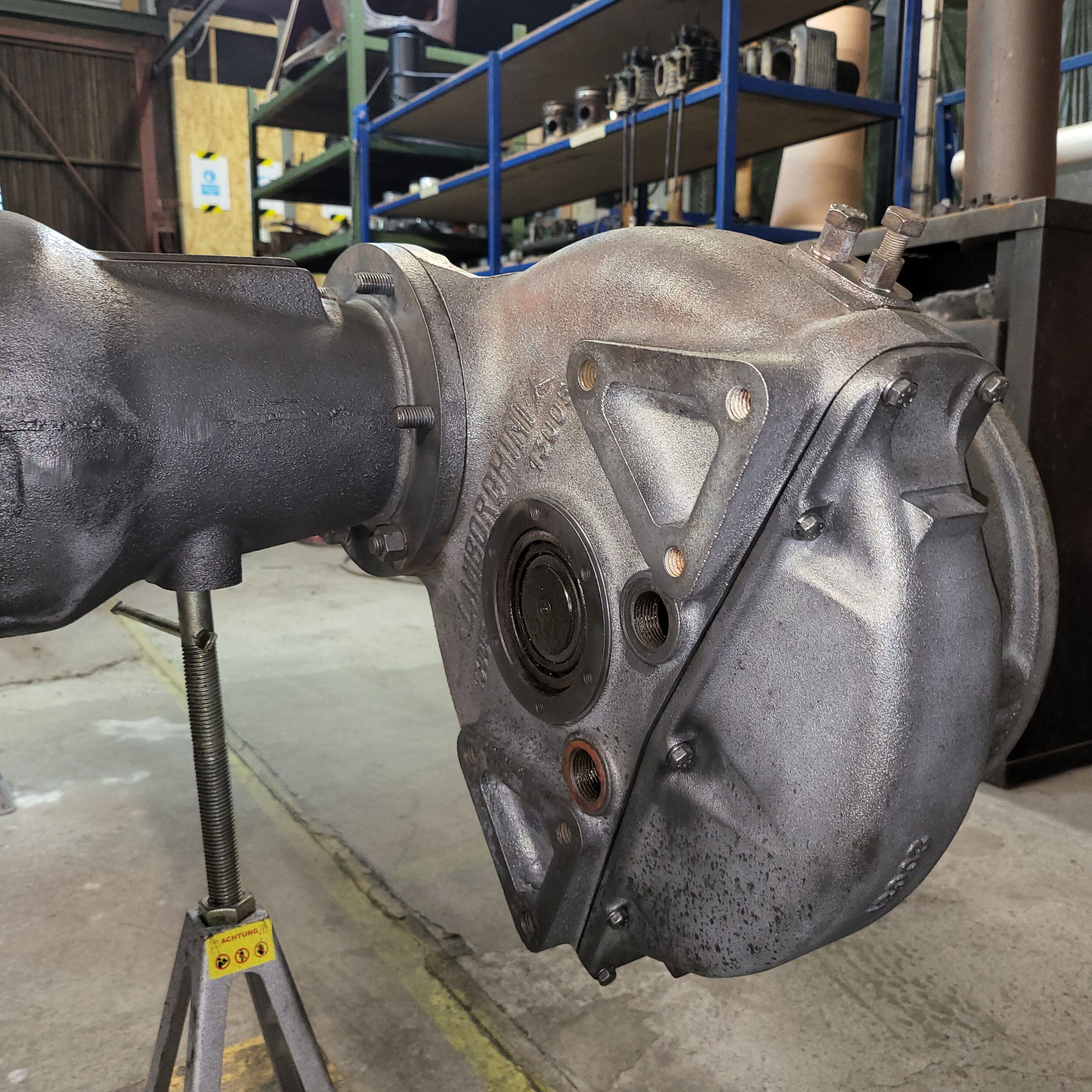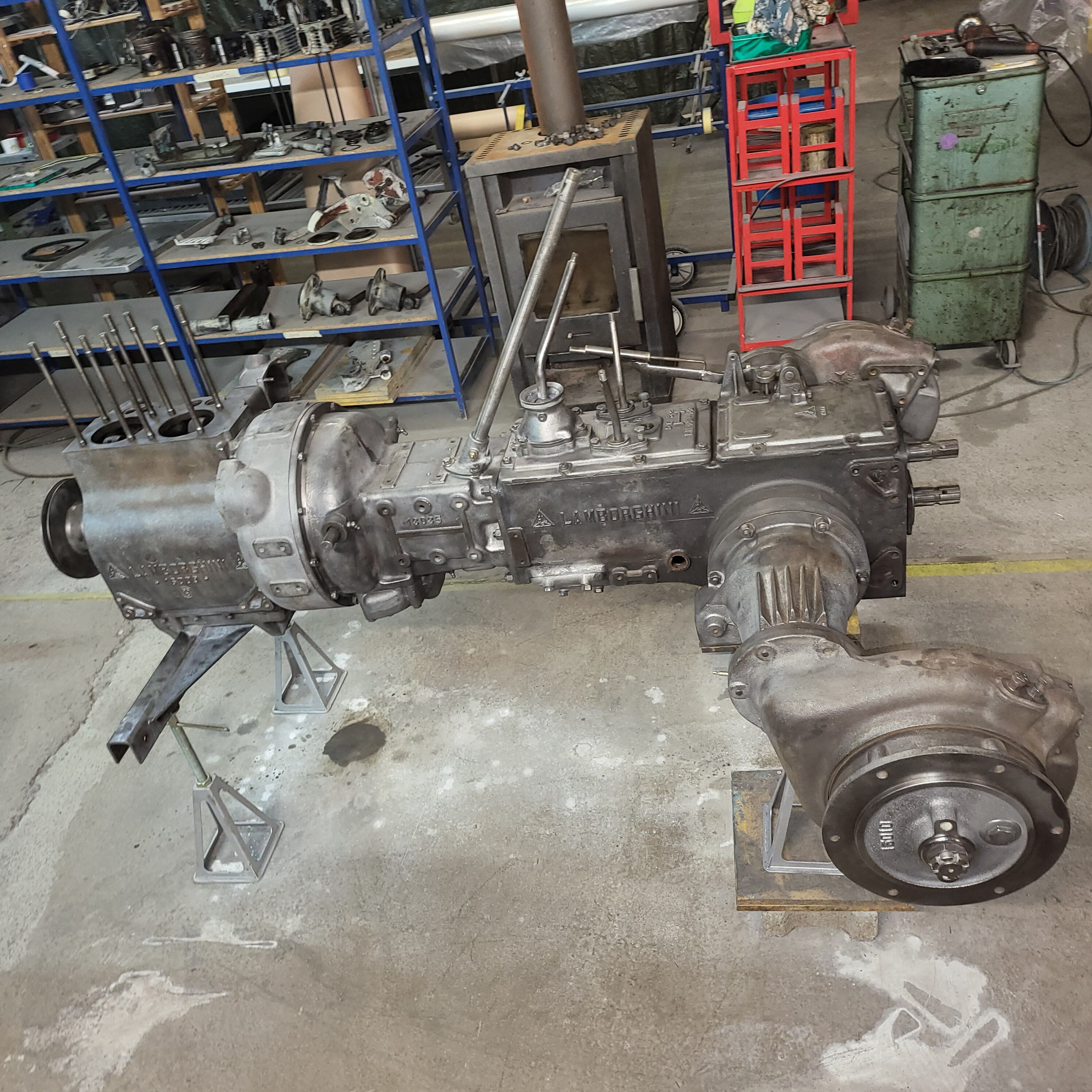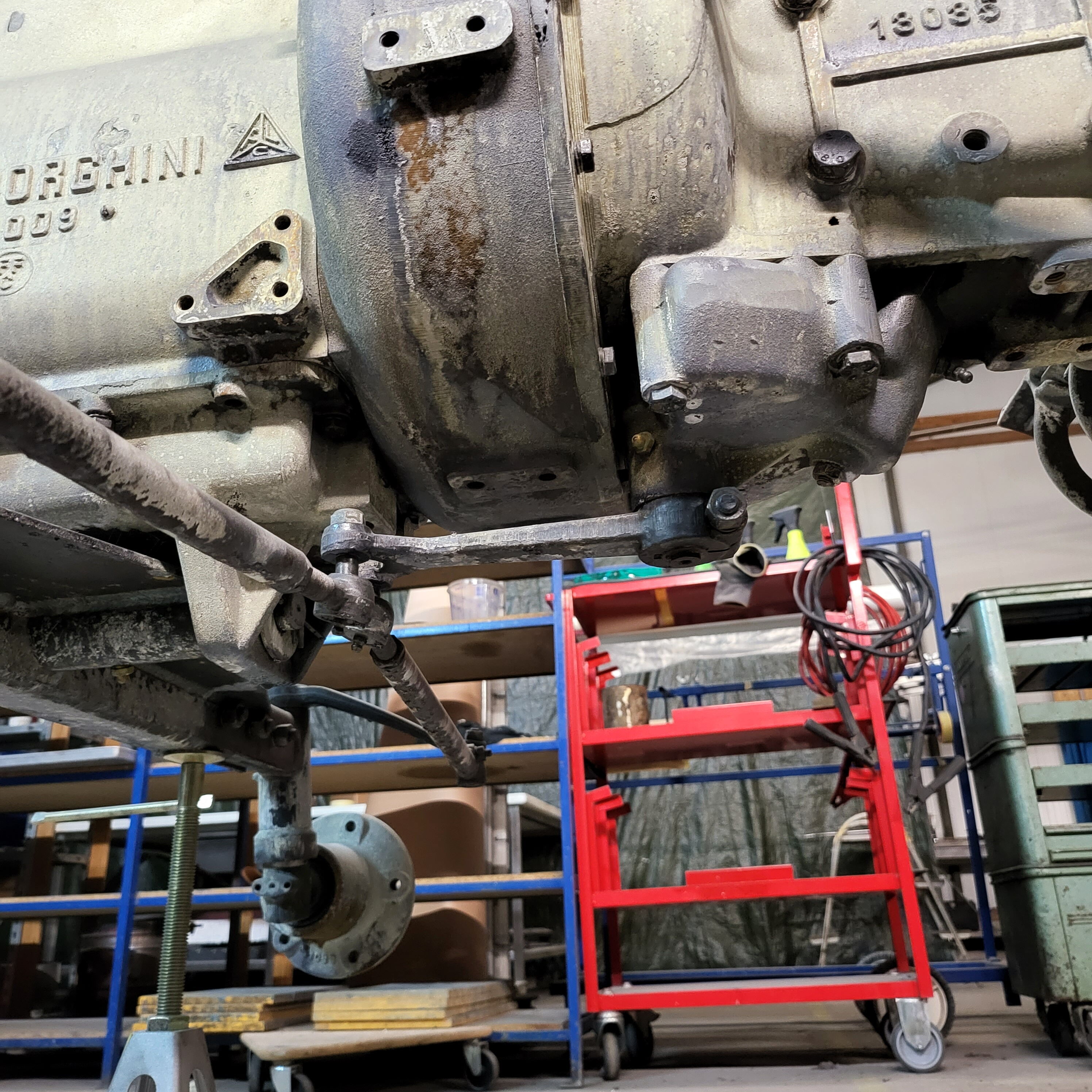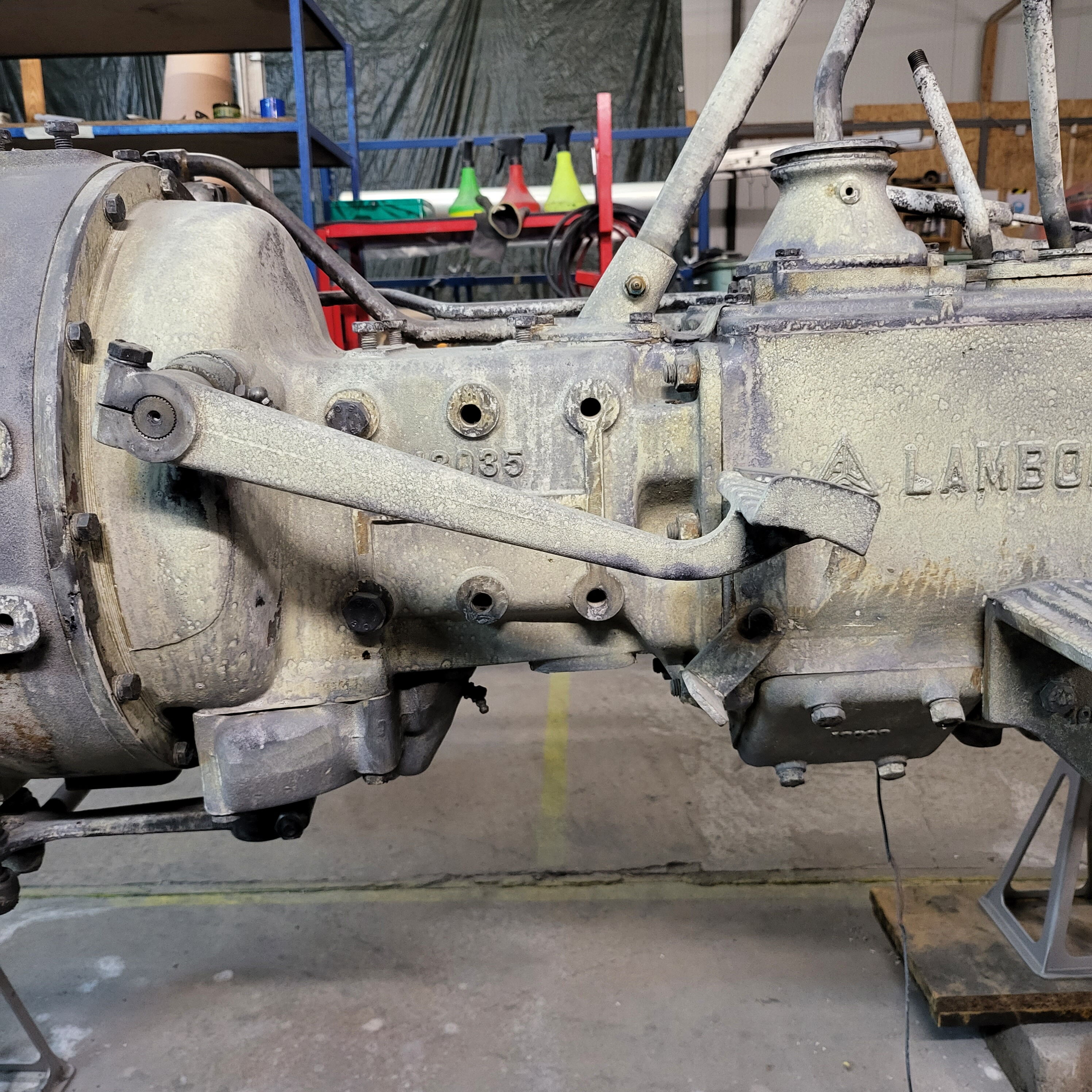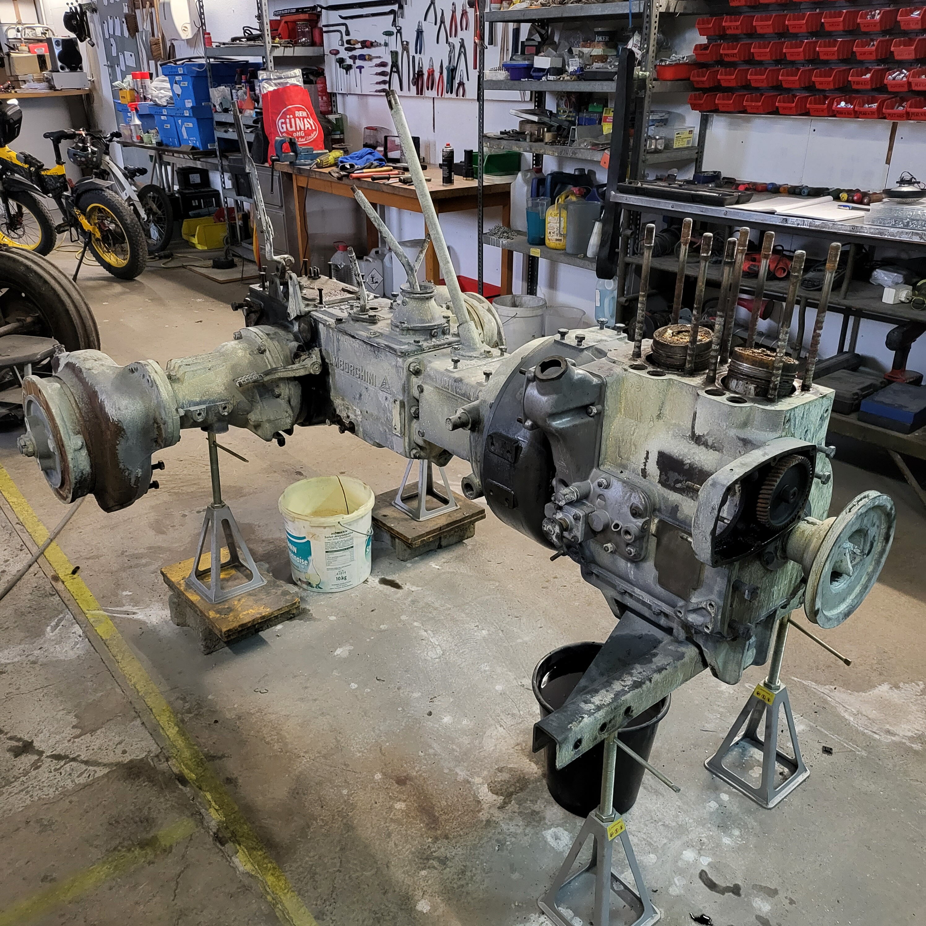 Je weiter du nach unten gehst, desto tiefer schaust du in das Herz dieser Lamborghinetta: Bremstrommeln geöffnet, Getriebe zerlegt, Motor offen, Zahnräder frei, Bauteile markiert, vermessen, vorbereitet fürs nächste Leben.