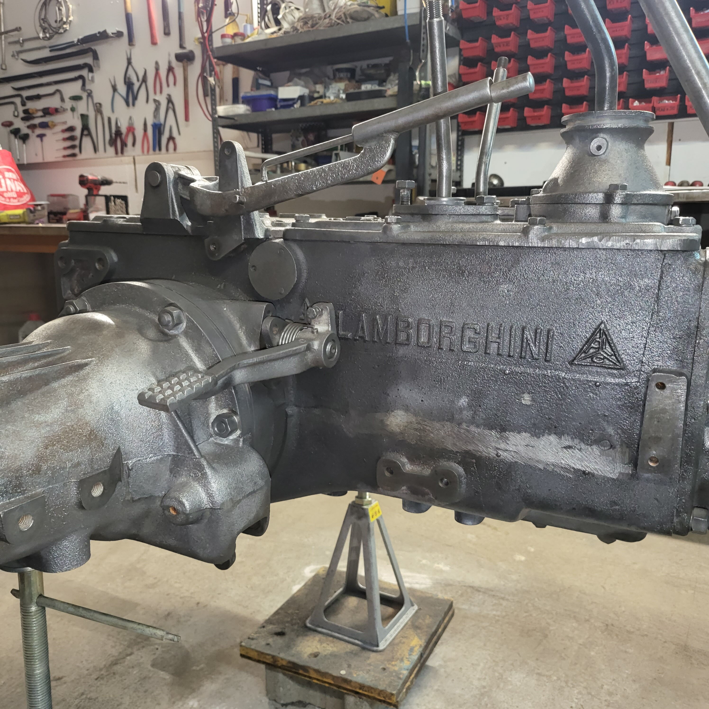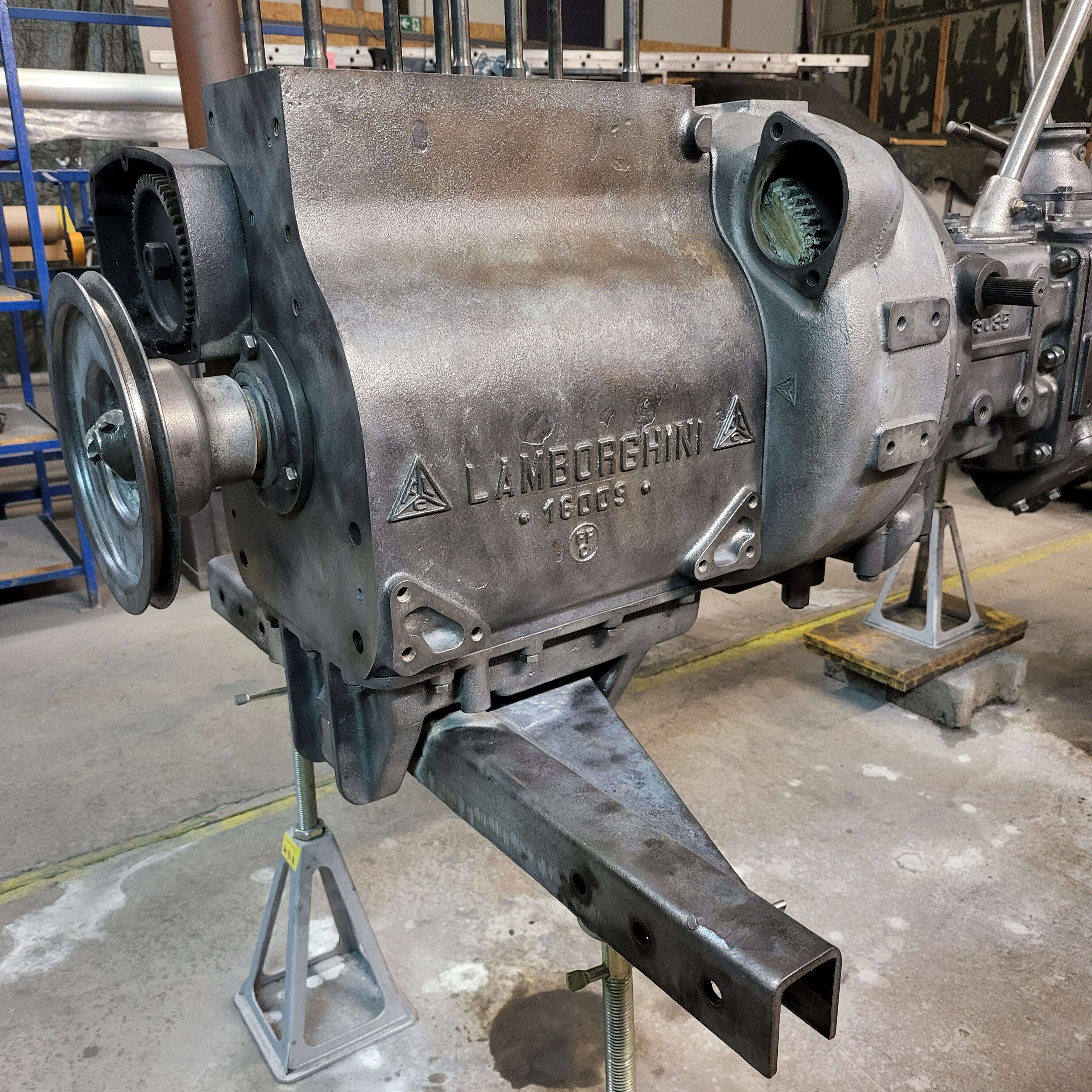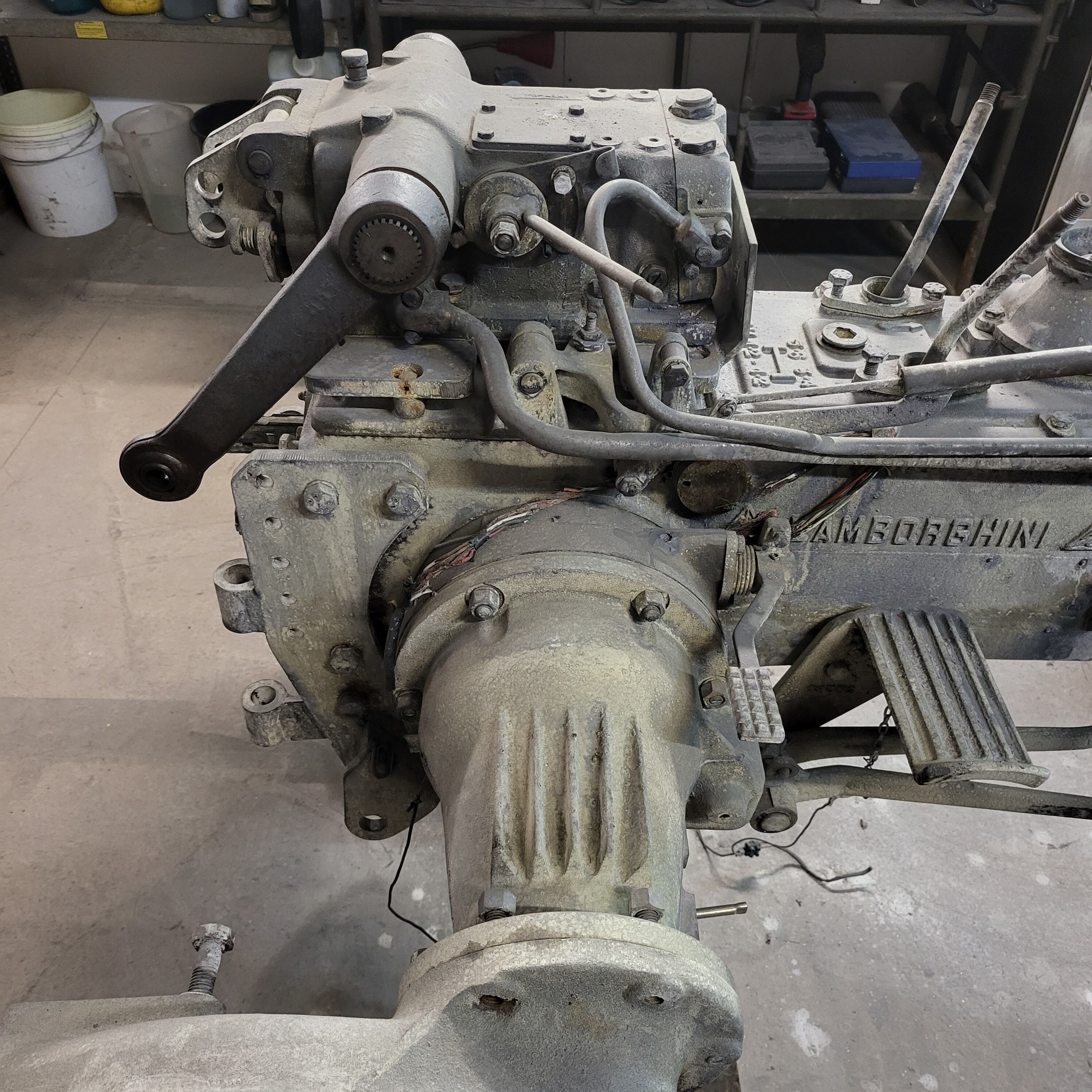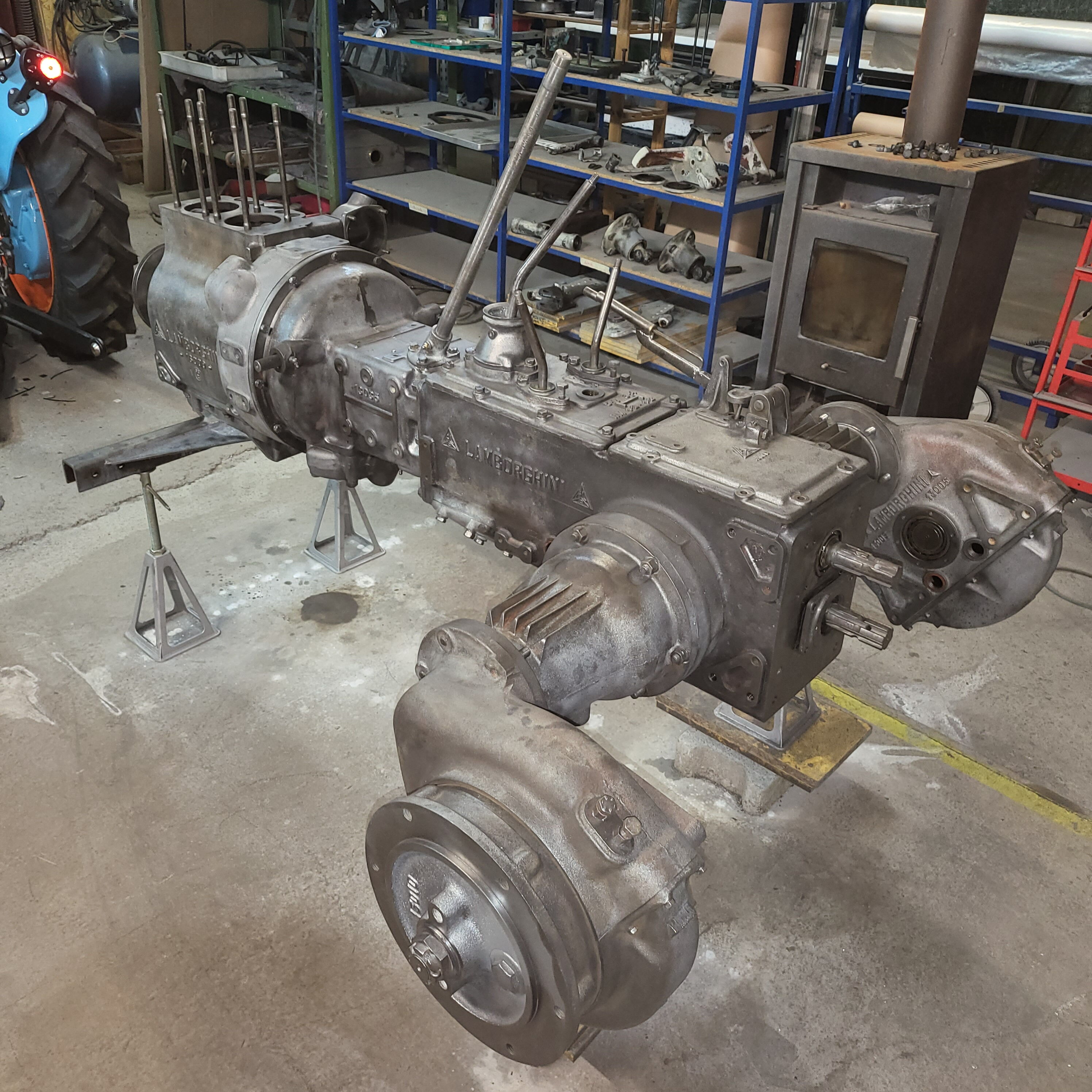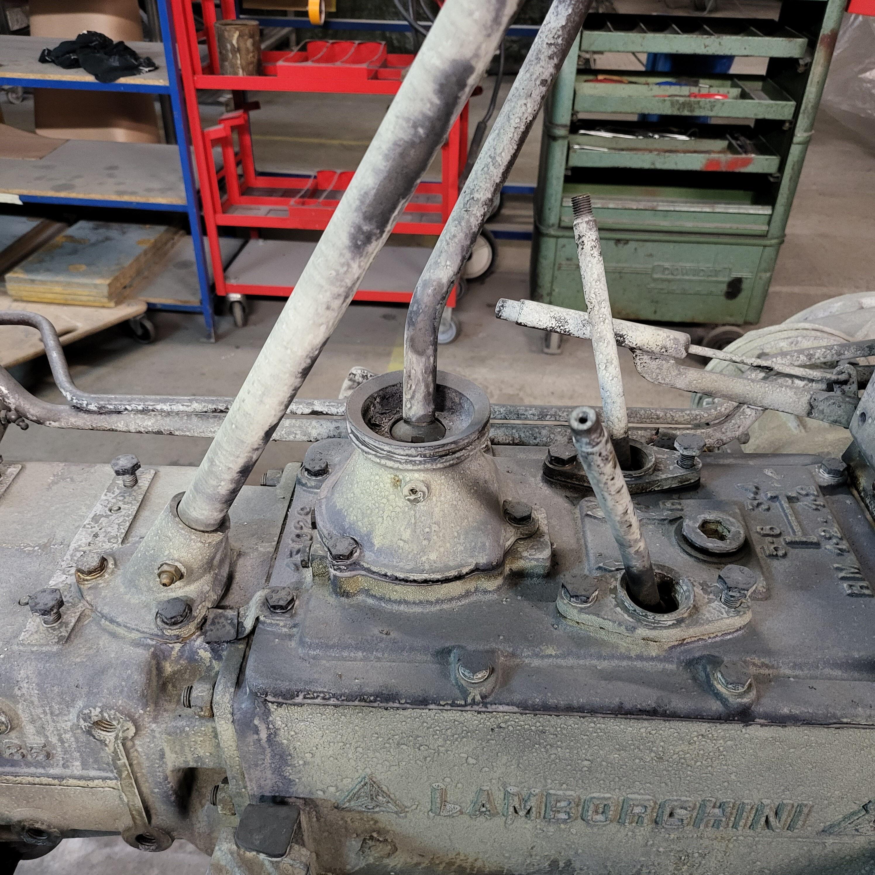 Je weiter du nach unten gehst, desto tiefer schaust du in das Herz dieser Lamborghinetta: Bremstrommeln geöffnet, Getriebe zerlegt, Motor offen, Zahnräder frei, Bauteile markiert, vermessen, vorbereitet fürs nächste Leben.