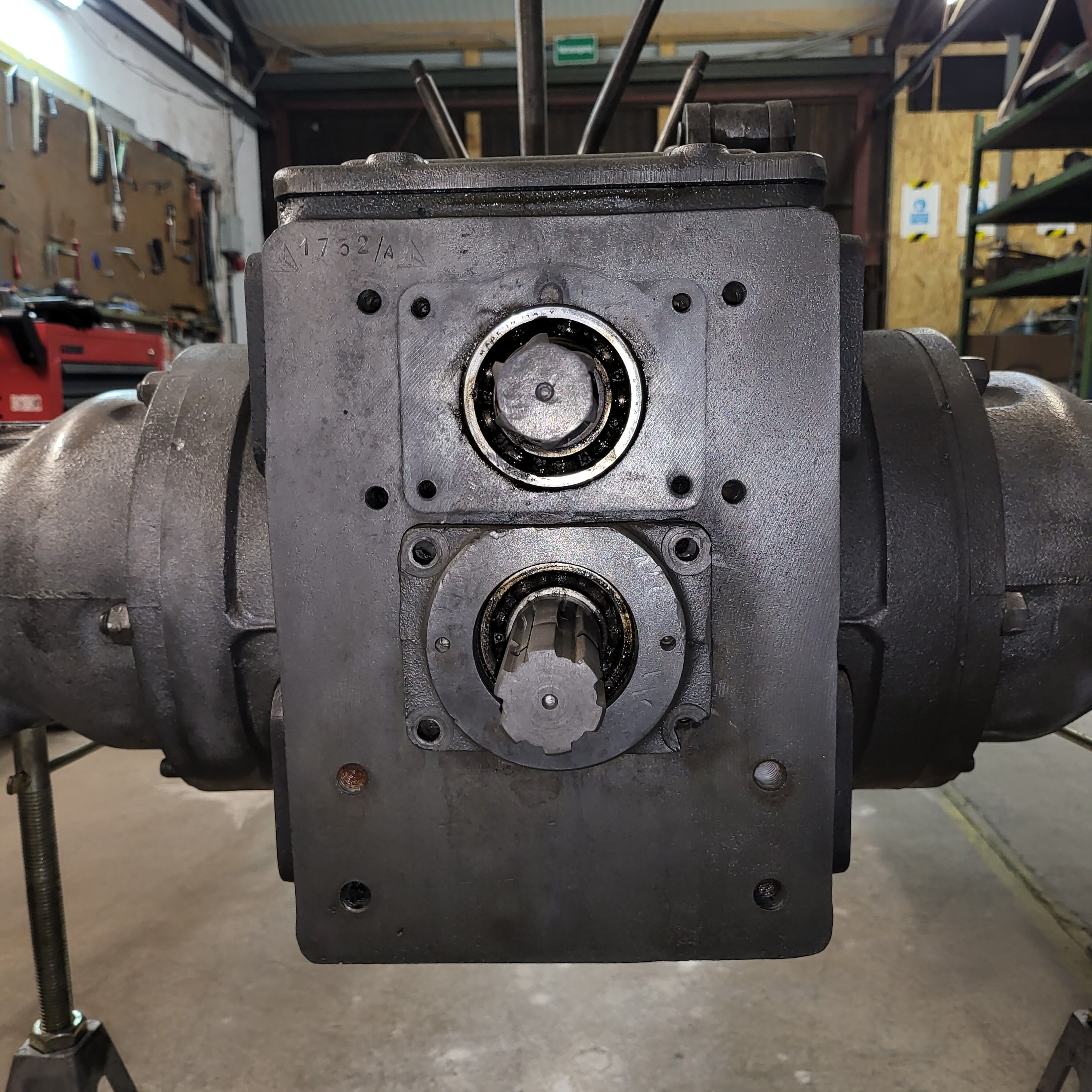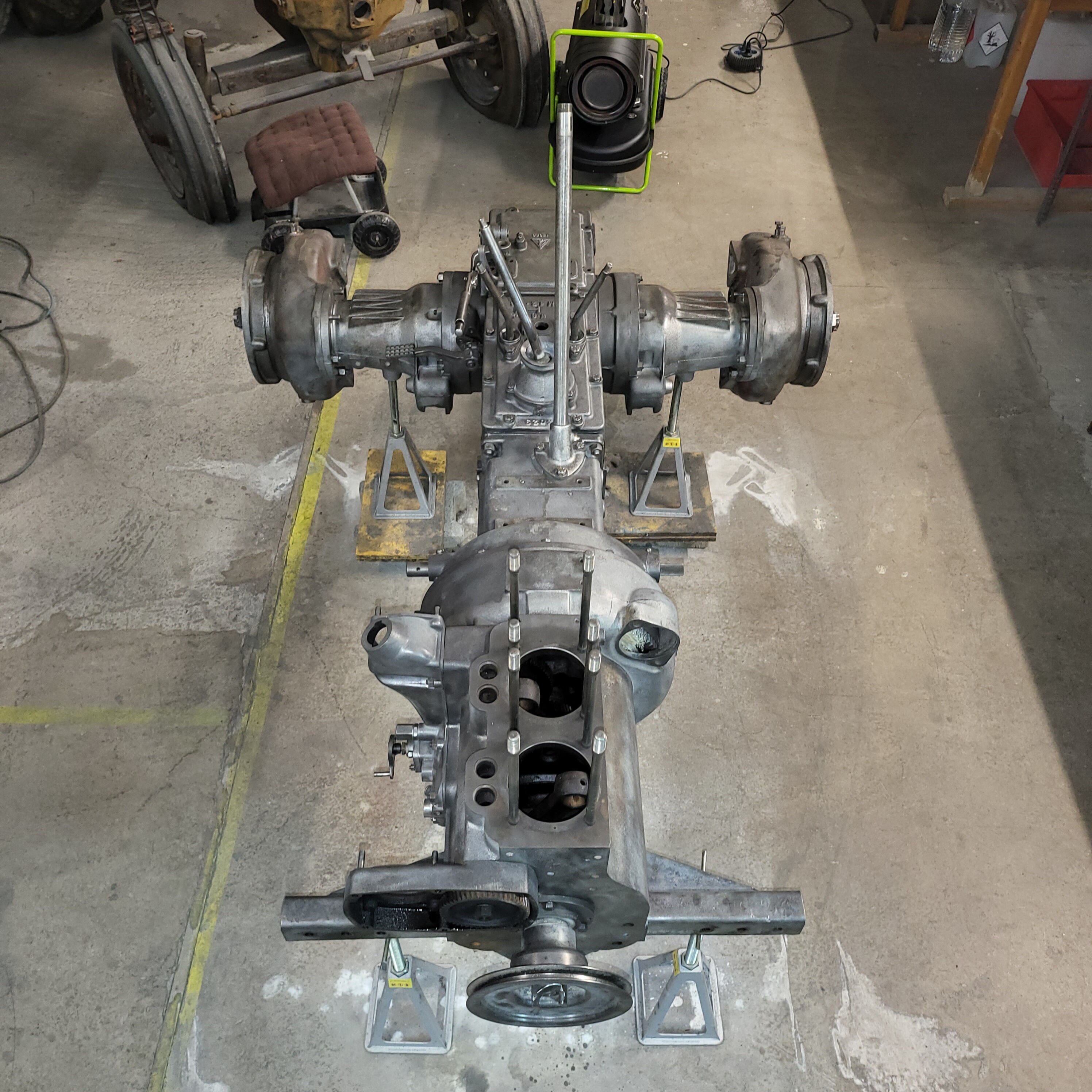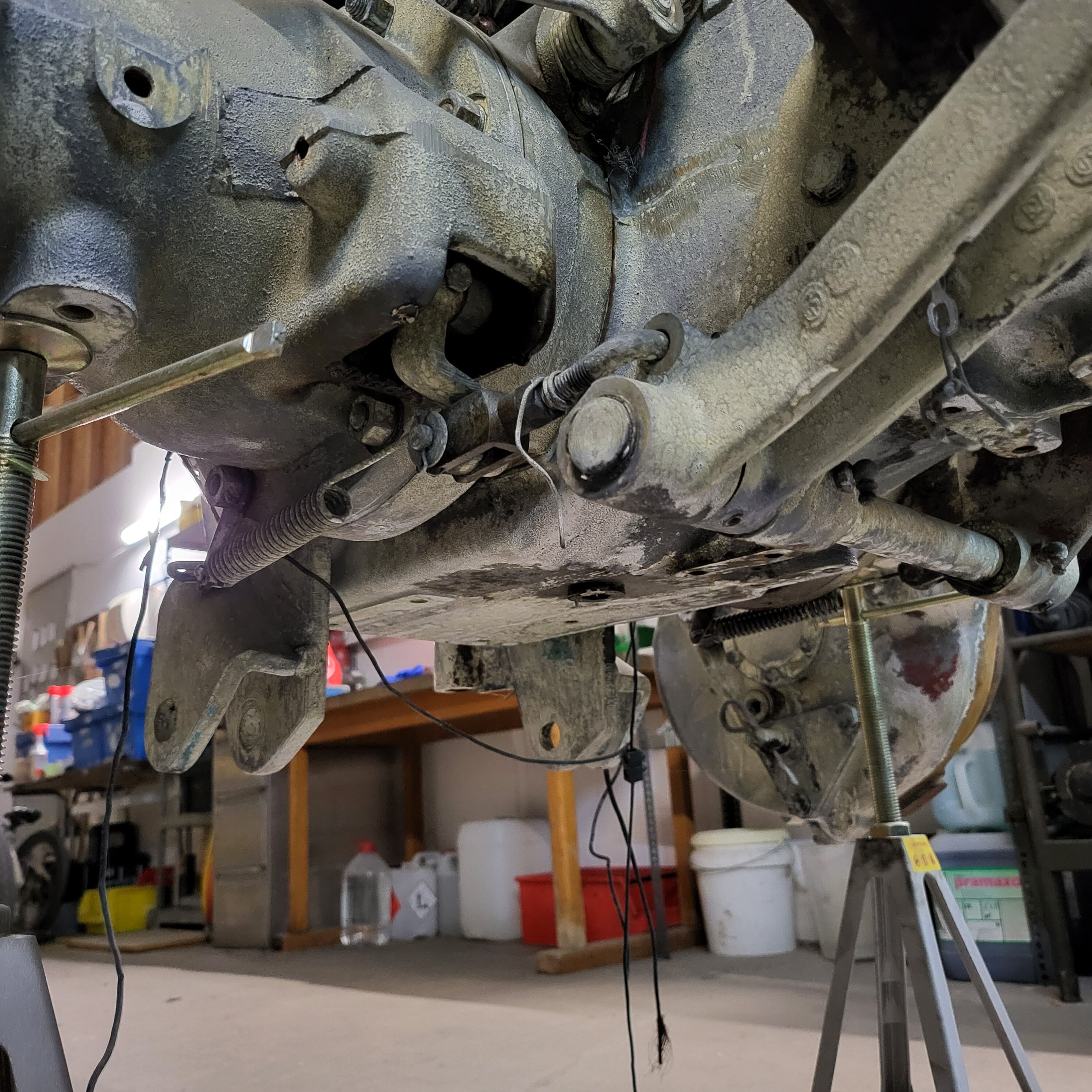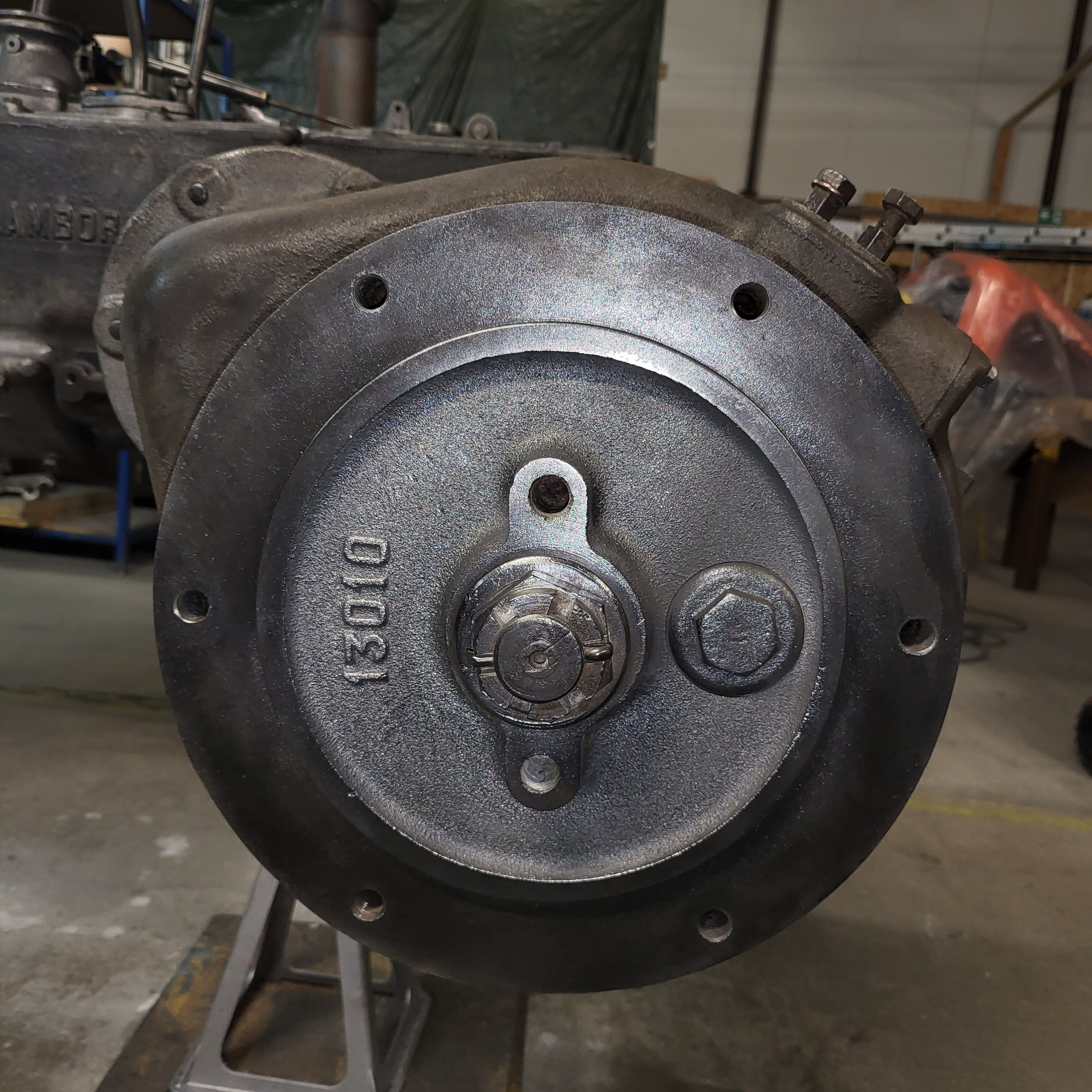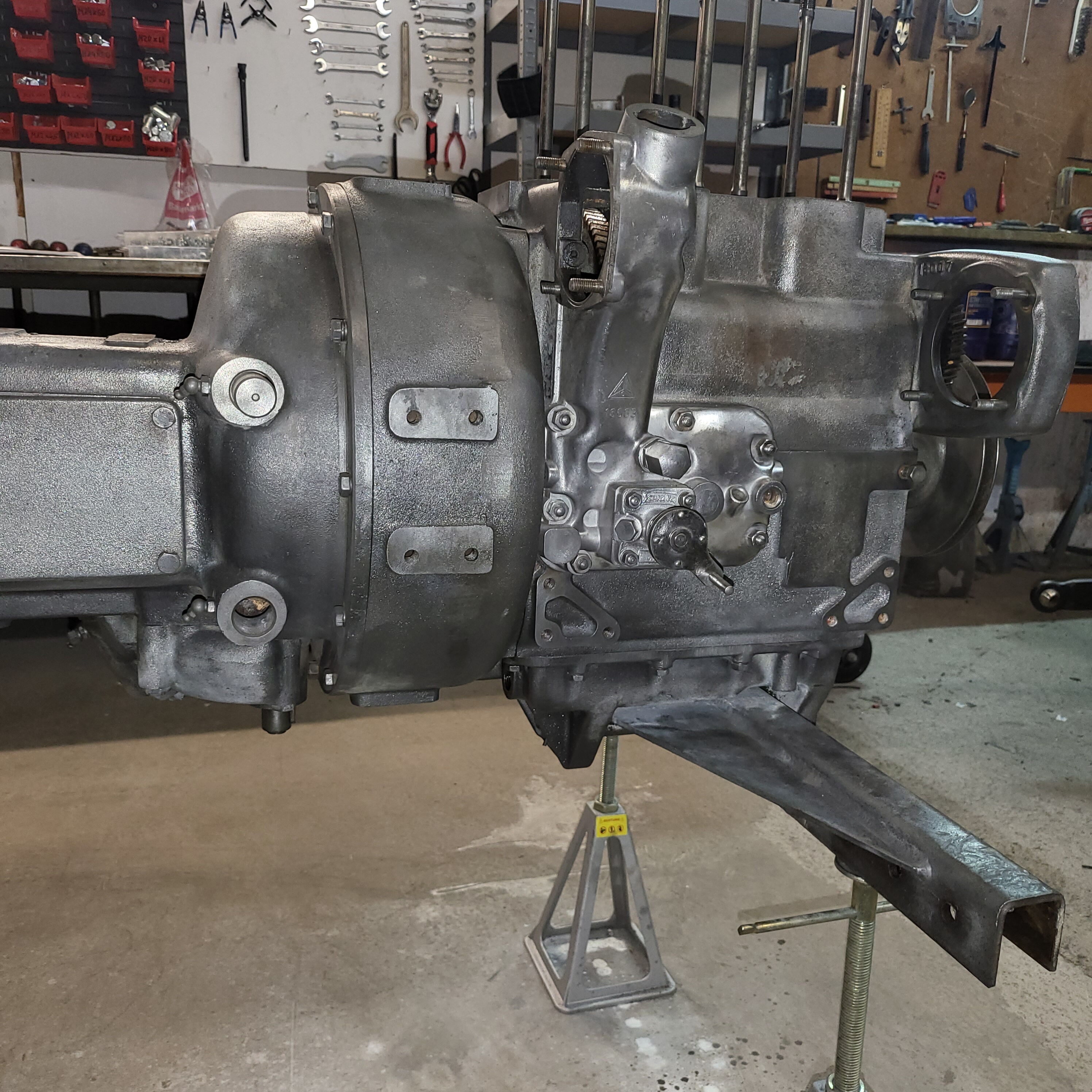 Je weiter du nach unten gehst, desto tiefer schaust du in das Herz dieser Lamborghinetta: Bremstrommeln geöffnet, Getriebe zerlegt, Motor offen, Zahnräder frei, Bauteile markiert, vermessen, vorbereitet fürs nächste Leben.