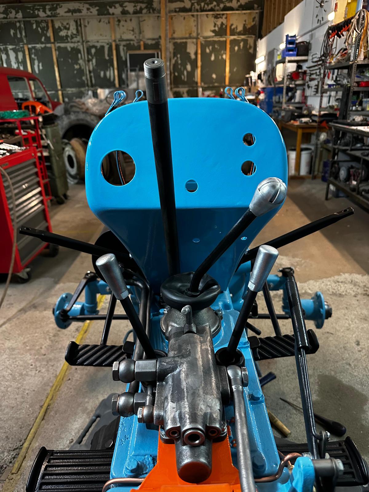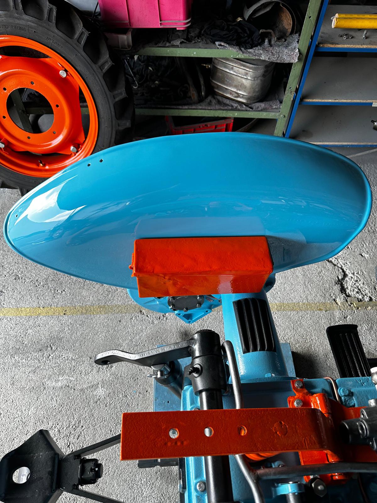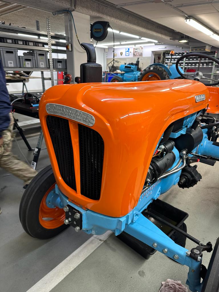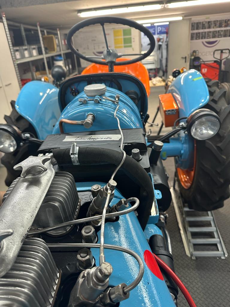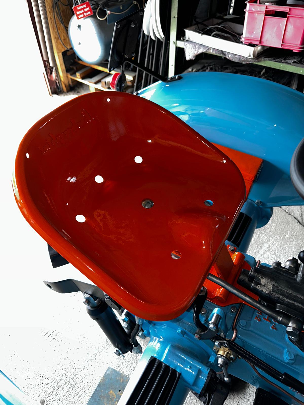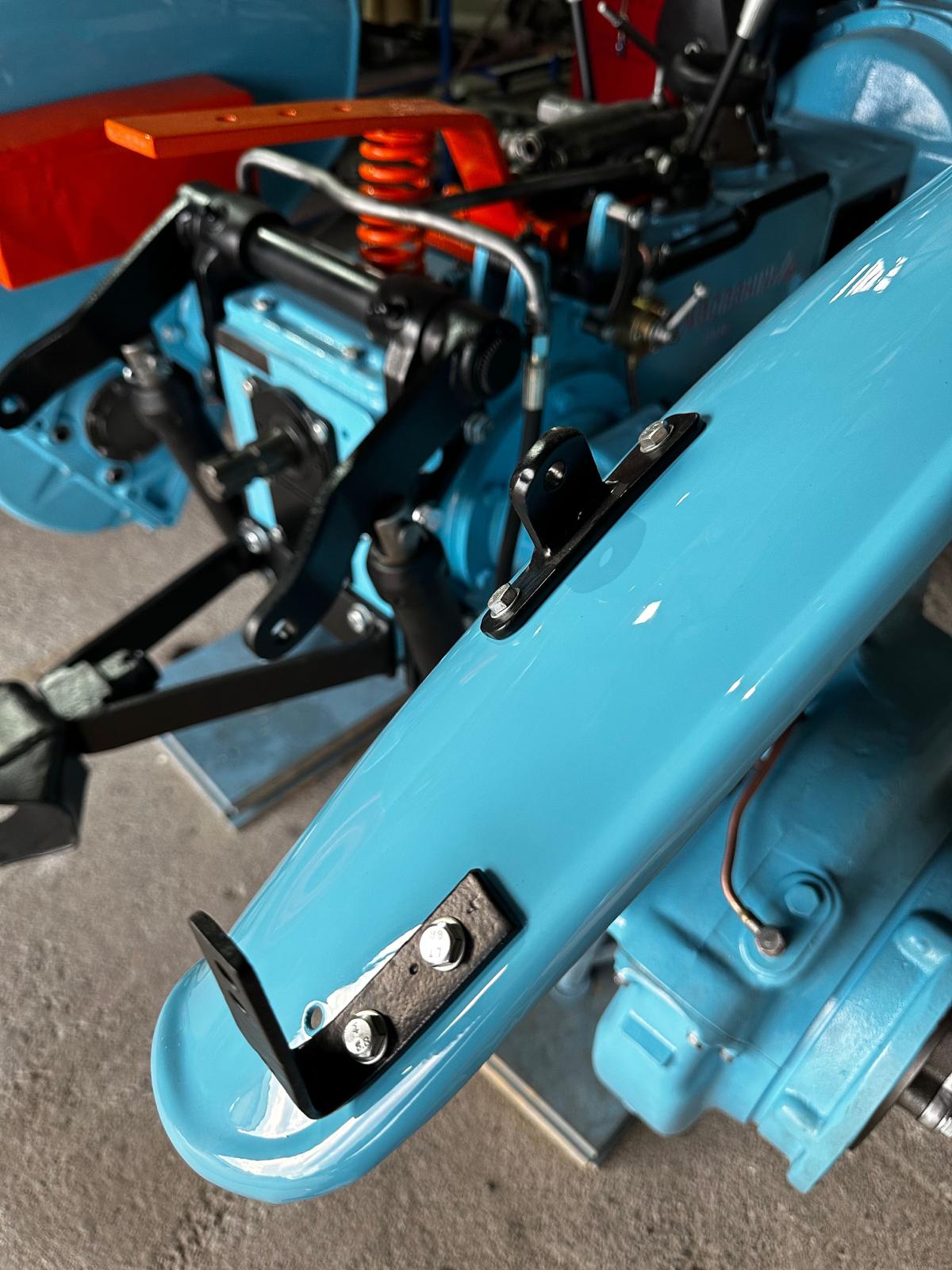 Was hier glänzt, ist Substanz. Das historische Azzurro (Azurblau) mit Arancio (Orange) ist kein Styling, sondern eine Hommage an die Werksfarben der Traktoren – präzise abgemischt, auf eine Technik gelegt, die wir Schraube für Schraube neu aufgebaut haben. Jeder Radius, jede Fase, jede Schelle folgt einer Logik: Vollzerlegung, Maßhaltigkeit, Funktionssicherheit.