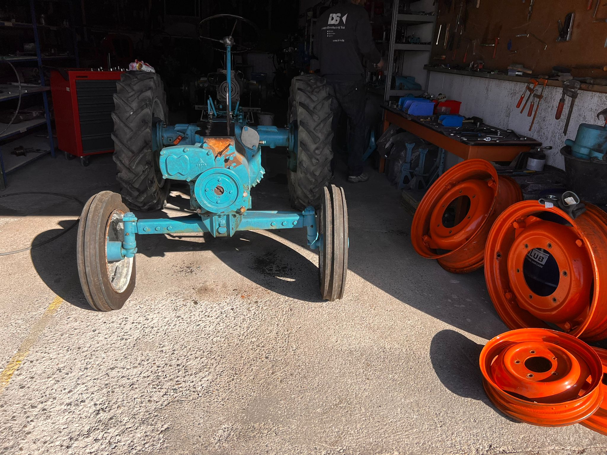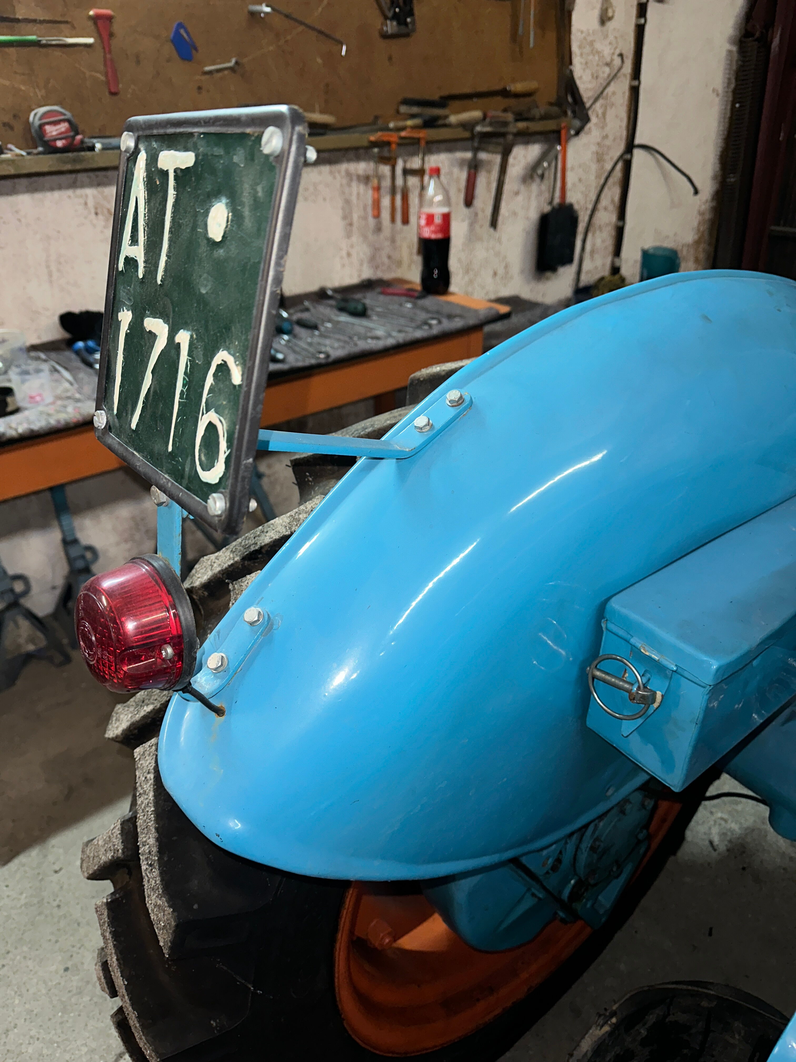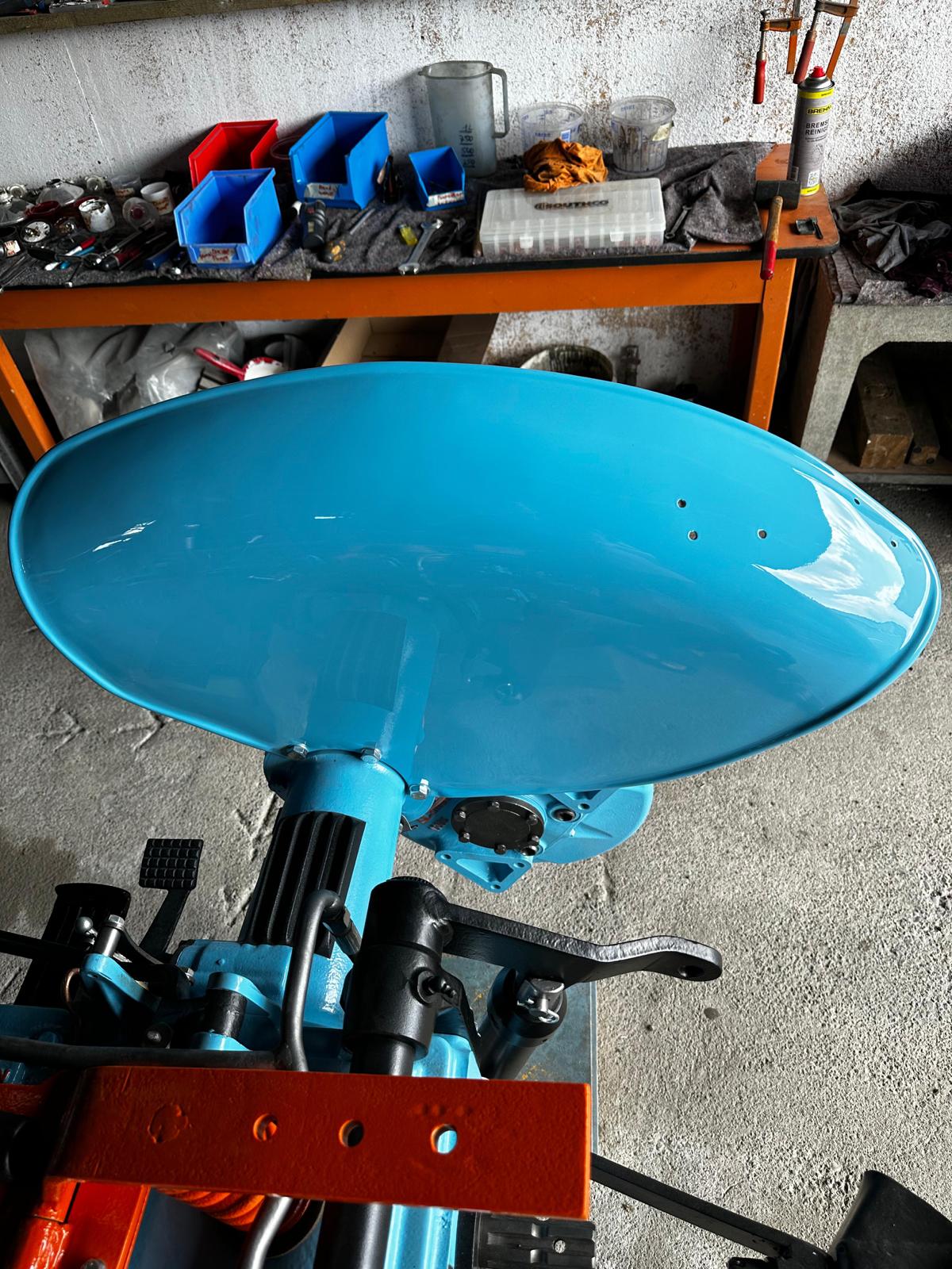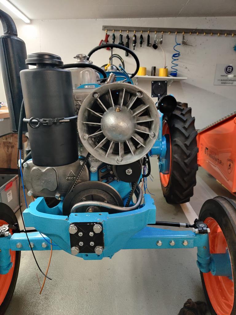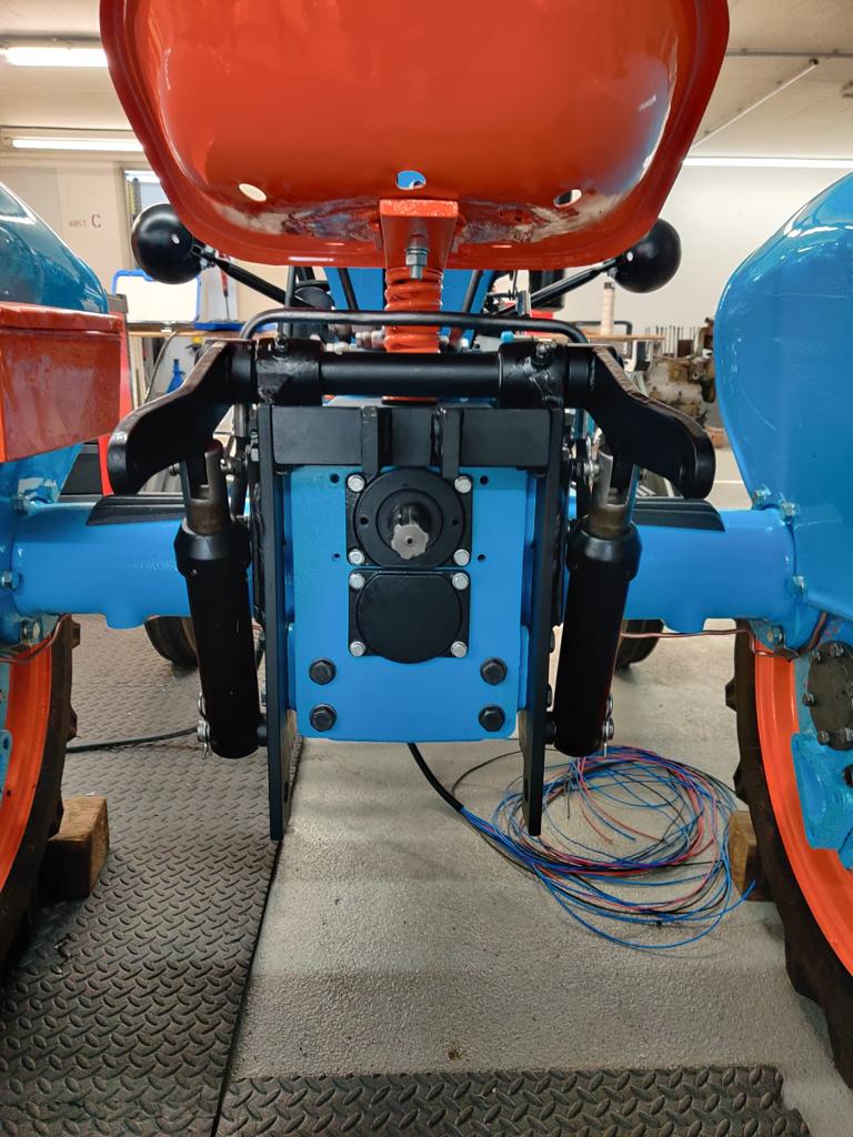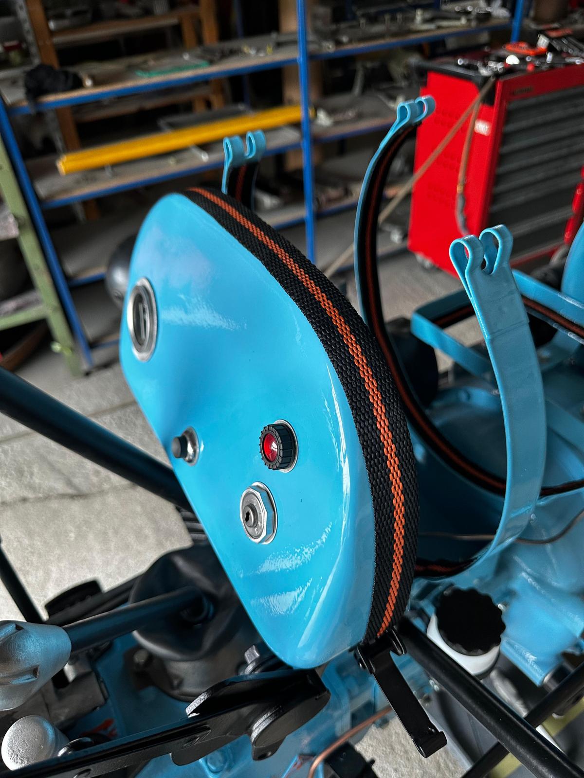Was hier glänzt, ist Substanz. Das historische Azzurro (Azurblau) mit Arancio (Orange) ist kein Styling, sondern eine Hommage an die Werksfarben der Traktoren – präzise abgemischt, auf eine Technik gelegt, die wir Schraube für Schraube neu aufgebaut haben. Jeder Radius, jede Fase, jede Schelle folgt einer Logik: Vollzerlegung, Maßhaltigkeit, Funktionssicherheit.