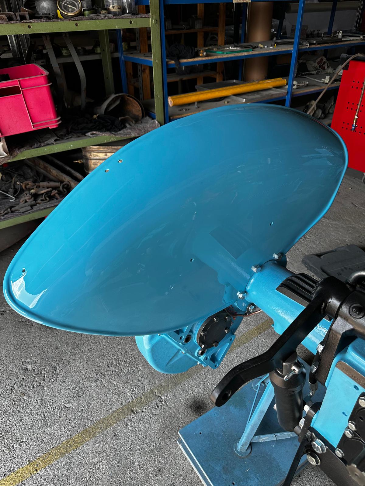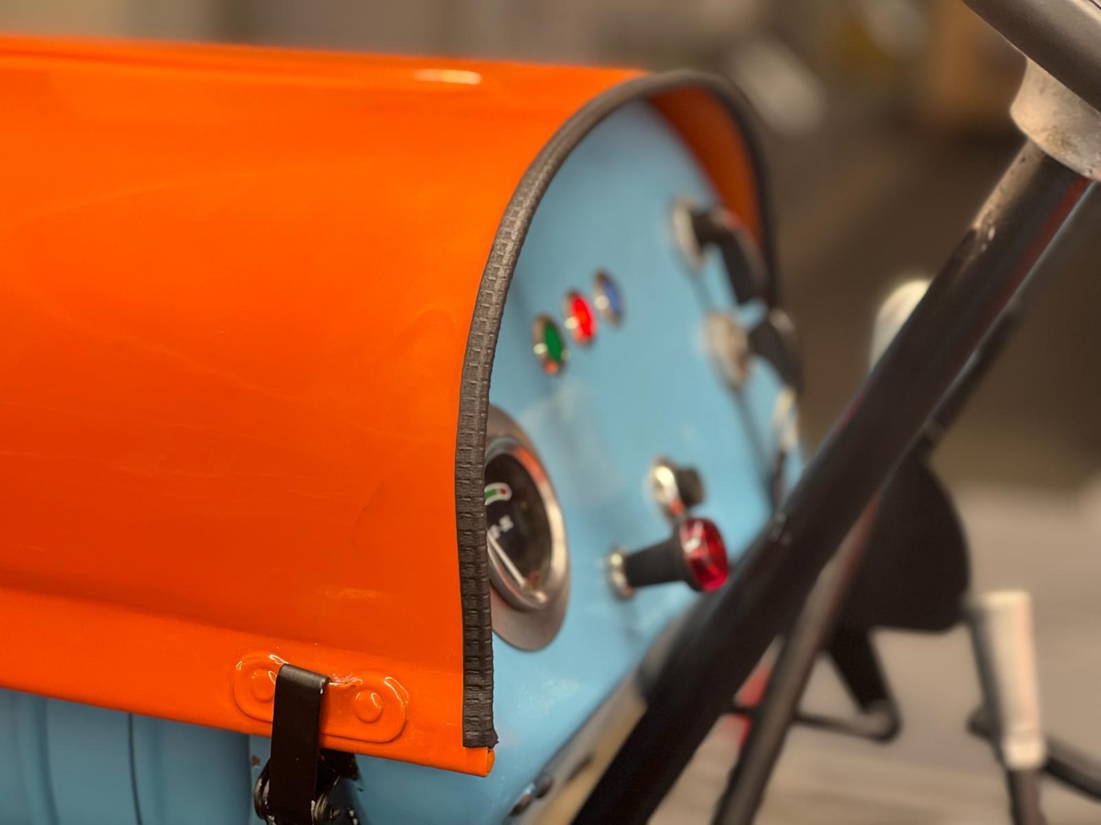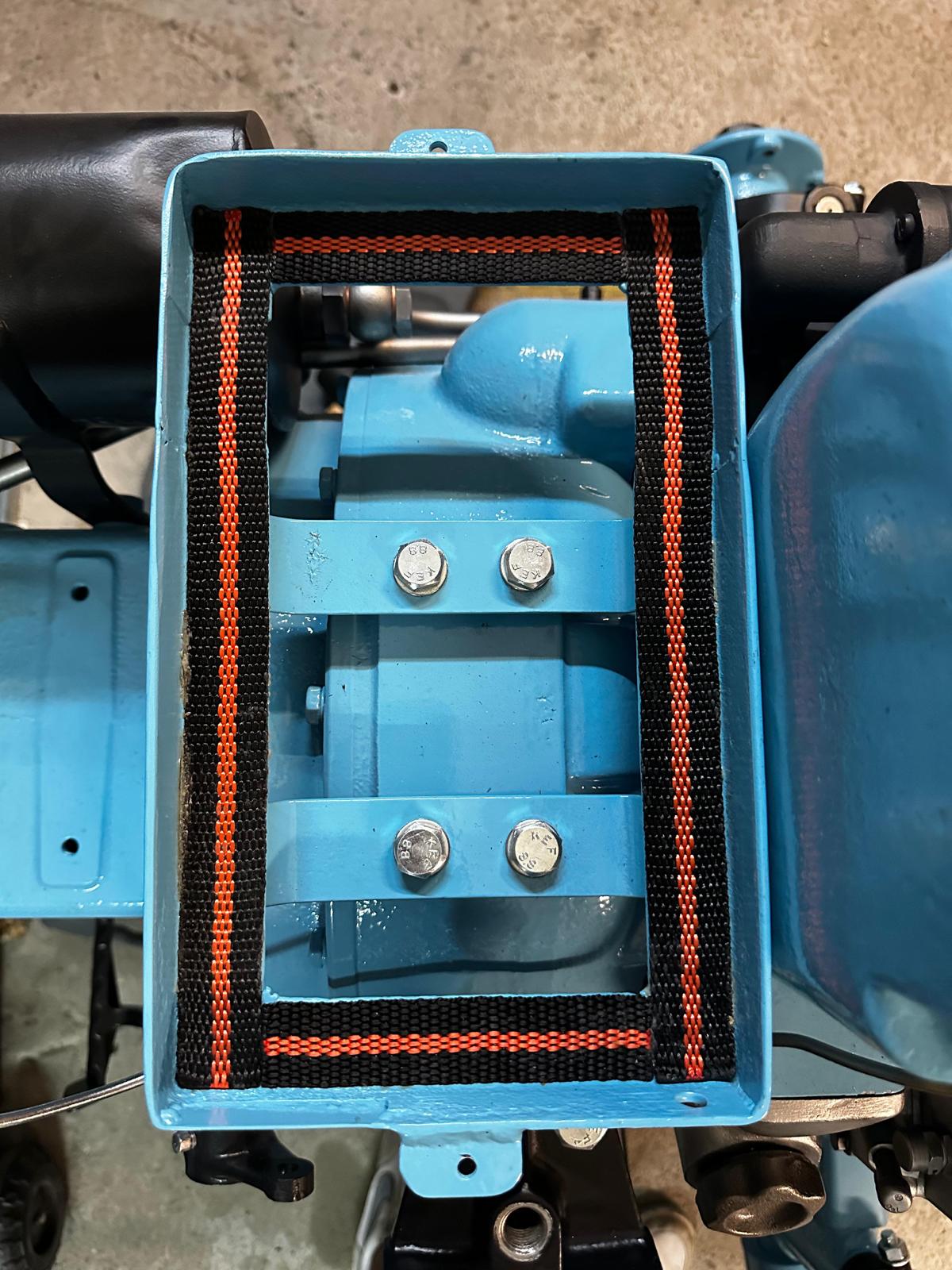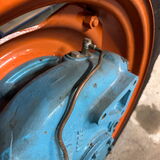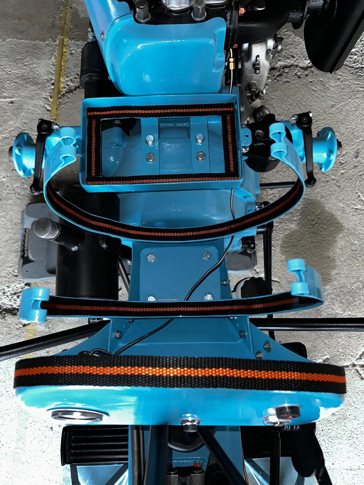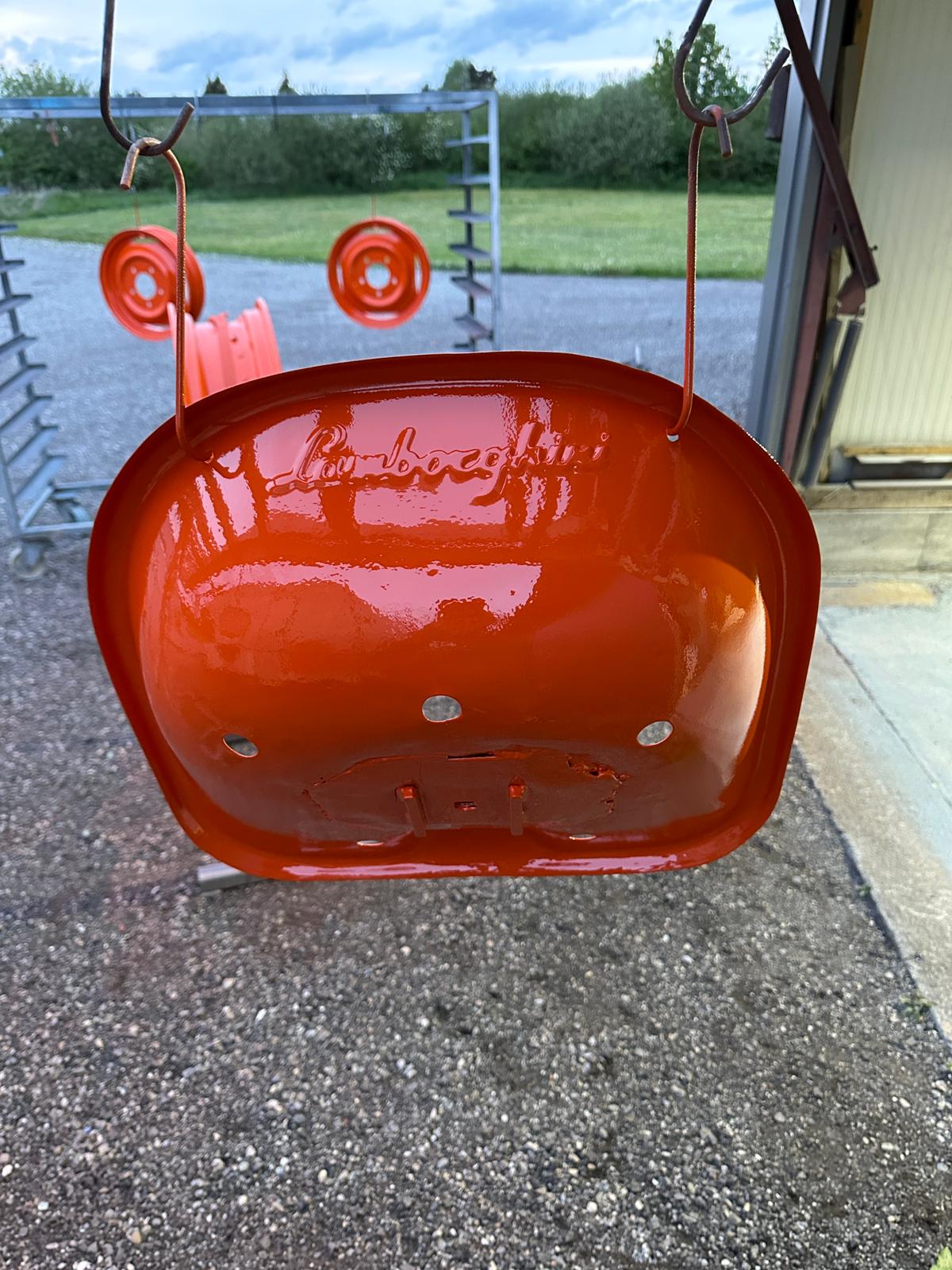 Was hier glänzt, ist Substanz. Das historische Azzurro (Azurblau) mit Arancio (Orange) ist kein Styling, sondern eine Hommage an die Werksfarben der Traktoren – präzise abgemischt, auf eine Technik gelegt, die wir Schraube für Schraube neu aufgebaut haben. Jeder Radius, jede Fase, jede Schelle folgt einer Logik: Vollzerlegung, Maßhaltigkeit, Funktionssicherheit.