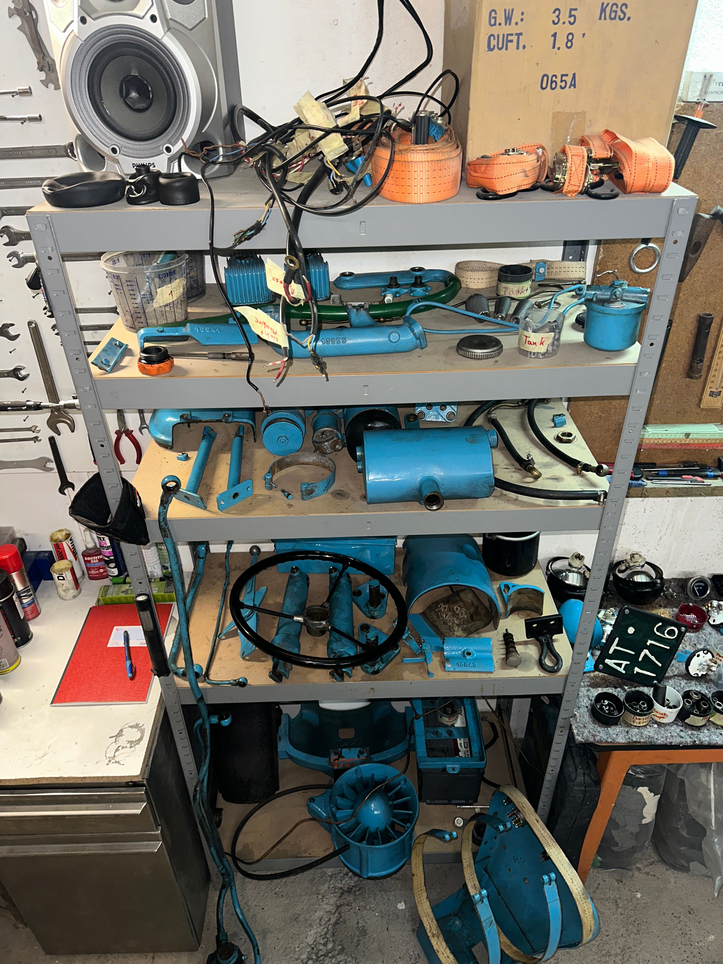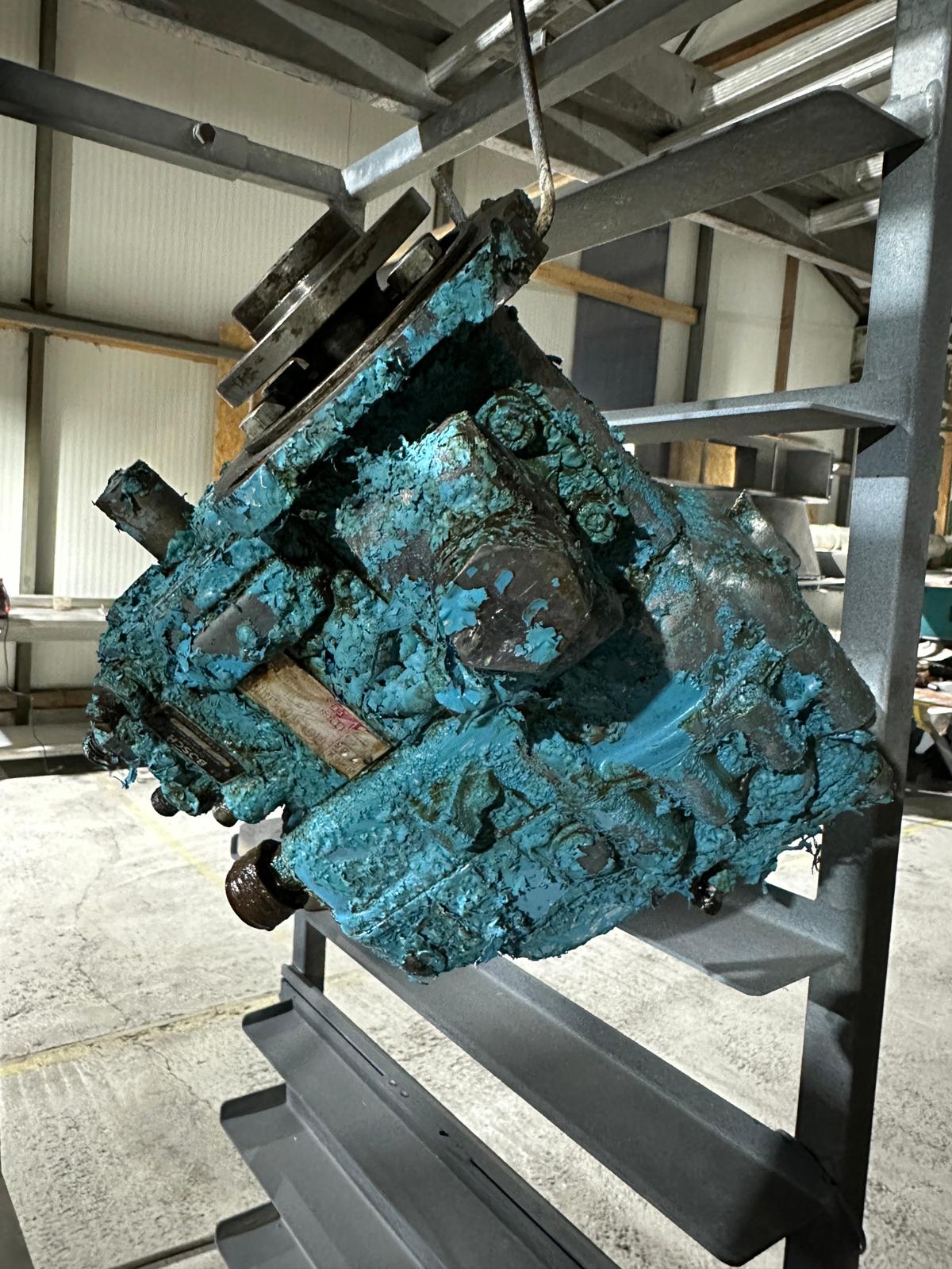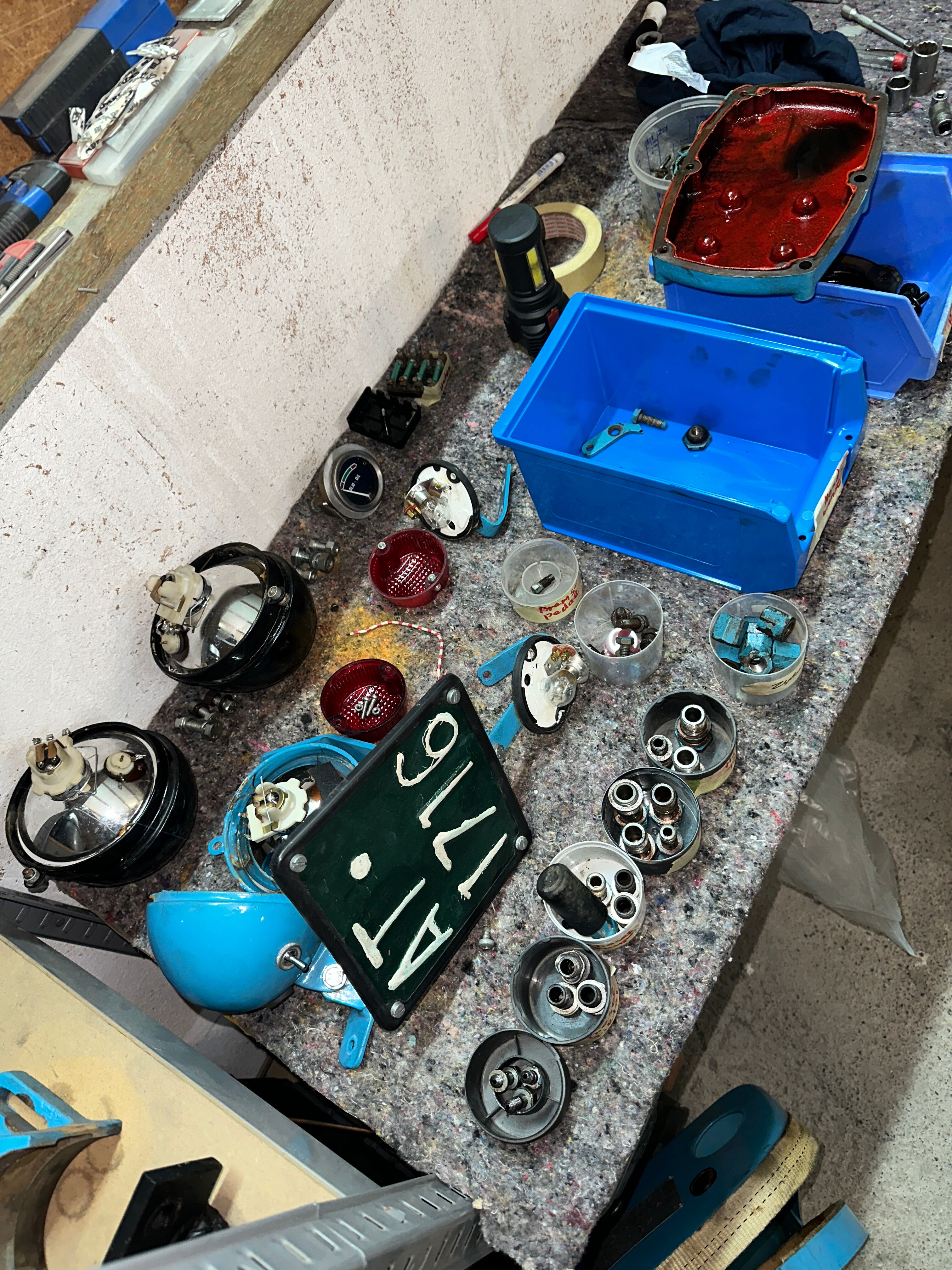 Fotodokumentation des unrestaurierten Zustands vom 06.11.2022: ehrliche Patina, lokale Korrosionszonen, vollständige Hauptbaugruppen. Dieser Erstzustand definierte, was erhalten, aufgearbeitet oder ersetzt wird. Die transparente Befundlage erhöht Nachvollziehbarkeit und Vertrauen – ein direkter Werttreiber.