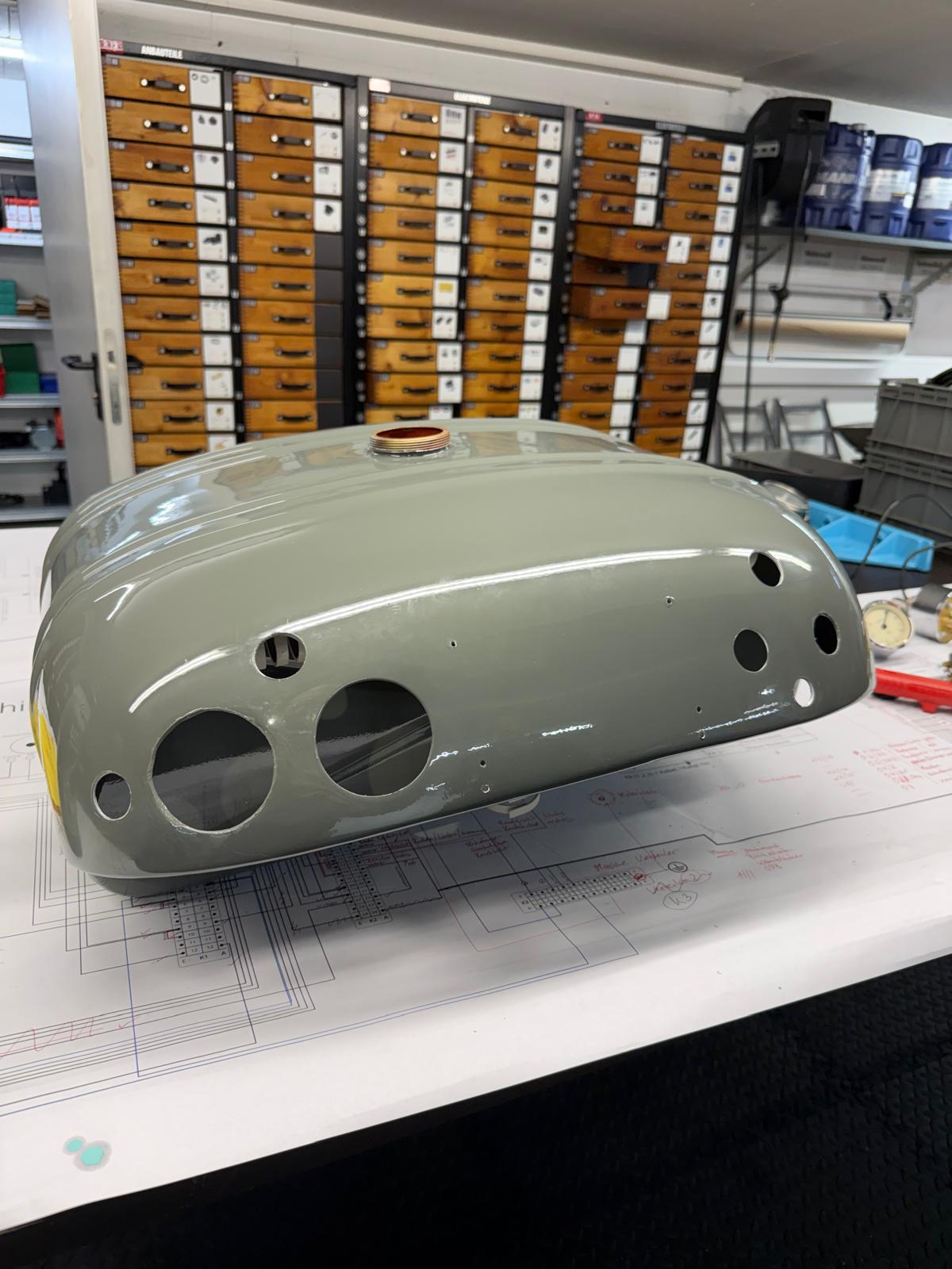 Professionelle Pulverbeschichtung vieler Bauteile; bewegliche Komponenten überwiegend schwarz pulverbeschichtet. Felgen mit Hochglanz-Pulverbeschichtung (Show-Quality-Finish). Sichtteile in periodenkorrekten Farbtönen lackiert. Umfassender Korrosionsschutz innen/außen.